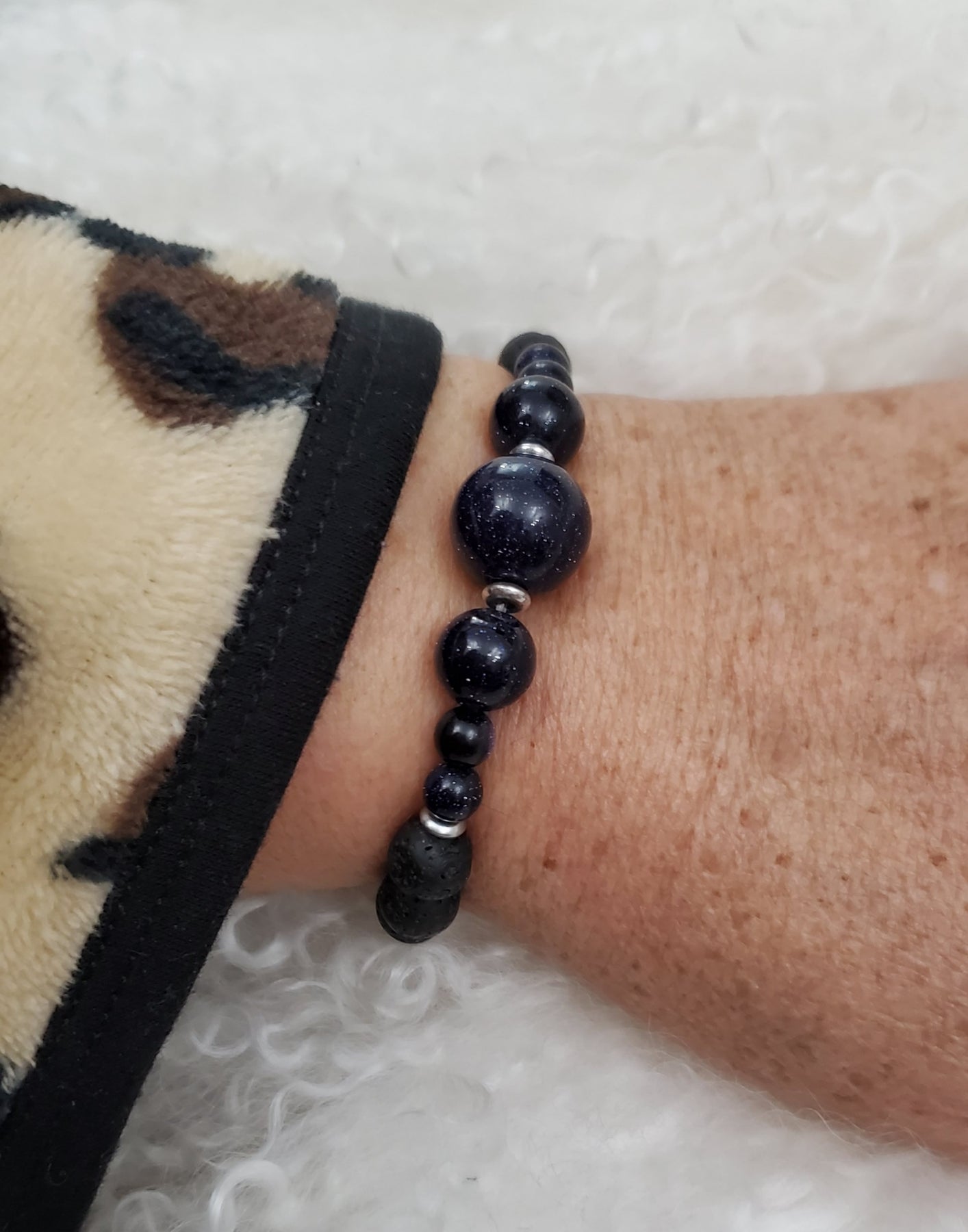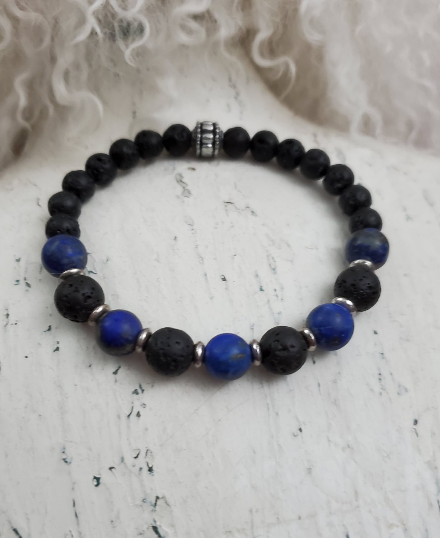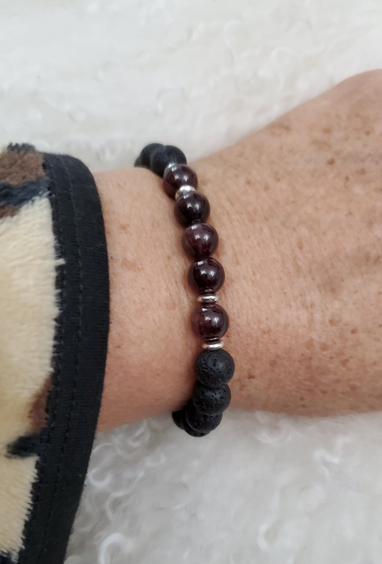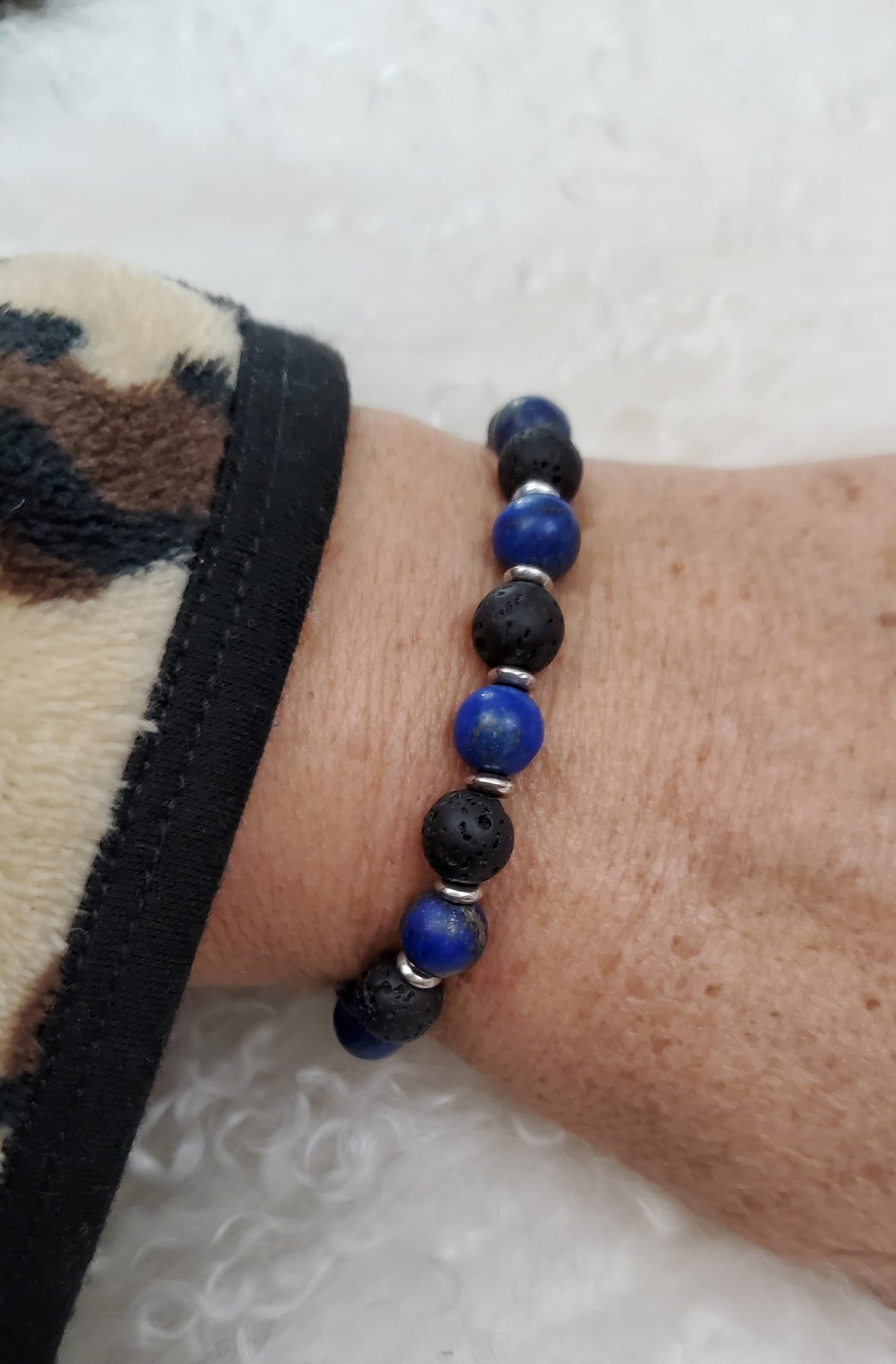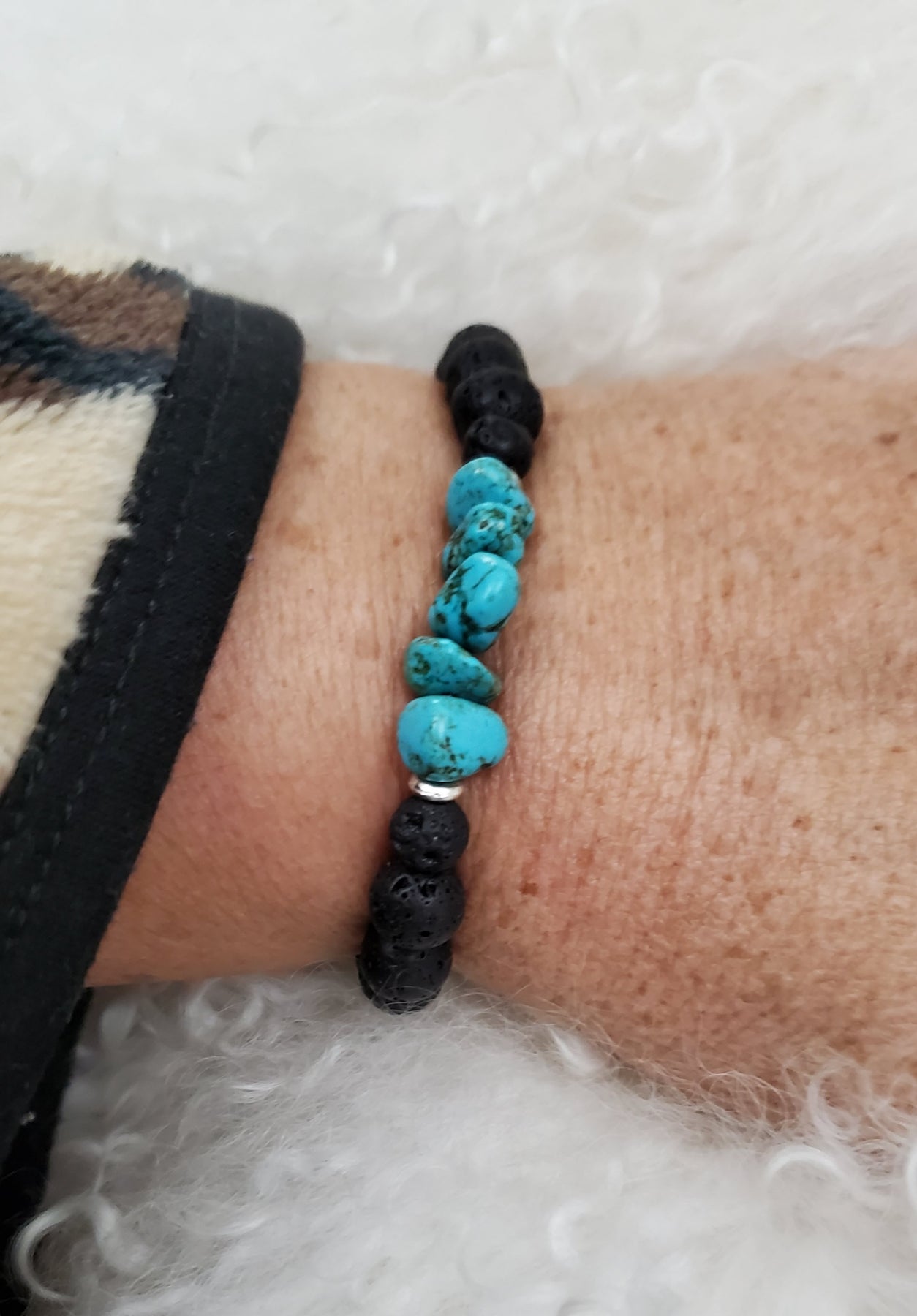 The black Lava stones accept essential oils so you can carry a relaxing or energizer scent with you for hours right on your wrist. Many of the natural stones have healing benefits as well. Strung on elastic cord for easy wear; fits most wrists.