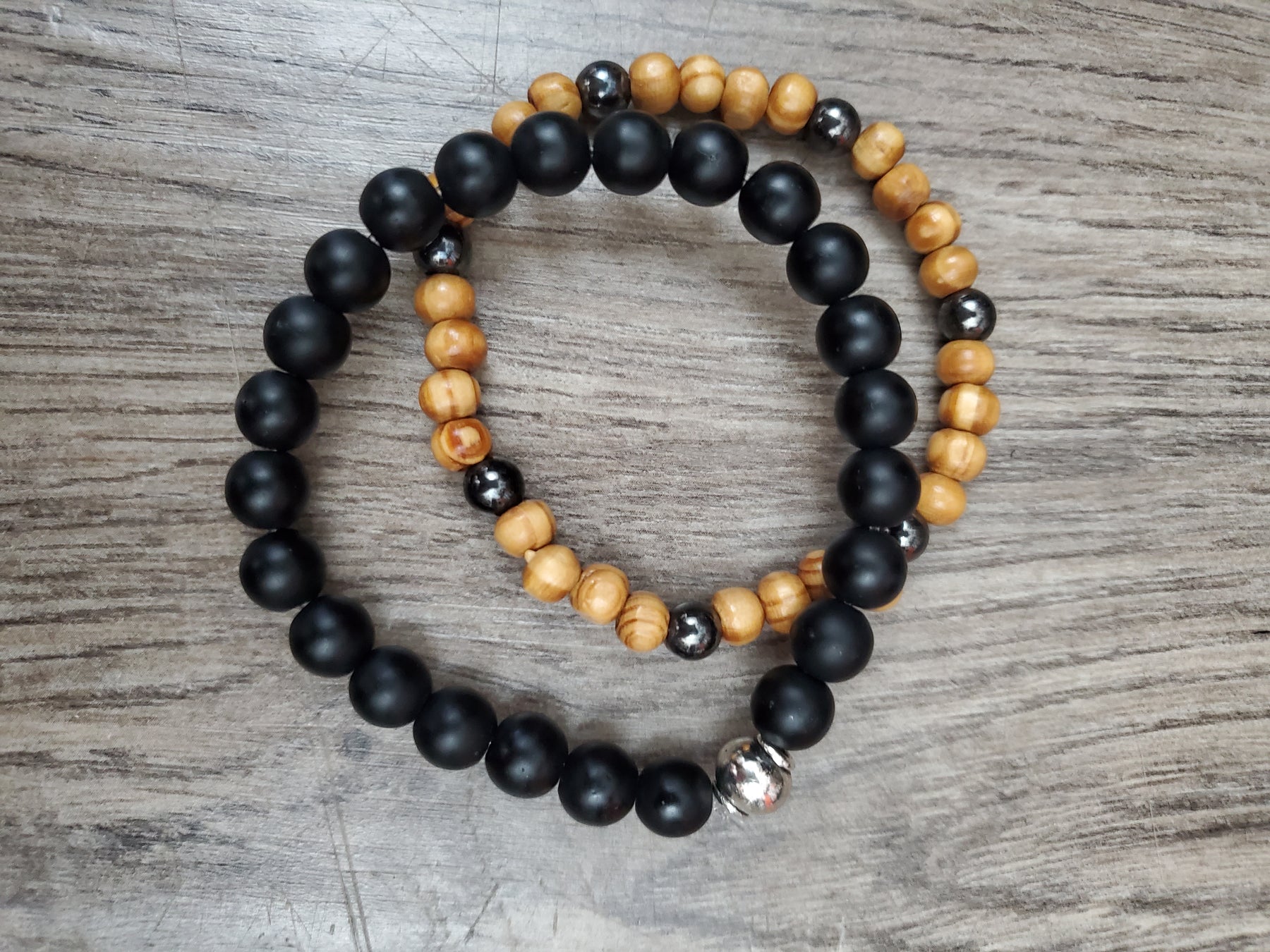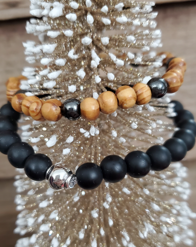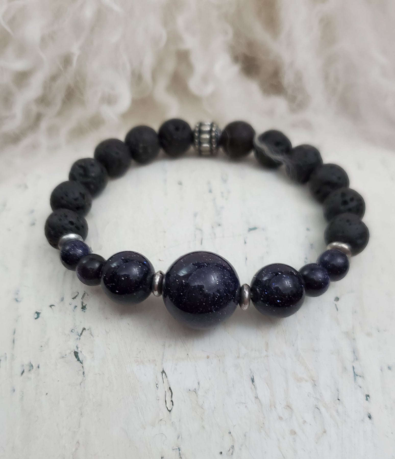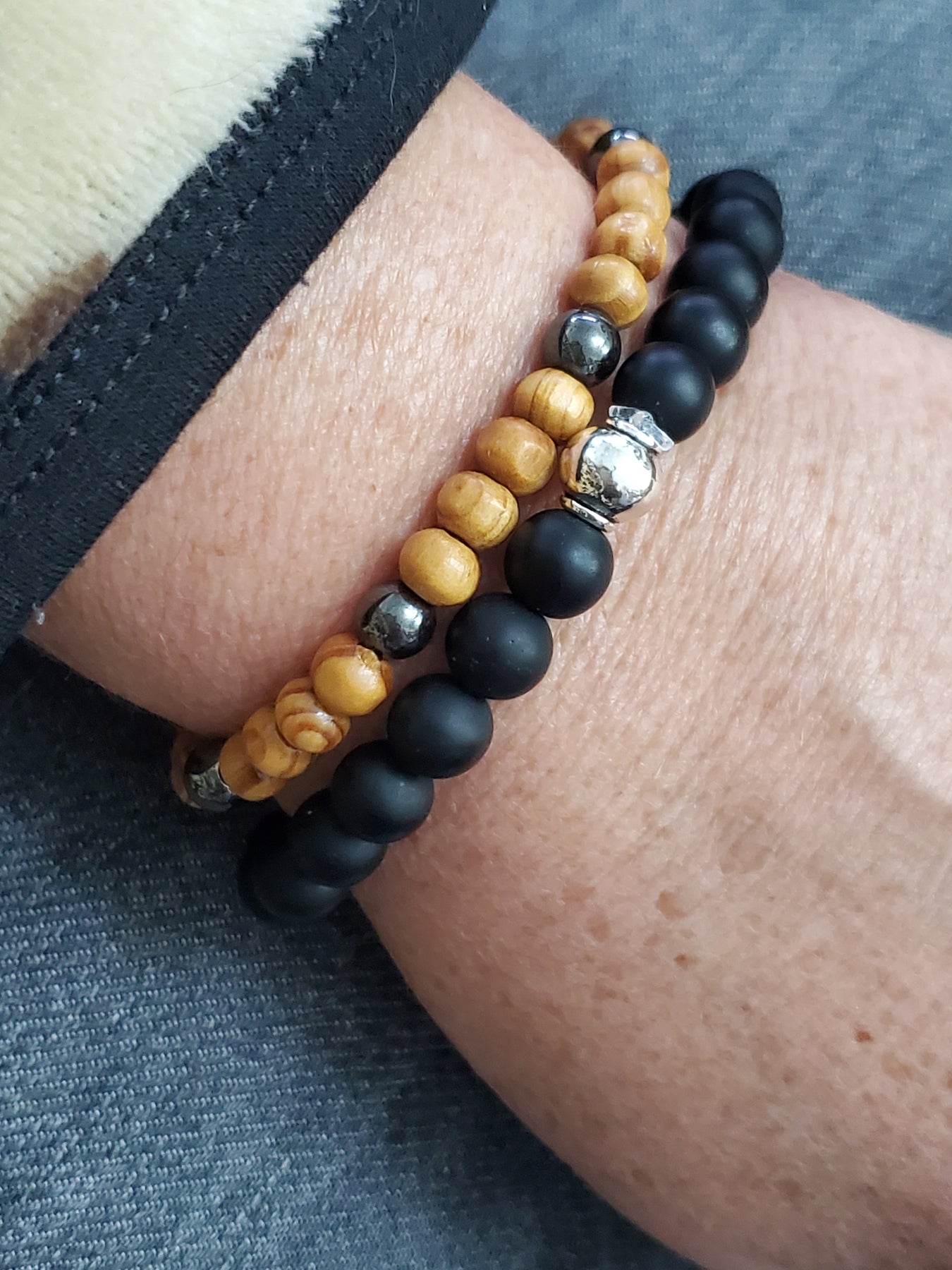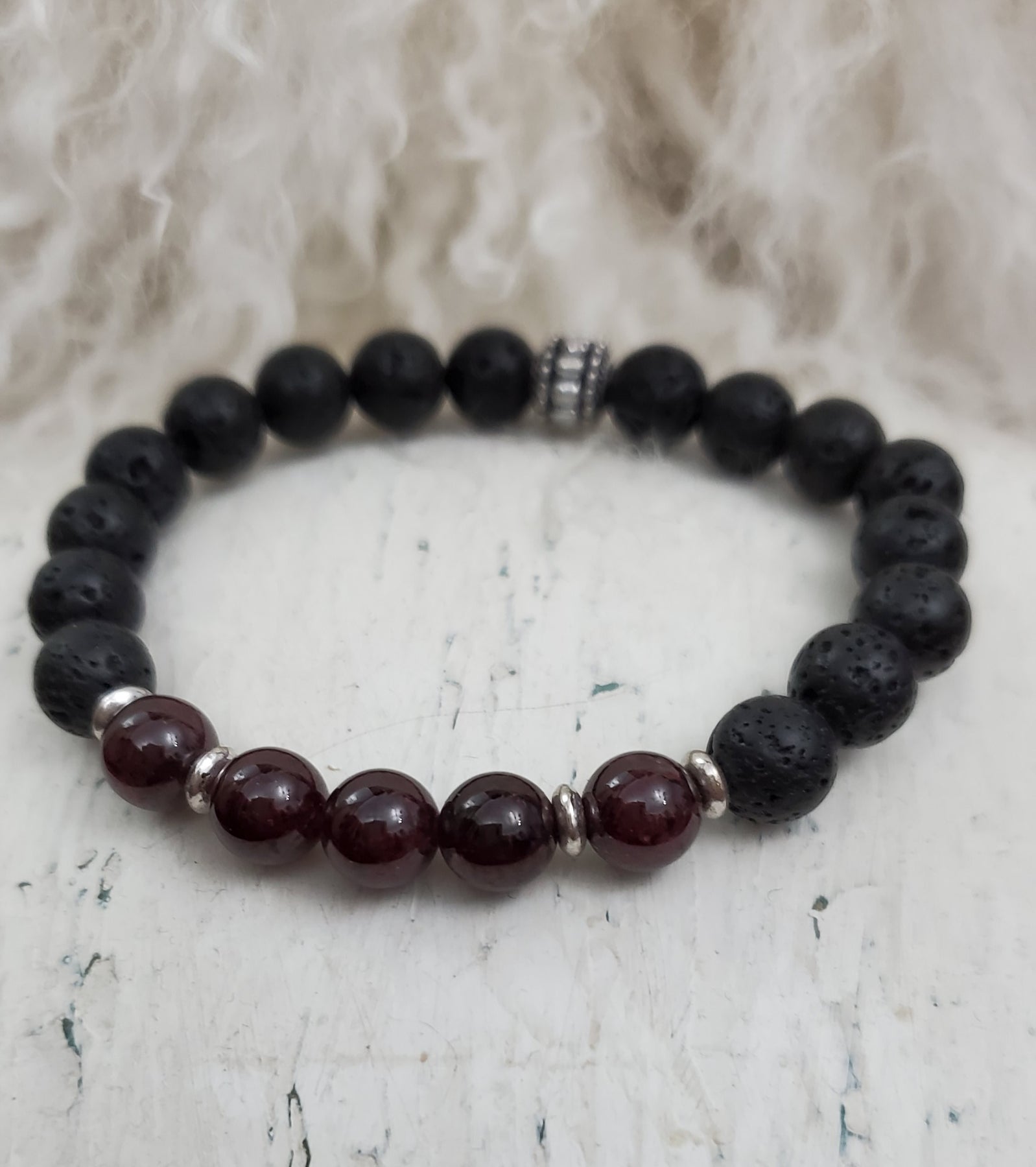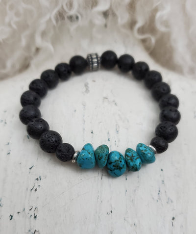 The black Lava stones accept essential oils so you can carry a relaxing or energizer scent with you for hours right on your wrist. Many of the natural stones have healing benefits as well. Strung on elastic cord for easy wear; fits most wrists.