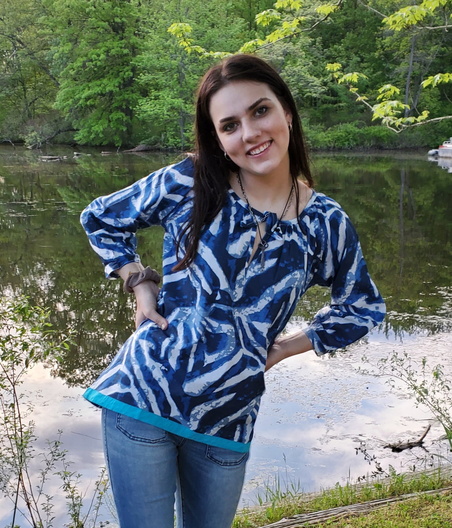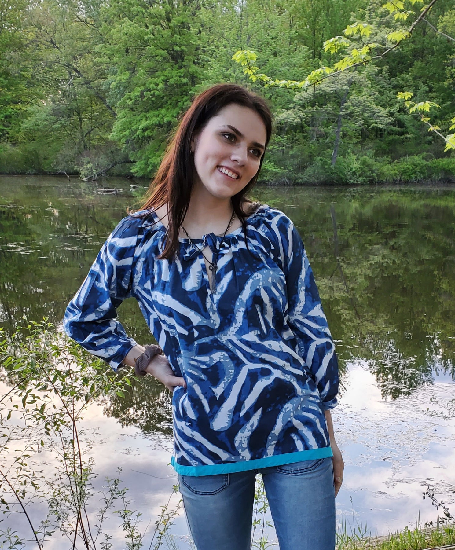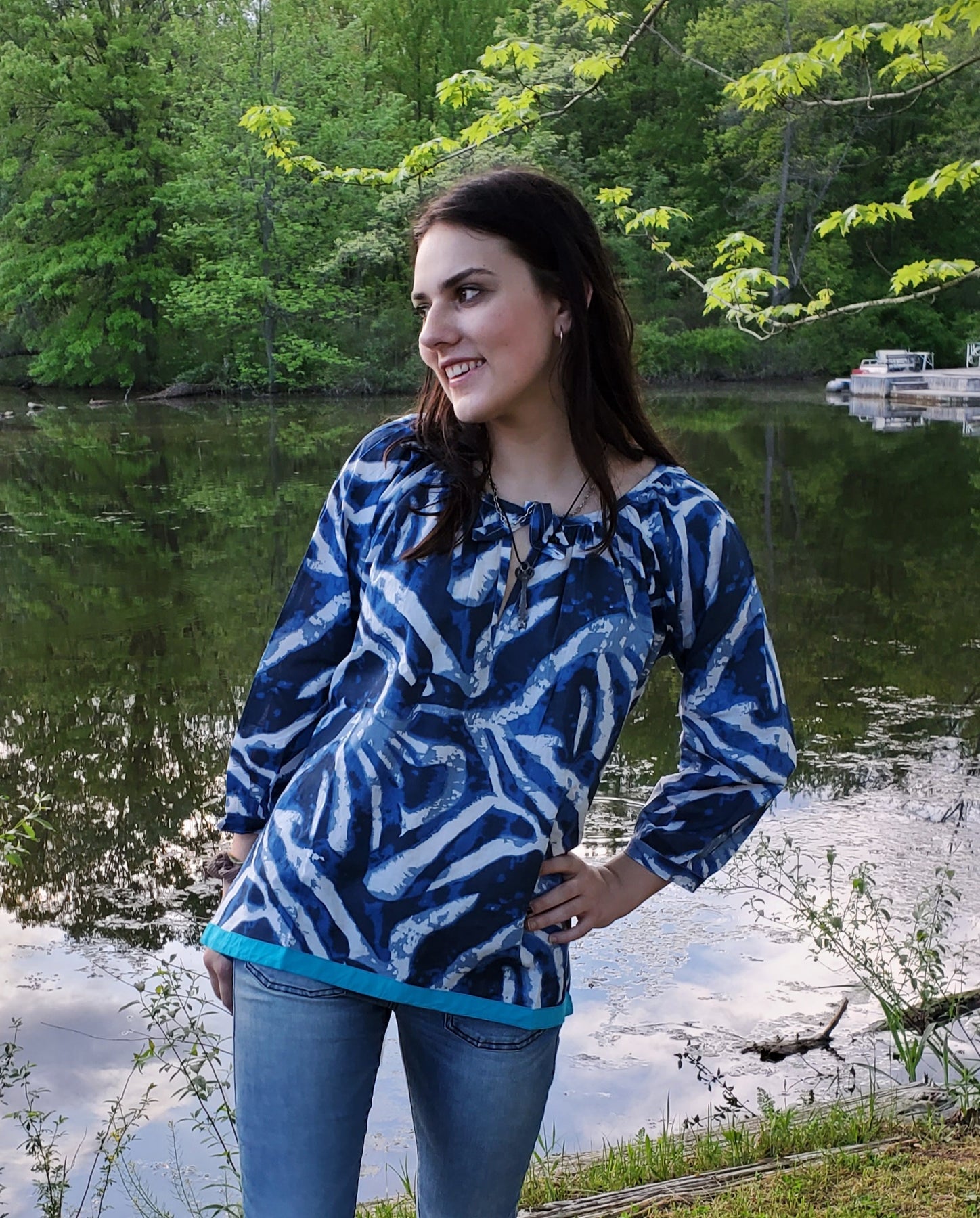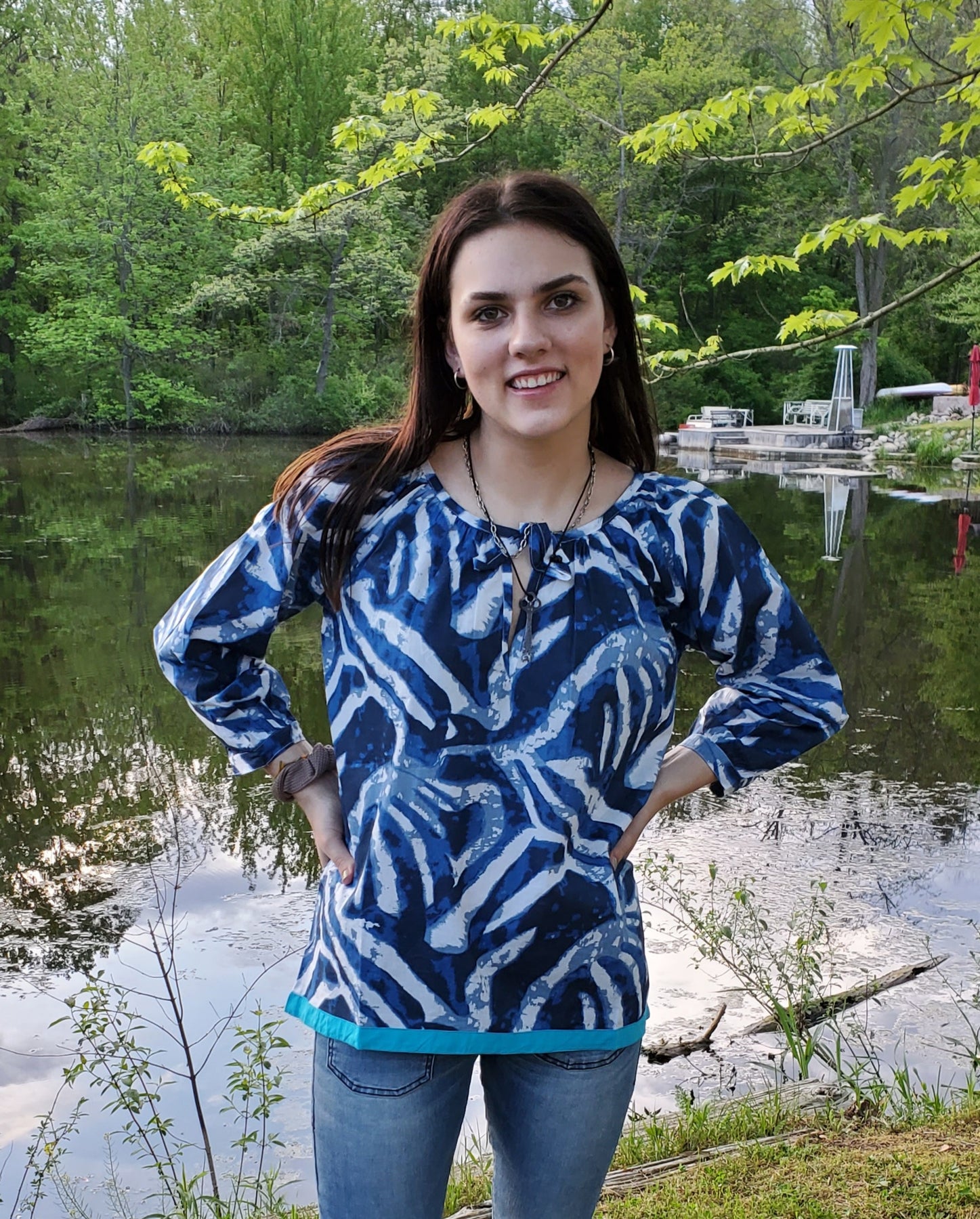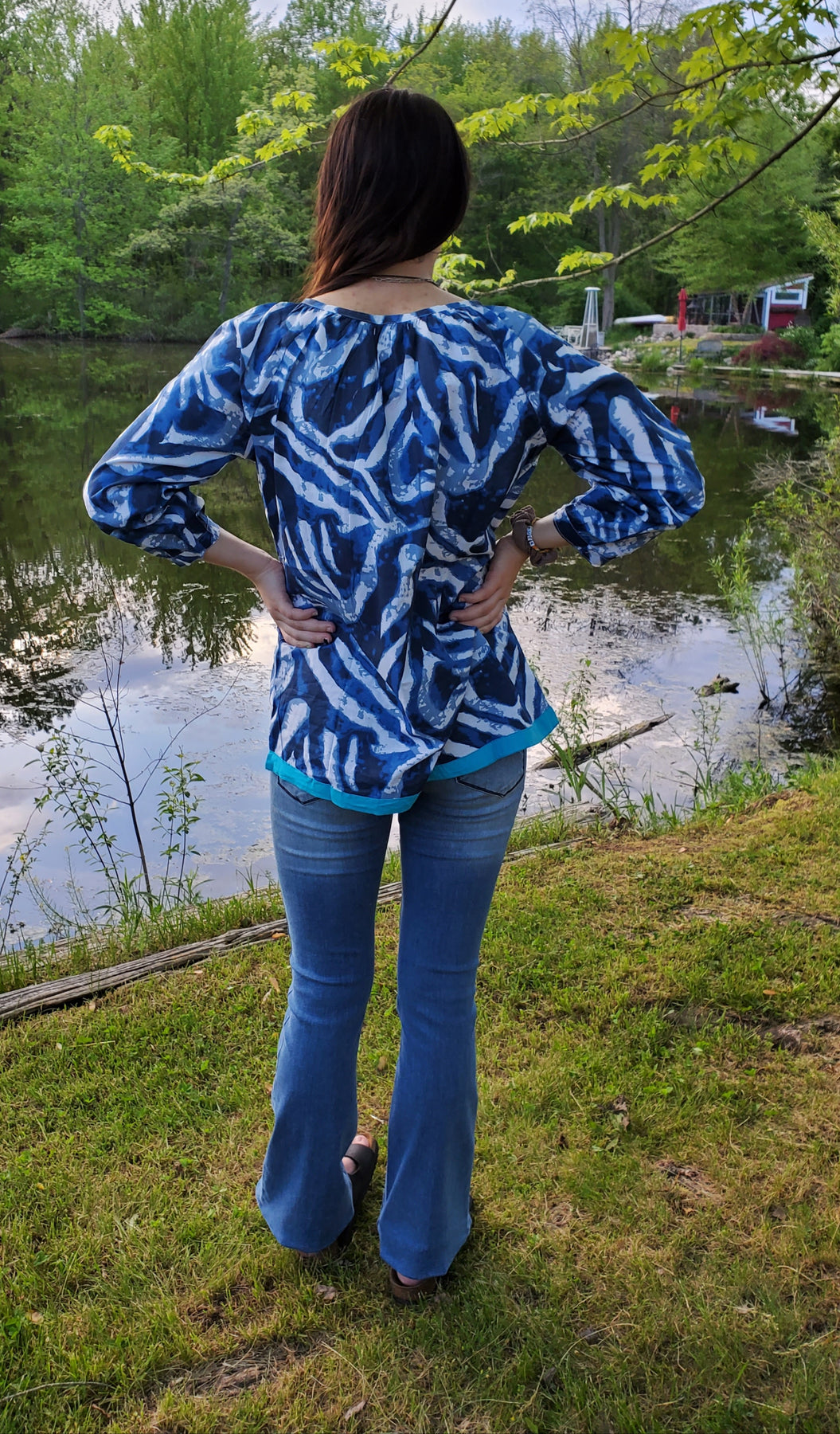 With it's high low waist line and it's keyhole tie neckline ... this cute peasant blouse is all the rage for summer fun and relaxation. 3/4 cuffed hem sleeves with a contrasting aqua hem wrap up these simple lines as neatly as a Texas Two Step. Don't forget the headband and the bell bottoms! ALL trending.