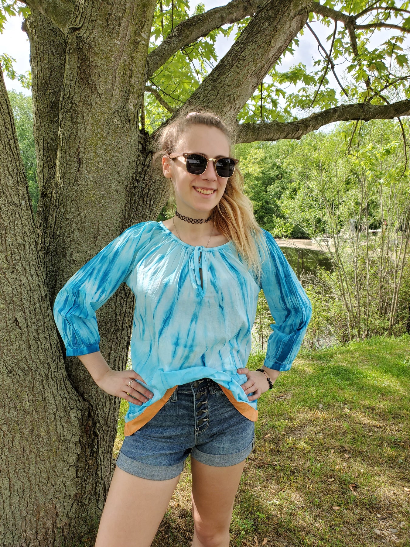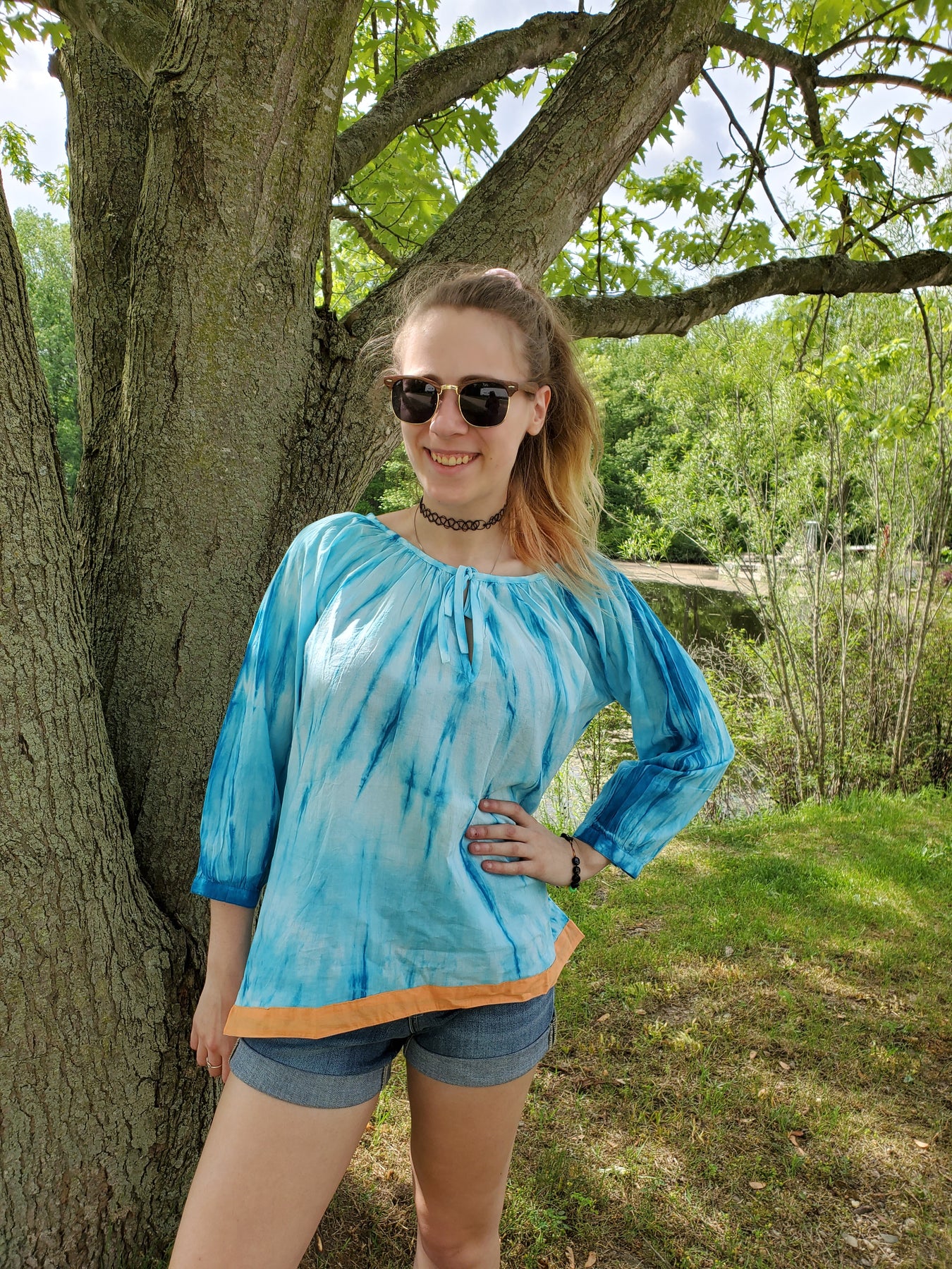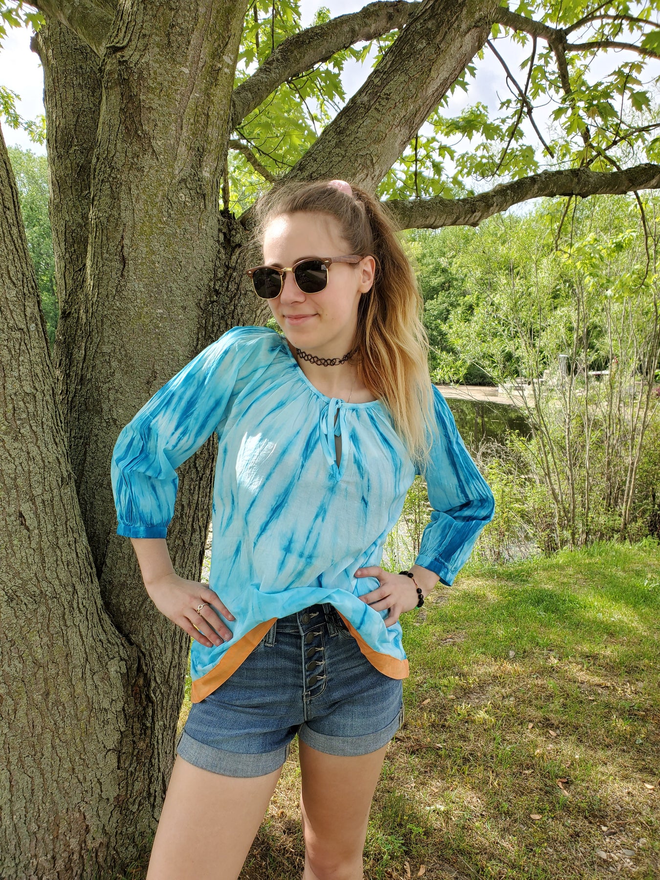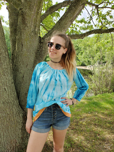 With it's high low waist line and it's keyhole tie neckline ... this cute peasant blouse is all the rage for summer fun and relaxation. 3/4 cuffed hem sleeves with a contrasting aqua hem wrap up these simple lines as neatly as a Texas Two Step. Don't forget your headband!