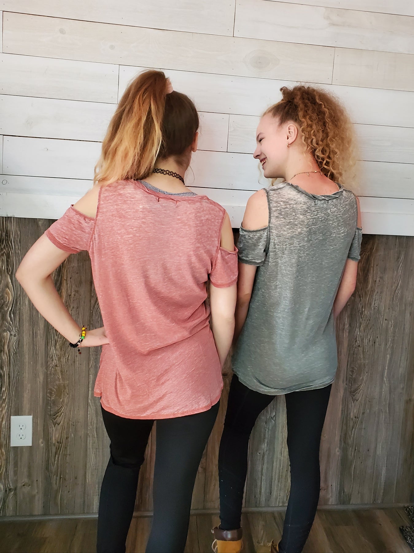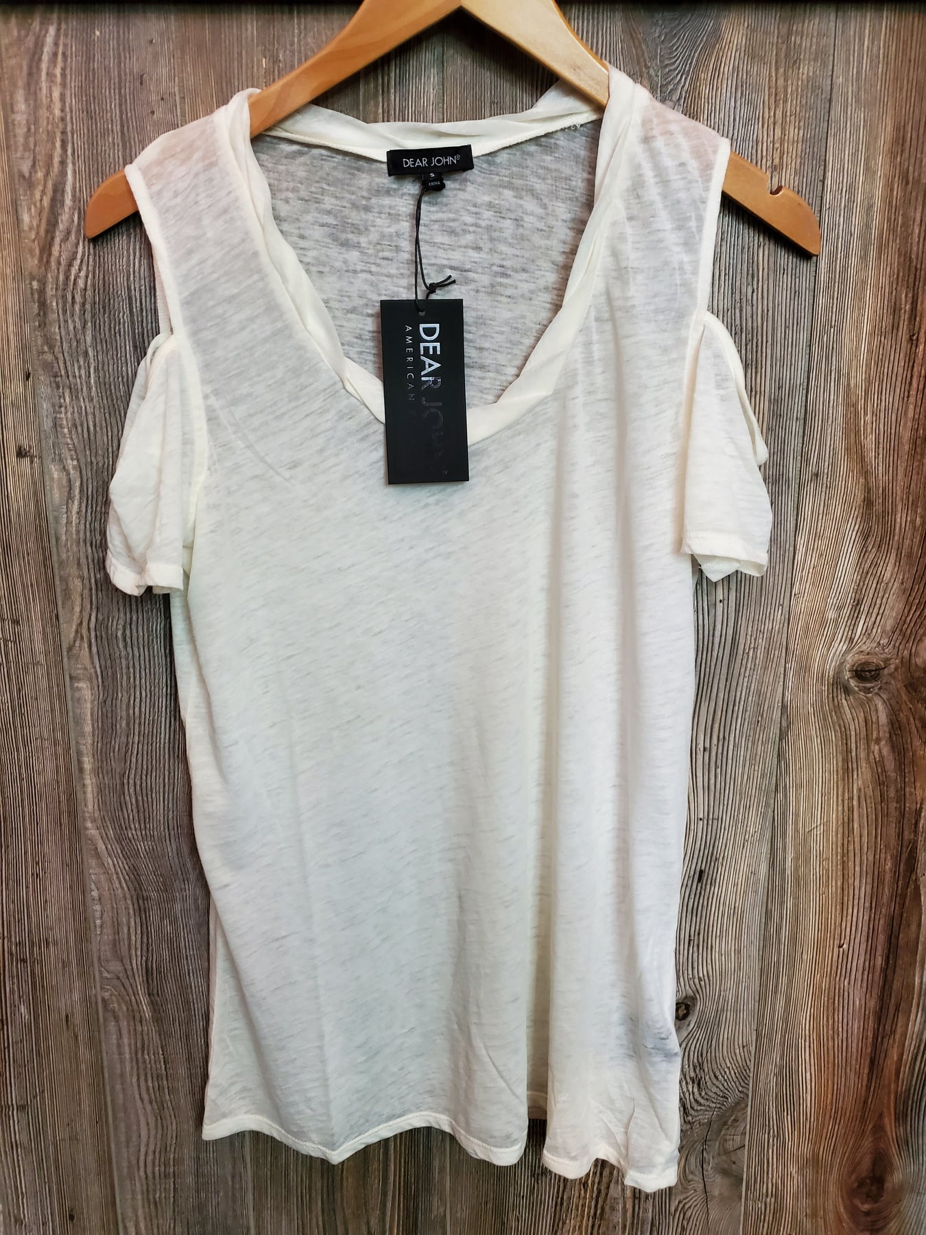 Cold shoulder cool! The Ashlynn top from DEAR JOHN is a perfect basic piece to add to your wardrobe. She's a short sleeve destressed semi-sheer tee featuring a trendy cold shoulder detail with burnout coloring. Absolutely perfect for pairing with your favorite spring and summer looks! Young contemporary sizing