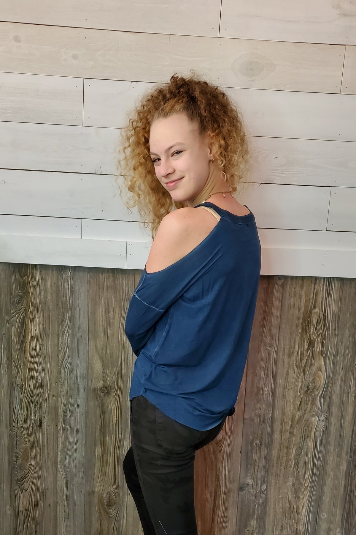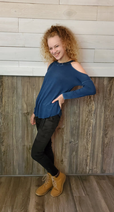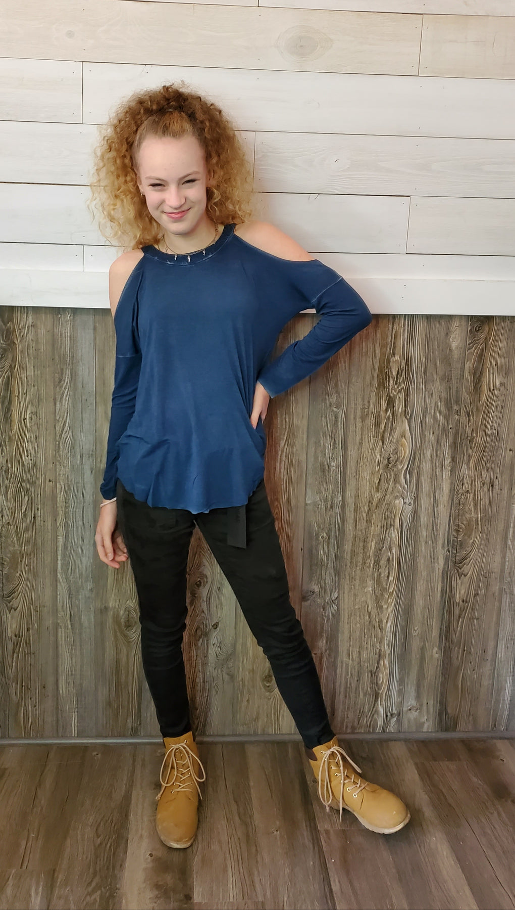Add a little elegance to your year round wardrobe with this dirty wash tee from DEAR JOHN features a banded round neckline. Open shoulders and long sleeves for a stylish cool look. Rounded hi-low hem makes this the ultimate top for jeggings for the laid back casual look in Contemporary Missy Sizing.