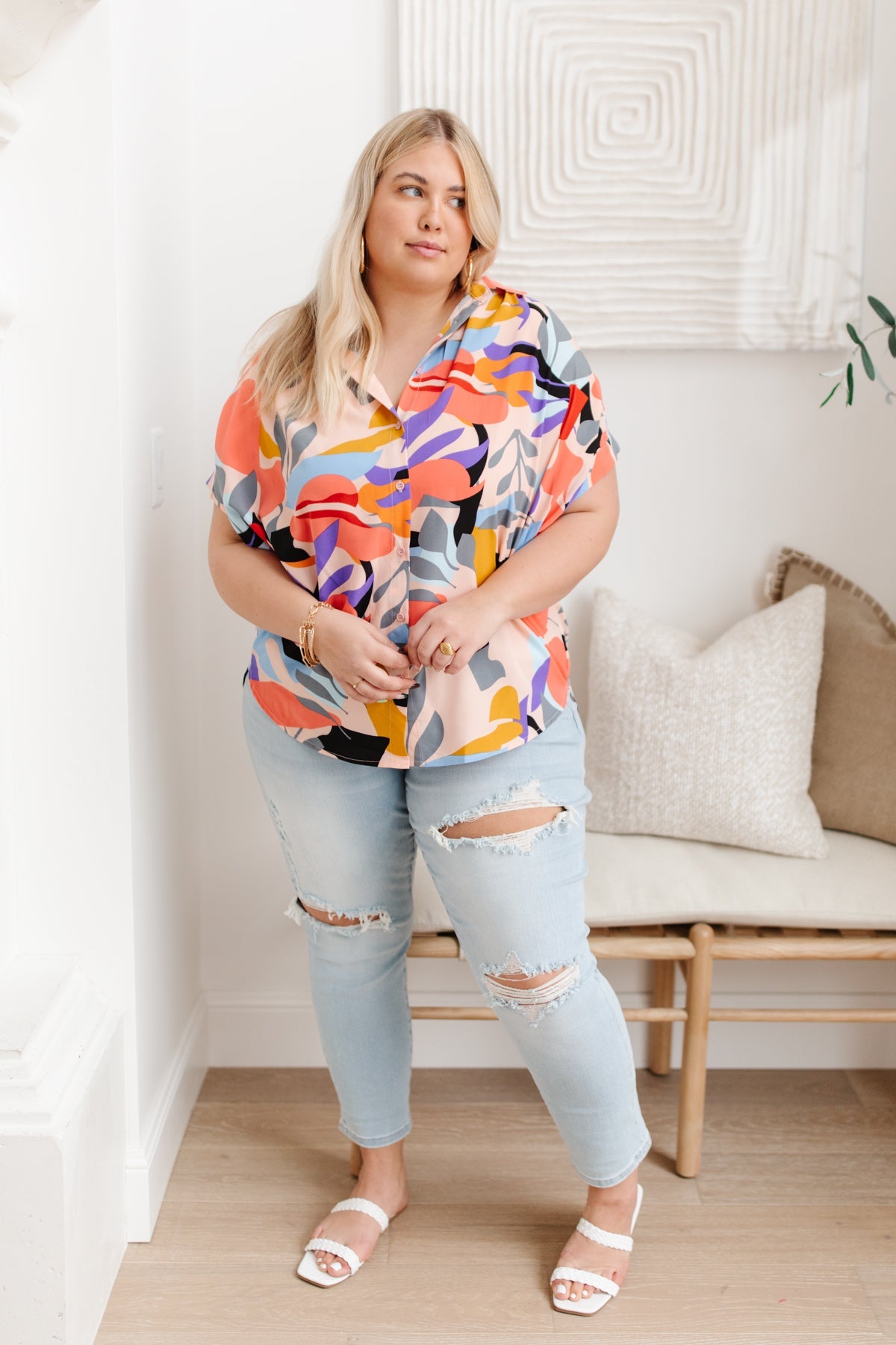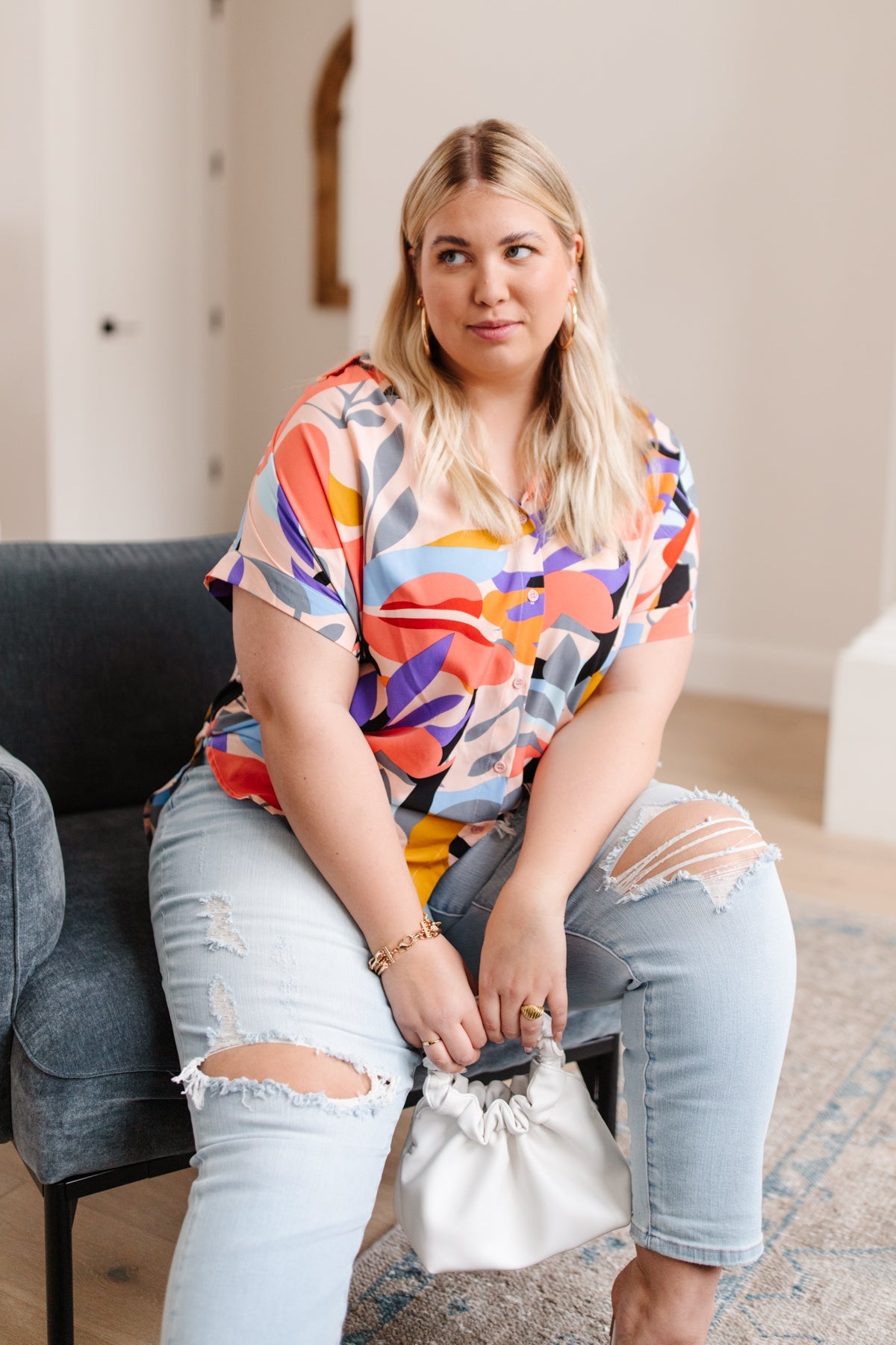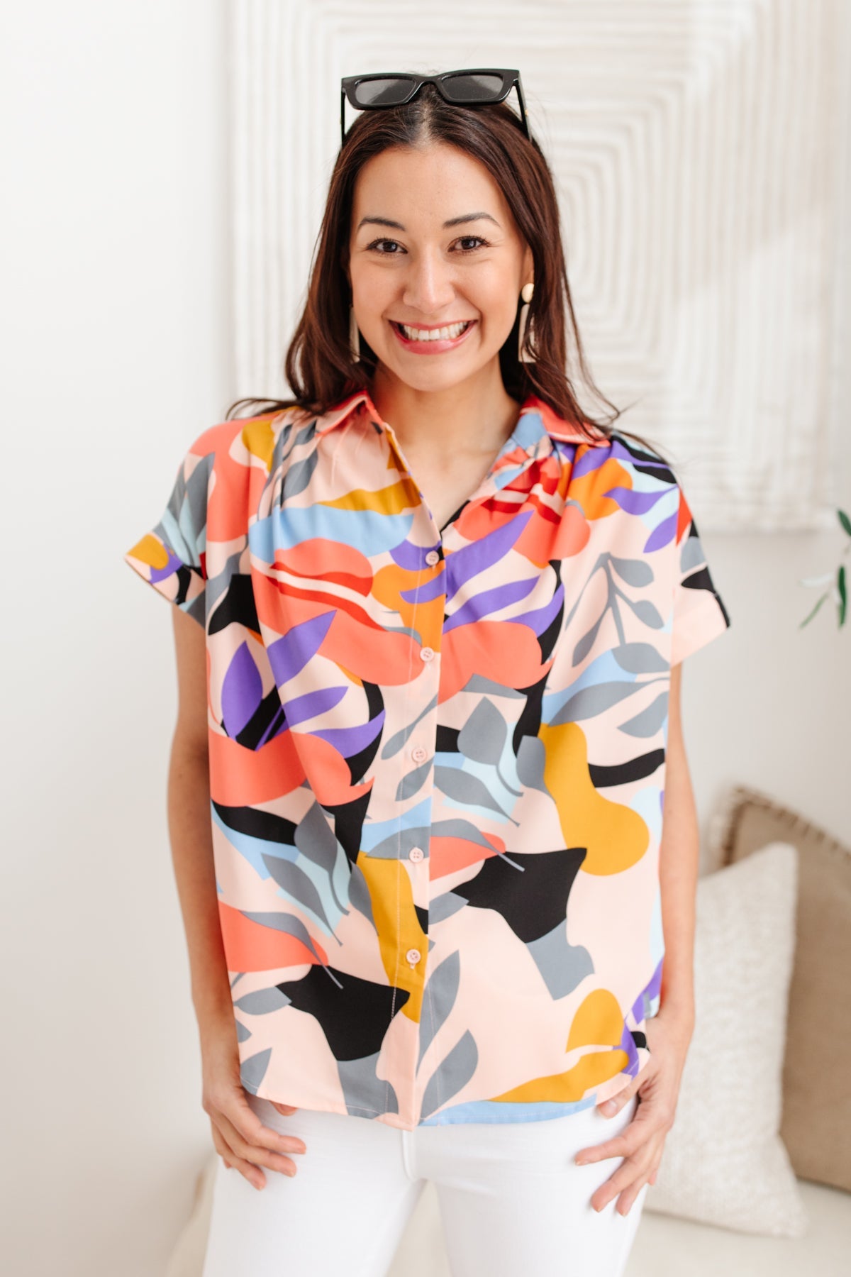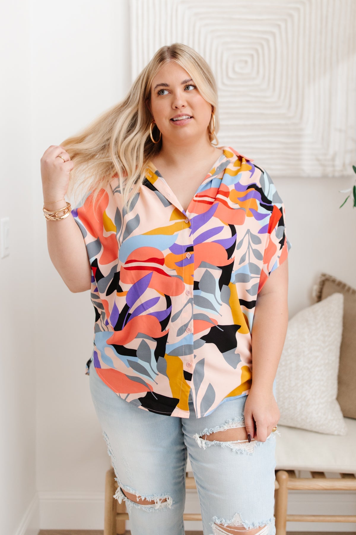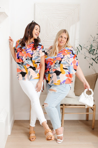 This funky printed top features a lightweight, flowy fabric, a collared neckline, pleated shoulders, cuffed dolman short sleeves, and boxy silhouette. Pair with white denim and nude sandals for a look you can feel confident in!