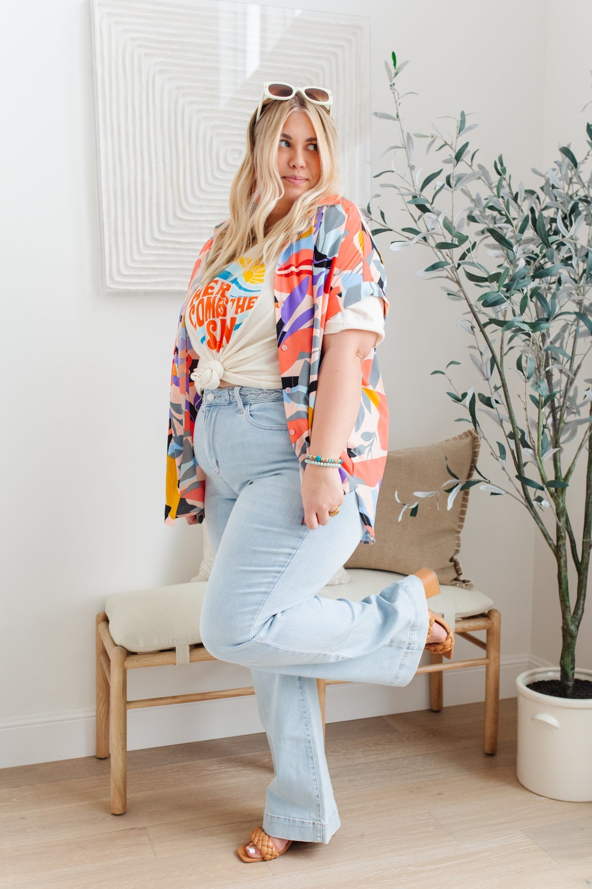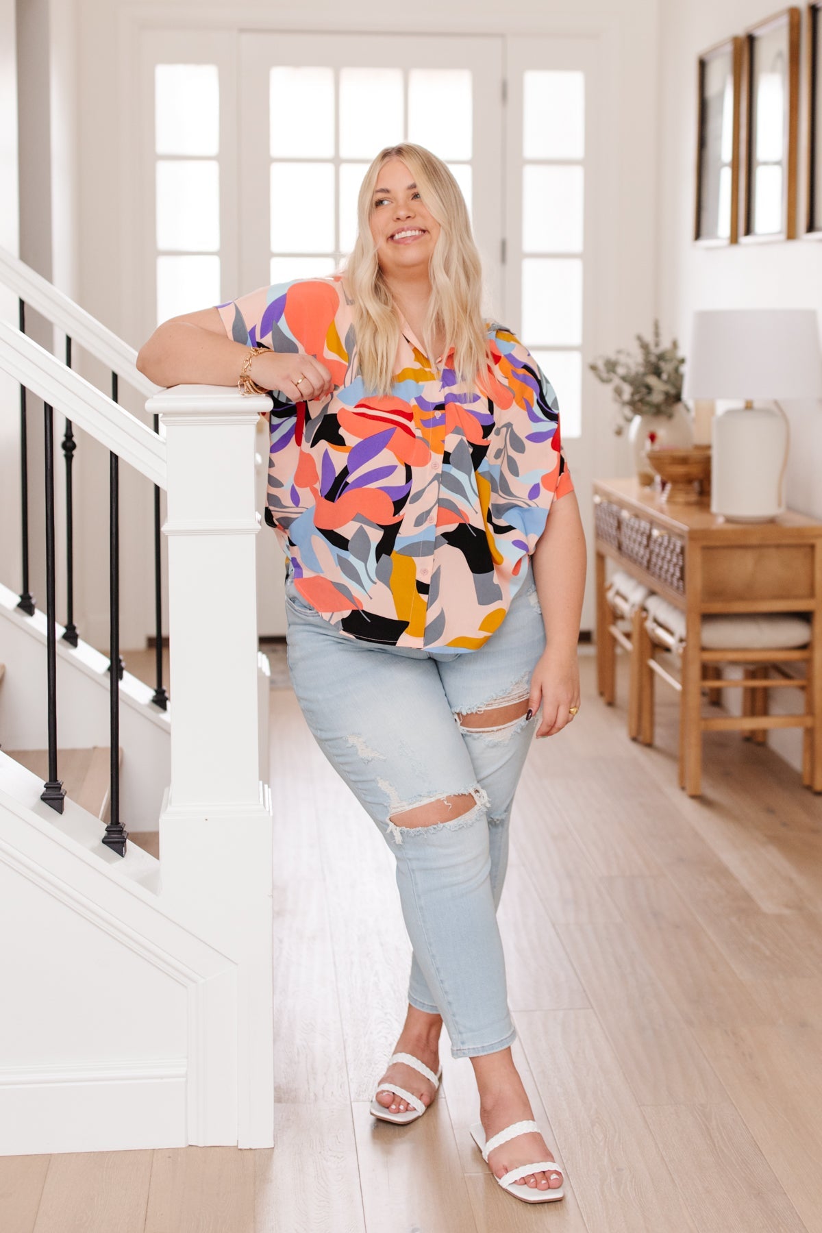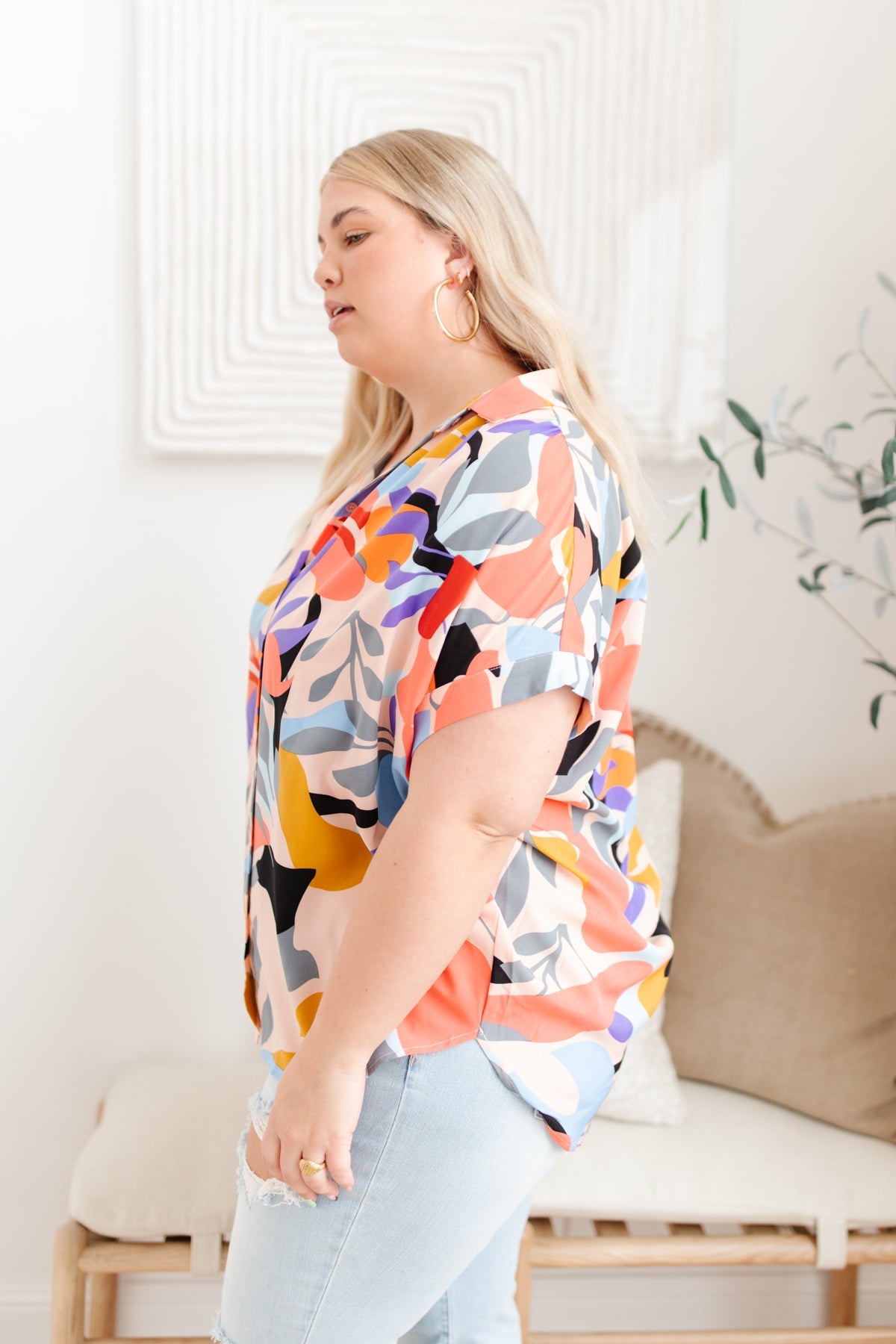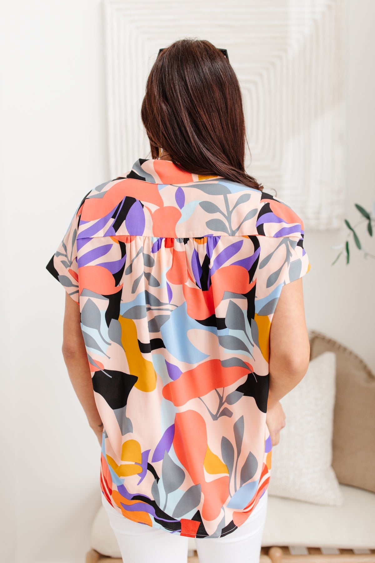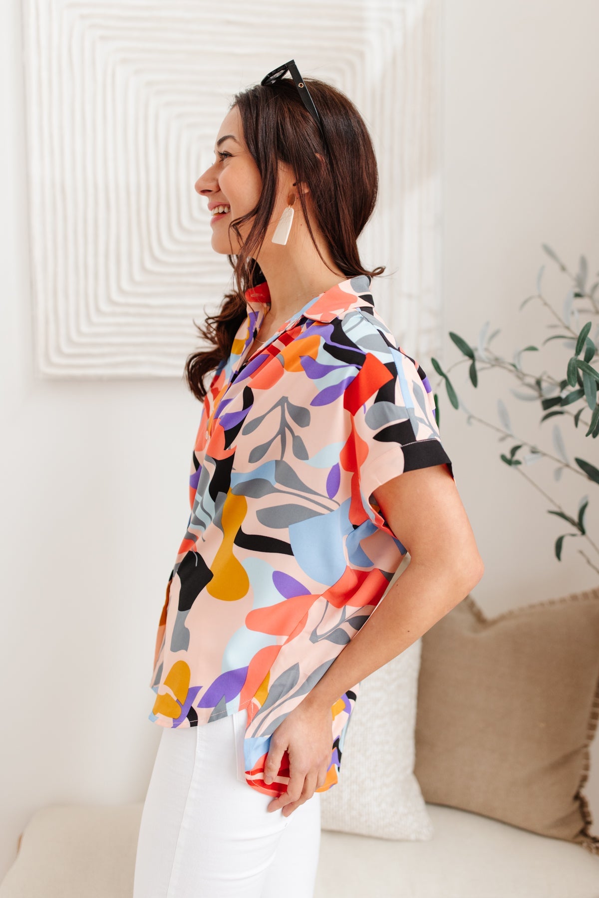 This funky printed top features a lightweight, flowy fabric, a collared neckline, pleated shoulders, cuffed dolman short sleeves, and boxy silhouette. Pair with white denim and nude sandals for a look you can feel confident in!