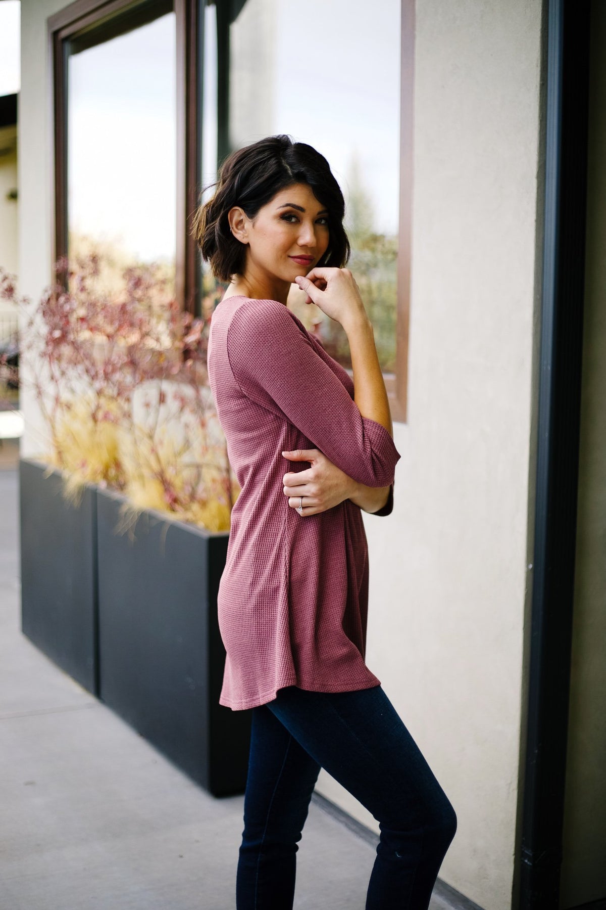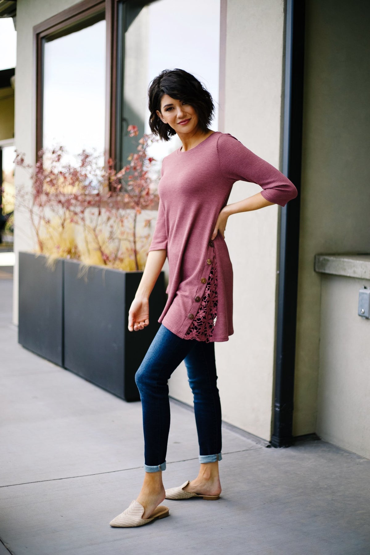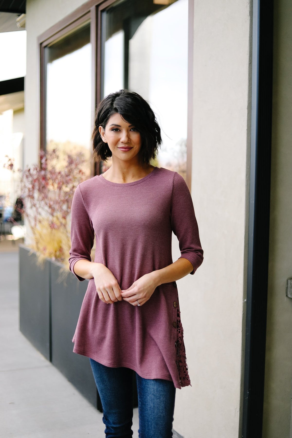 "Once more into the breach, dear friends, once more," Shakespeare's famous line from Henry V, inspired the name for this stunning blouse. This fine-gauge waffle knit top is marvelously unique with it's long asymmetrical hem, emphasized by the dramatic pie-shaped slice of missing fabric on the longer lefthand side. But there's no need to fear! This breach is met head on by beautifully crocheted floral lace and a tidy row of buttons.