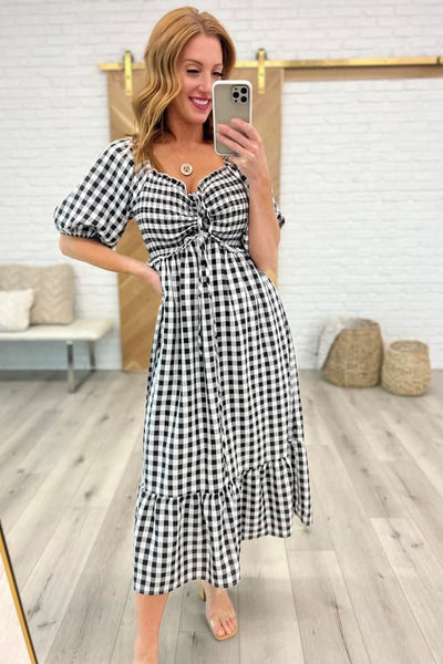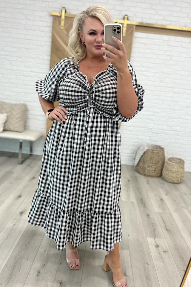 Look effortless and elegant in the Greenville Gingham Midi dress. This dress features a smocked bodice, functional cinch tie bust, and balloon sleeves that create a flattering silhouette. Crafted from woven gingham fabric, it promises to keep you cool, comfortable and chic. Refresh your summer wardrobe with this timeless classic!