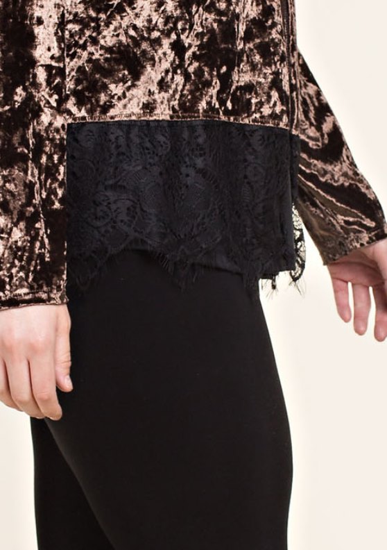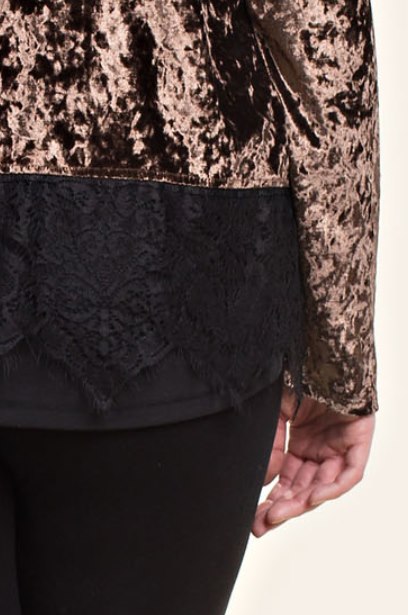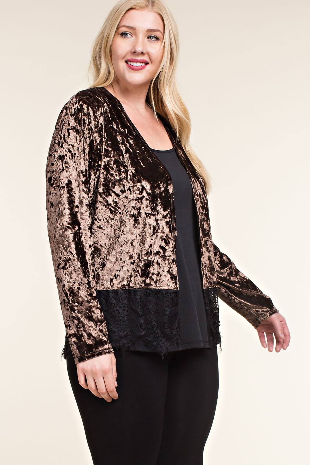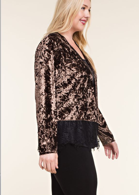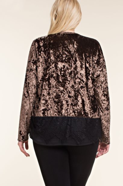 Sable colored velvet long sleeve cardigan with black lace detail at the hem. Dress up the jeans or take your simple black dress to the next level. 1X, 2X, 3X