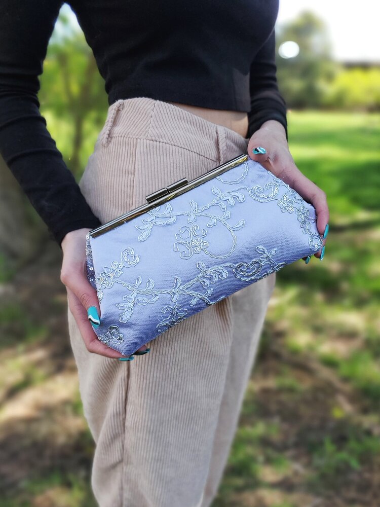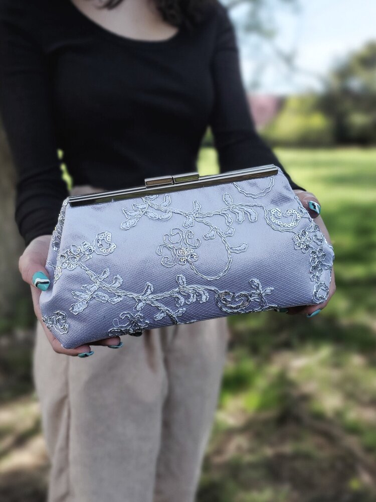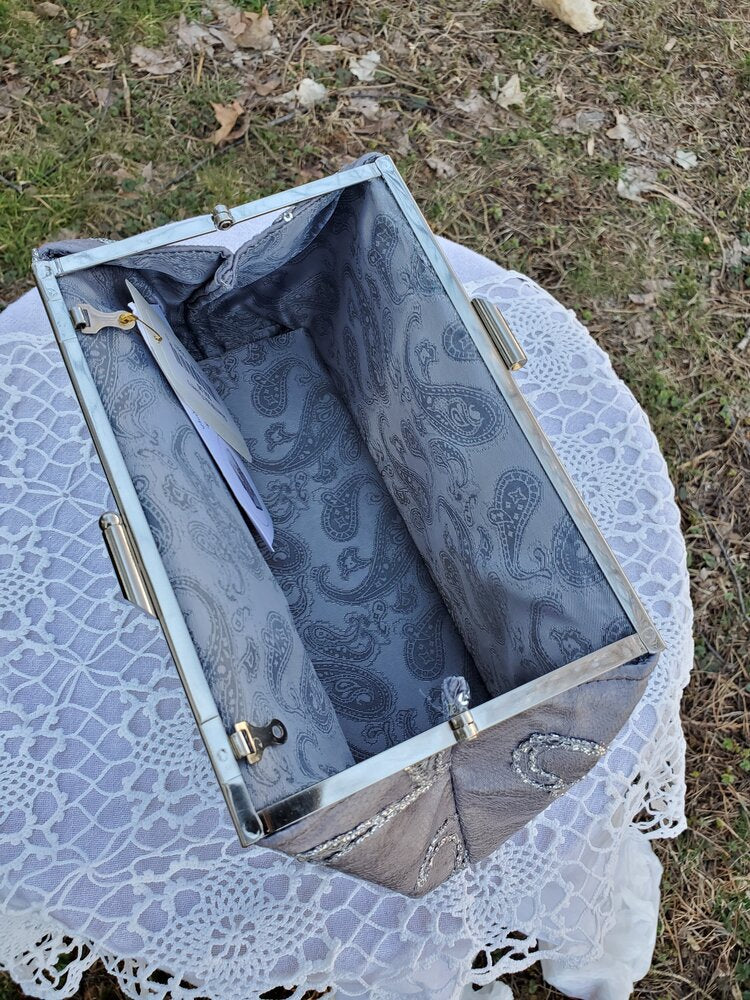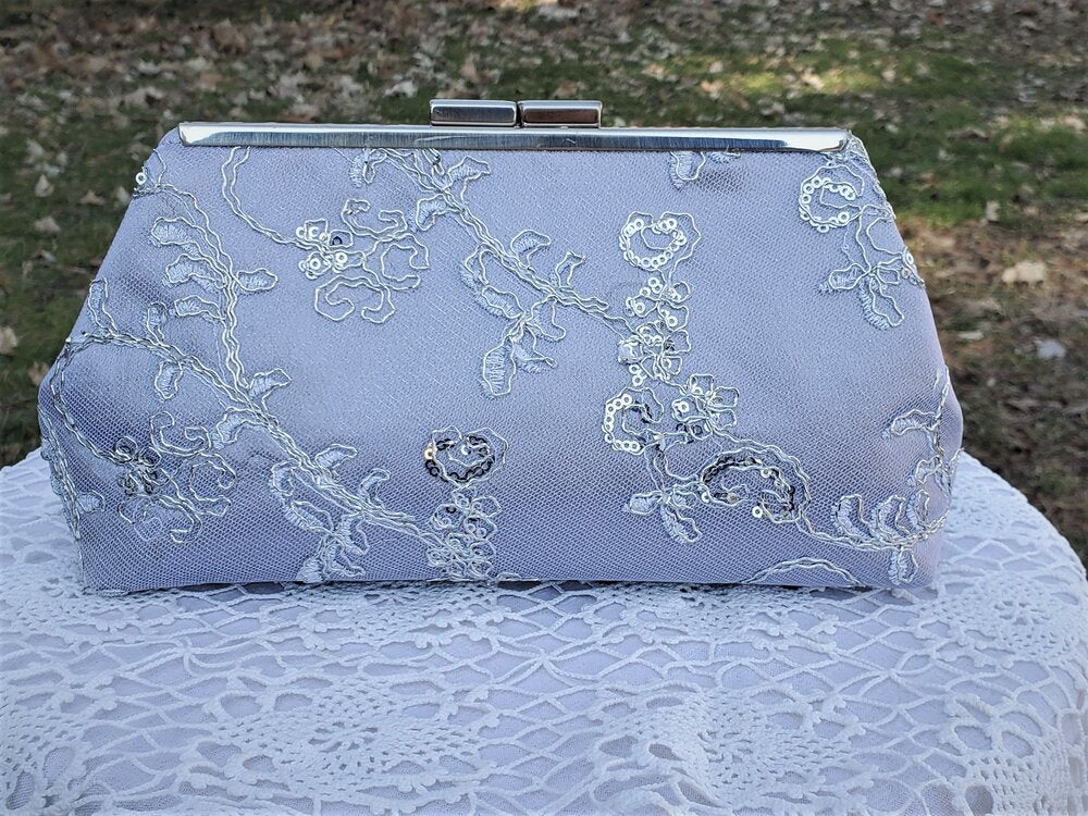 Dark silver satin overlaid with silver netting featuring silver stitching and sequins. Silver checked satin lining. Silver frame.