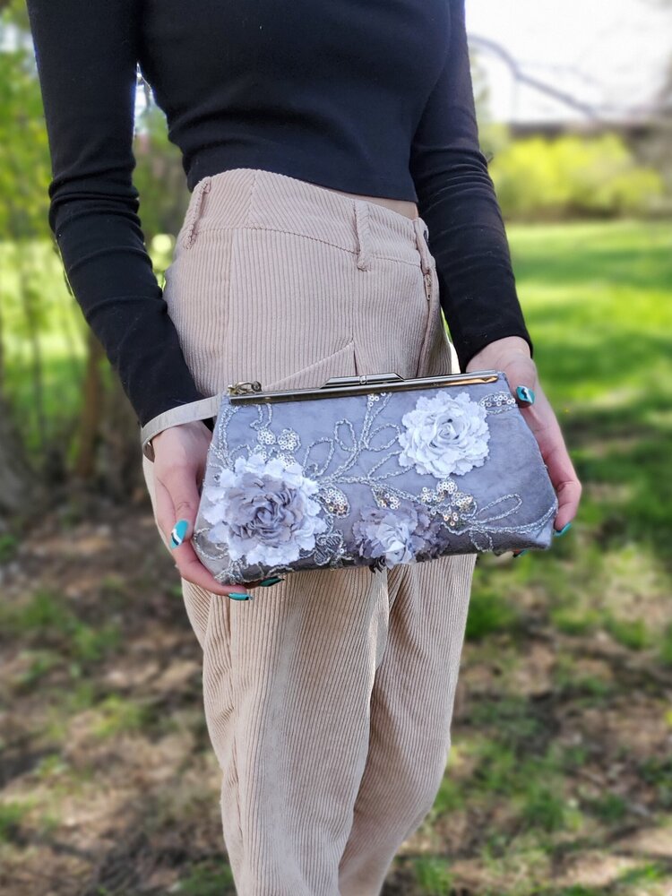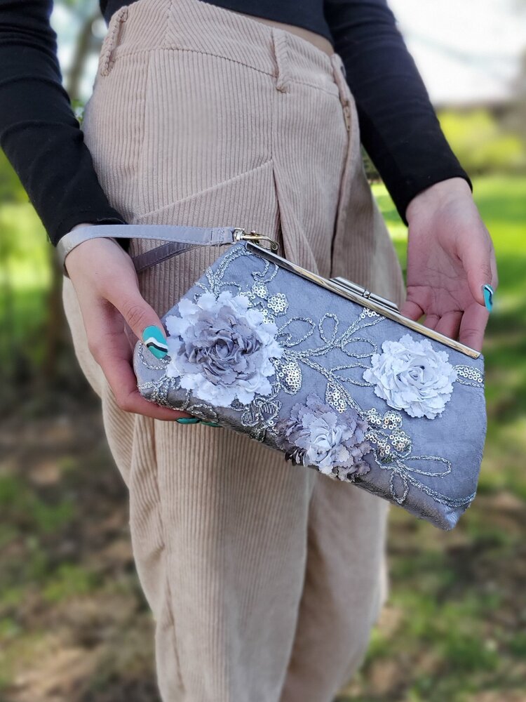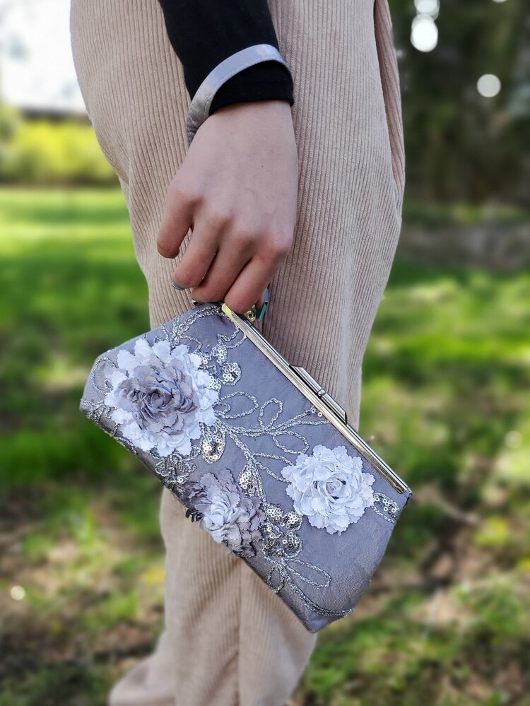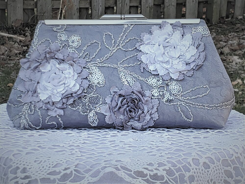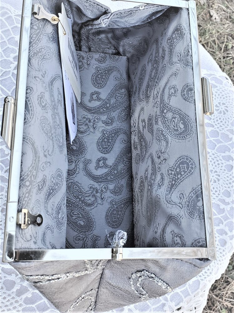 Dark gray satin covered with light gray lace featuring ribbon flowers and sequins. Gray paisley satin lining. Silver frame.