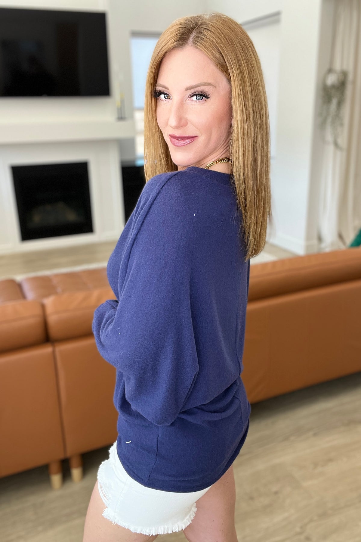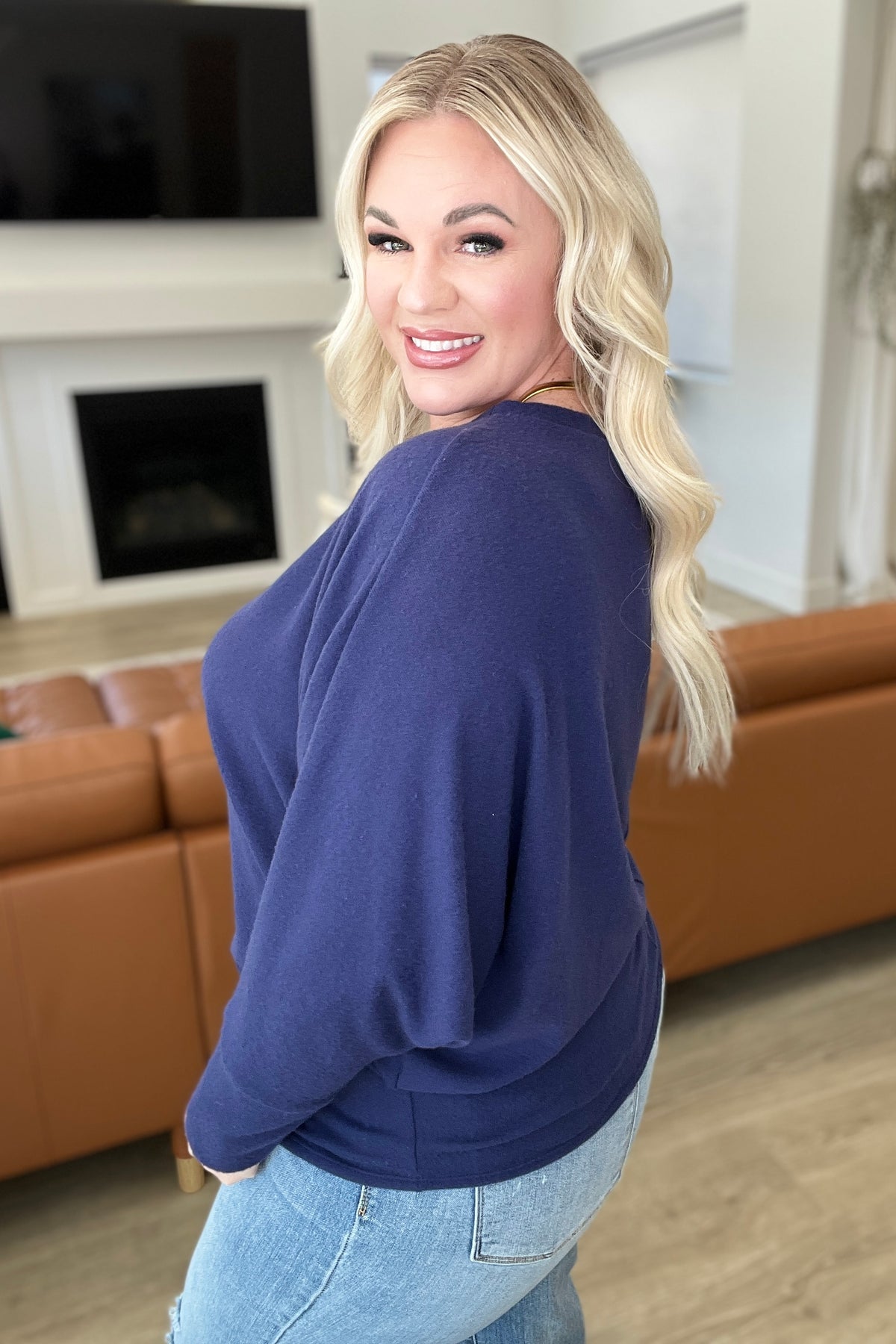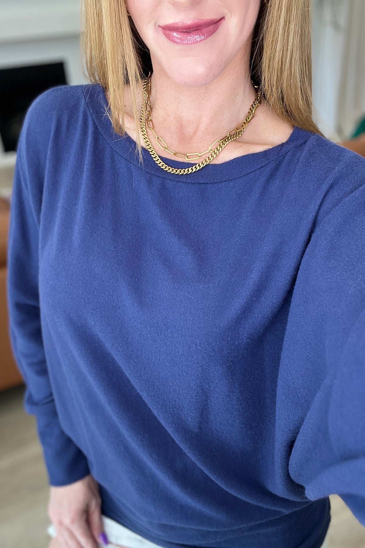 Made with soft, brushed Hacci fabric, this boat neckline top features batwing sleeves and an exaggerated cuff for a unique touch. Plus, its fitted hemline makes it a great basic for layering or wearing on its own!