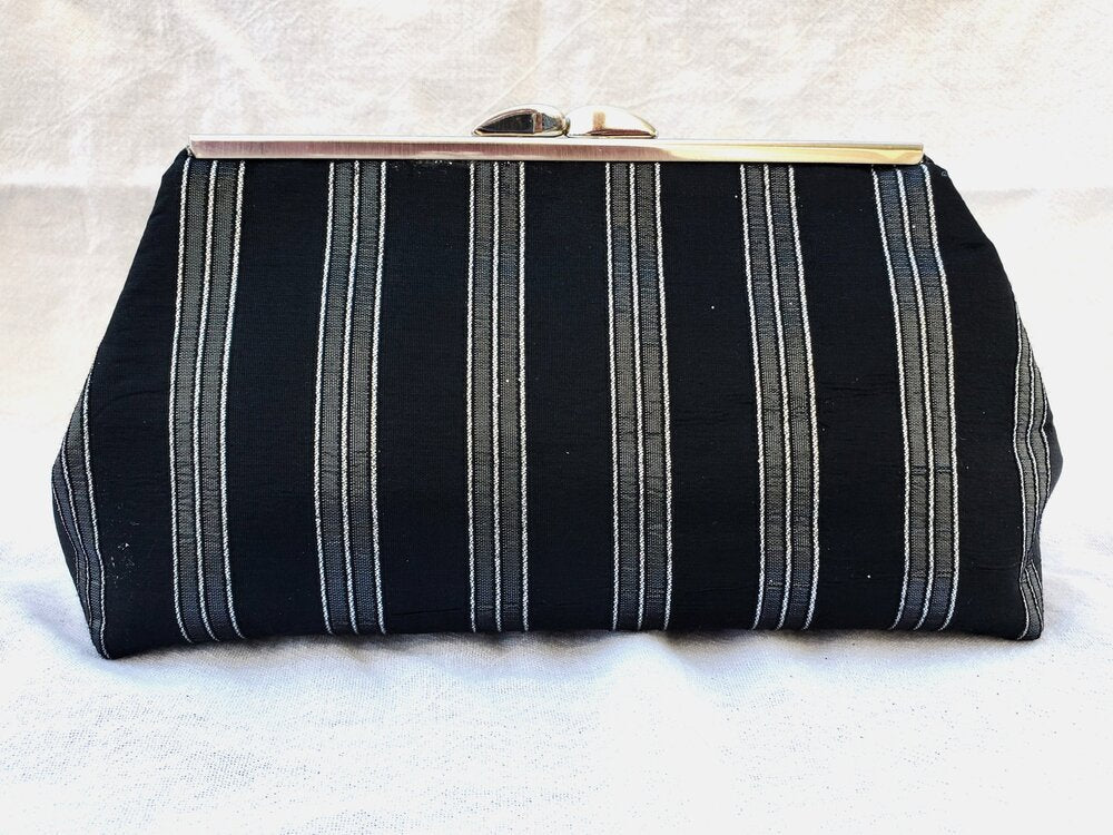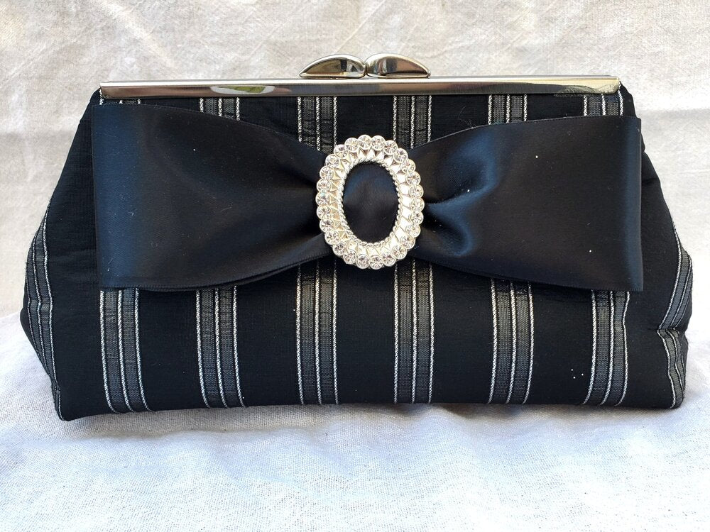 Black with silver stipe brocade featuring removable bow pin pin. White with black dot satin lining. Silver frame.