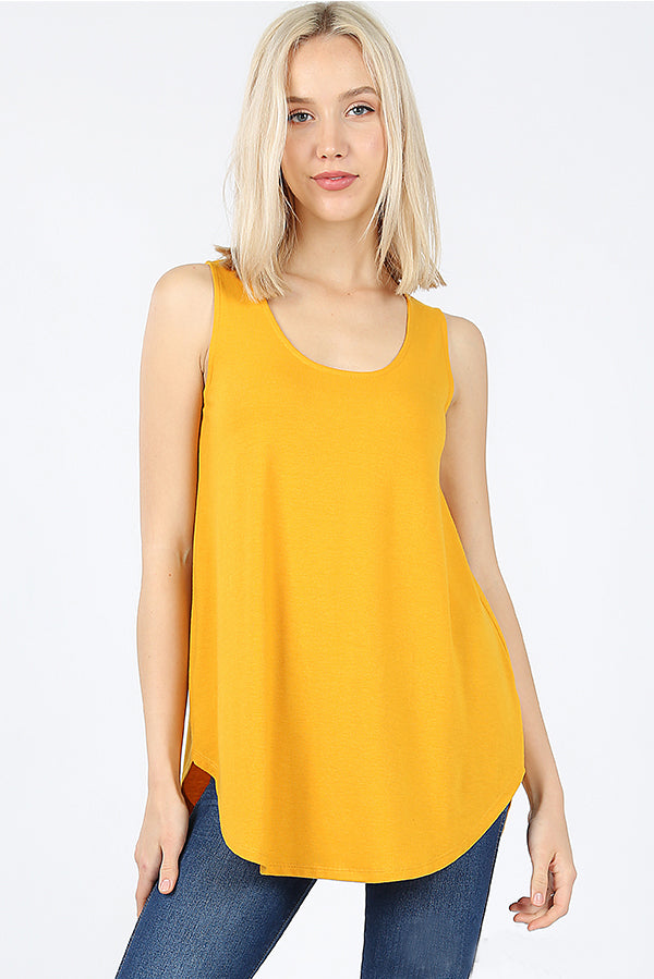 Round neck, round hem tank with a flowy fit on the bottom. Super flattering and keeps you cool in the summer! Fabric is soft and stretchy. Features: Sleeveless, round neck and round hem. True to size relaxed, or size down if you want it to be more fitted.  This item is ONLY for the Dark Mustard color; the images of the Rose color are for style reference.