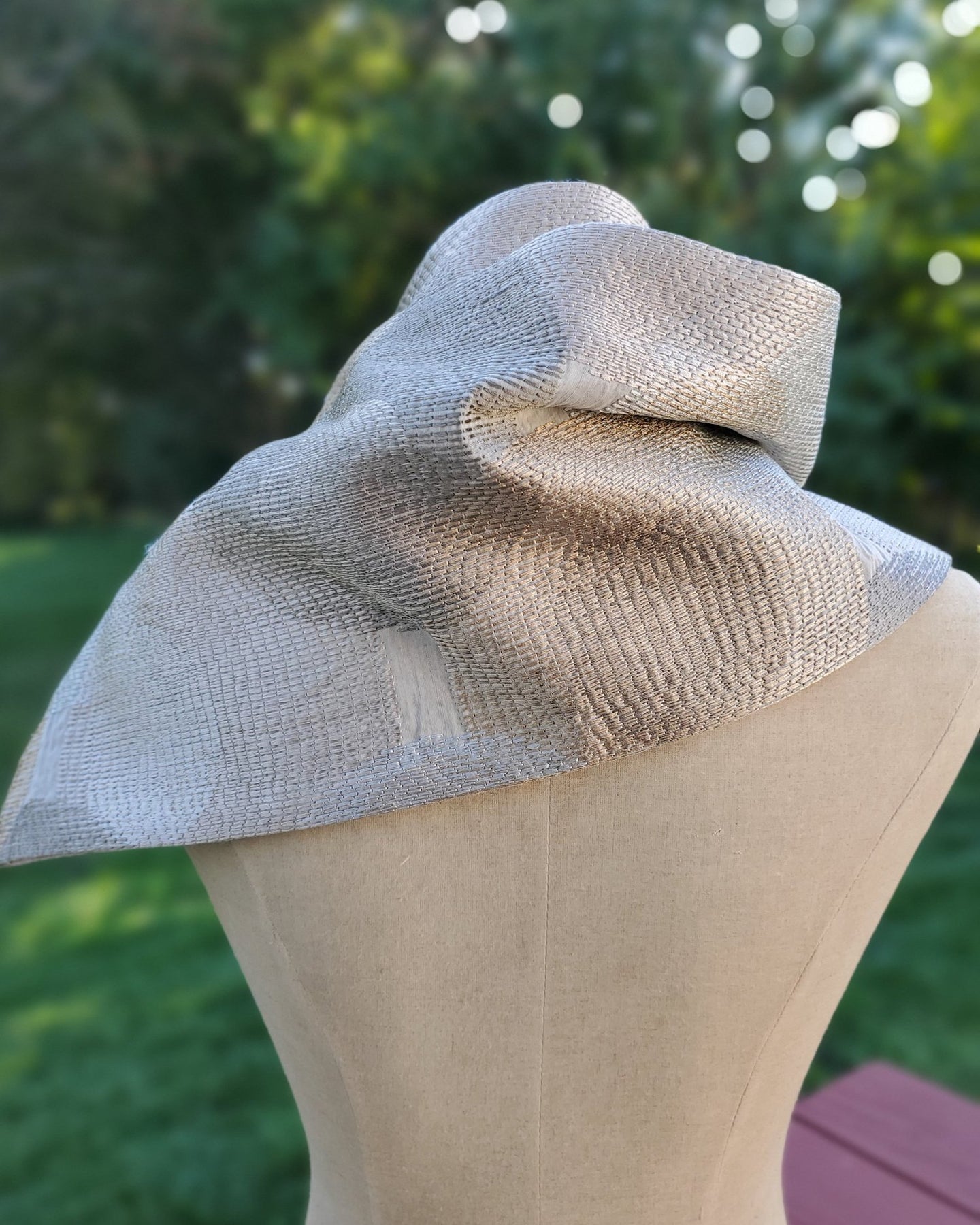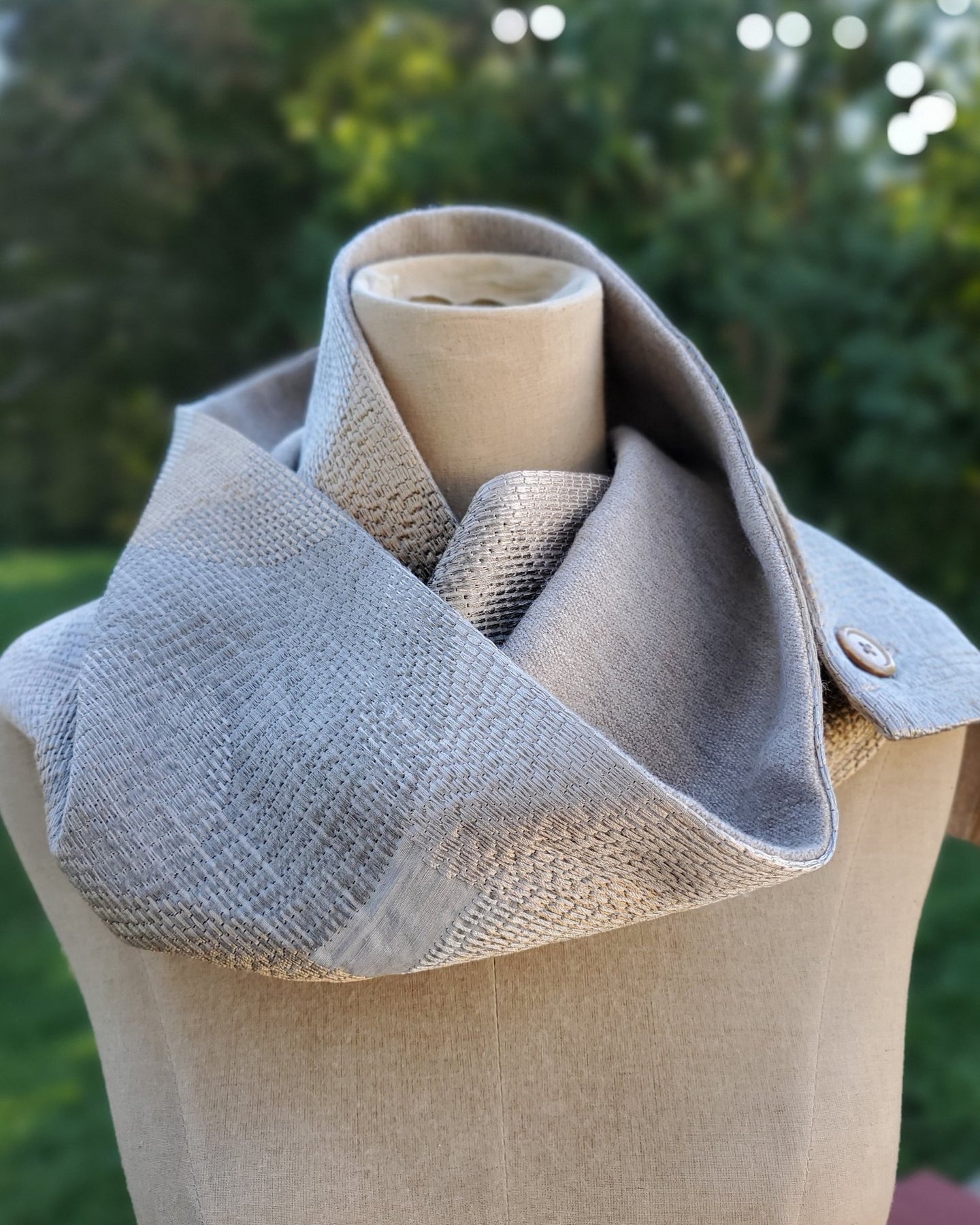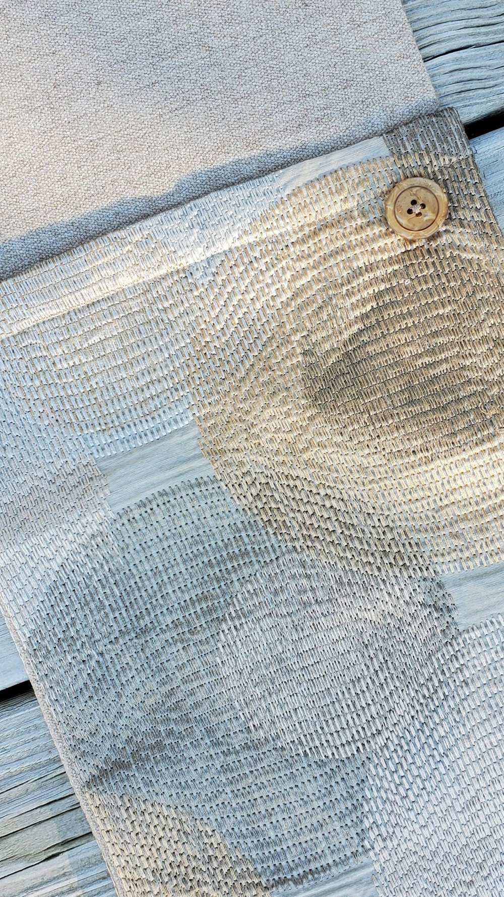 Double sided ~ taupe, cream, brown & gold embroidered Geo Circles on one side and a stunning high thread count woven tan wool contrasting color. The combo is just stunning. The wool is the quality of fine suit woven wool and so very soft to the touch.