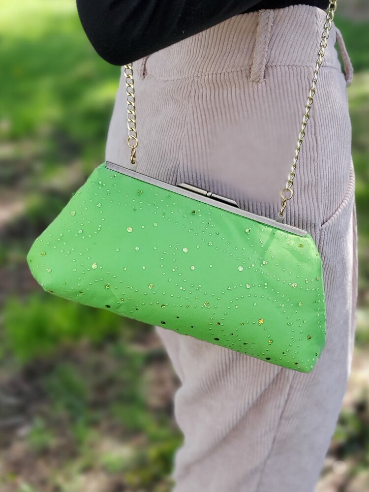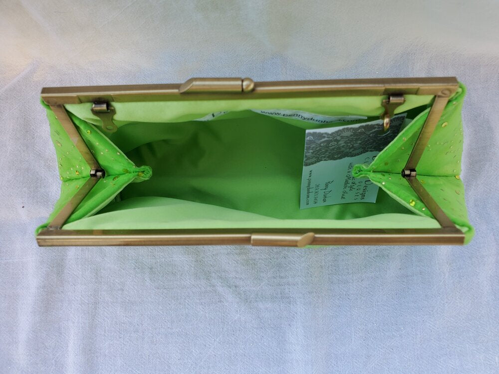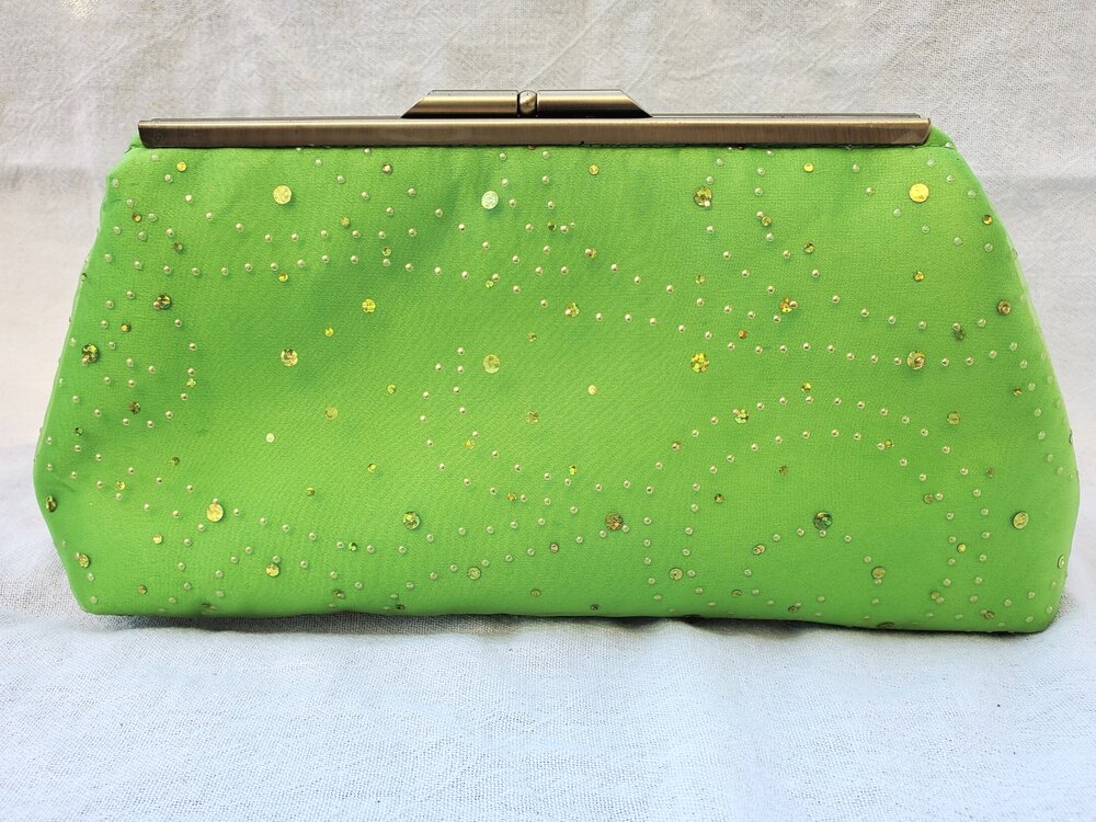 Bright green satin covered with green chiffon featuring gold dots and sequins. Bright green lining. Gold frame.