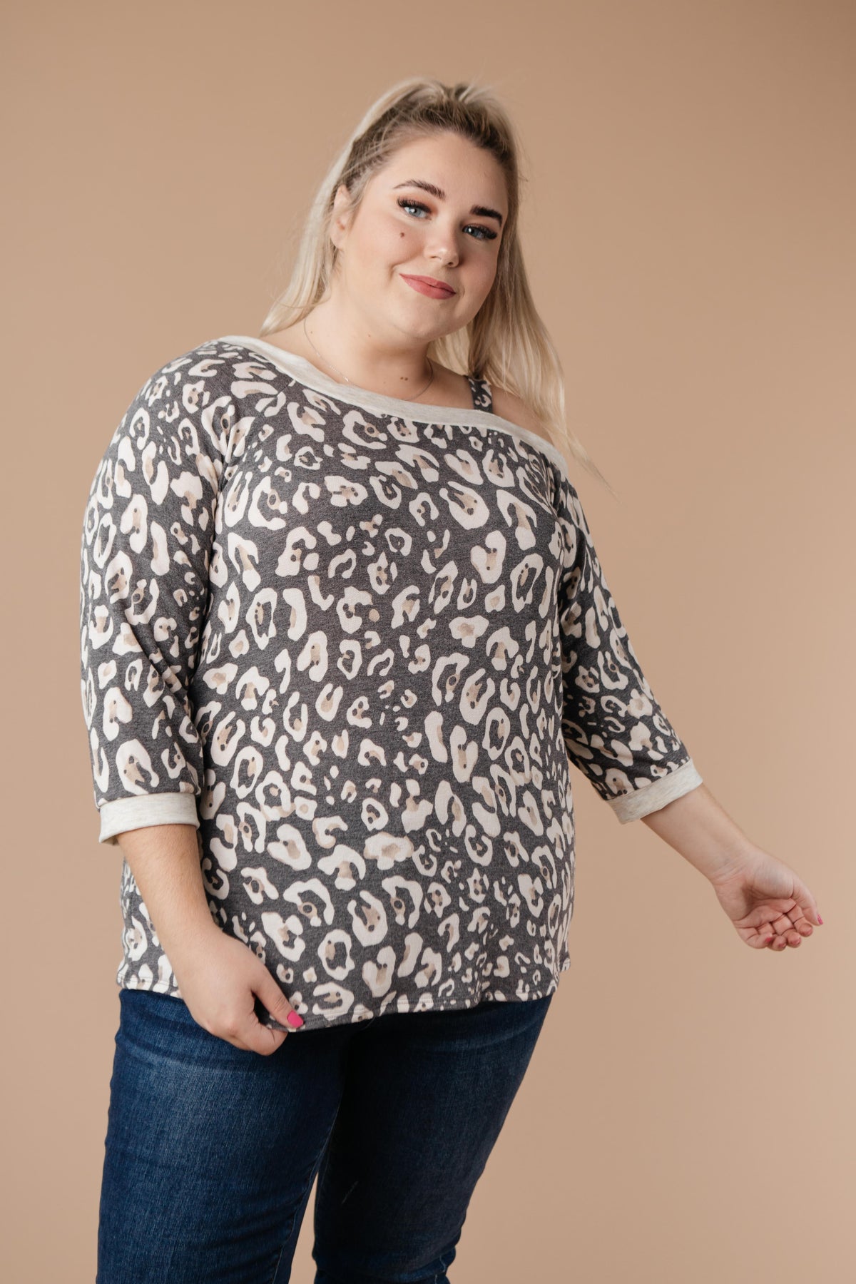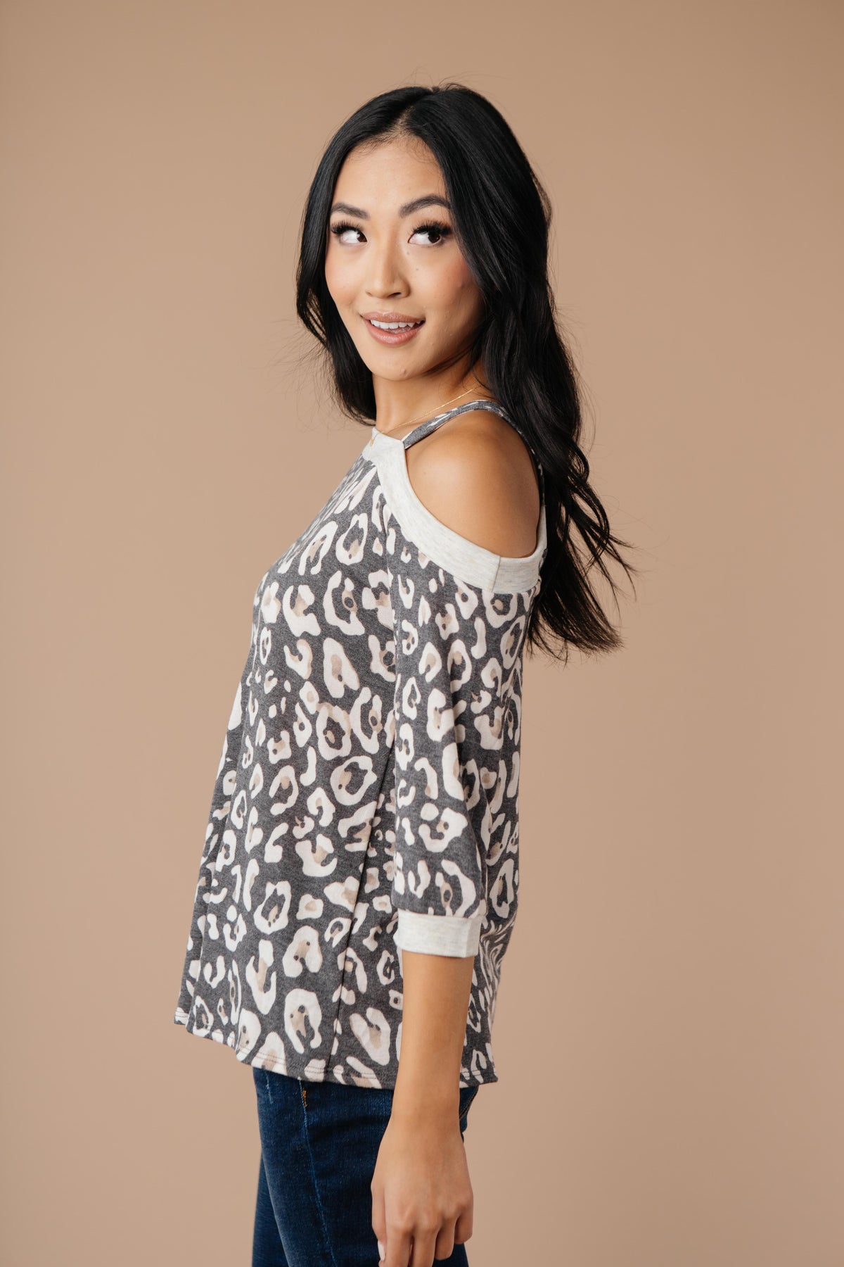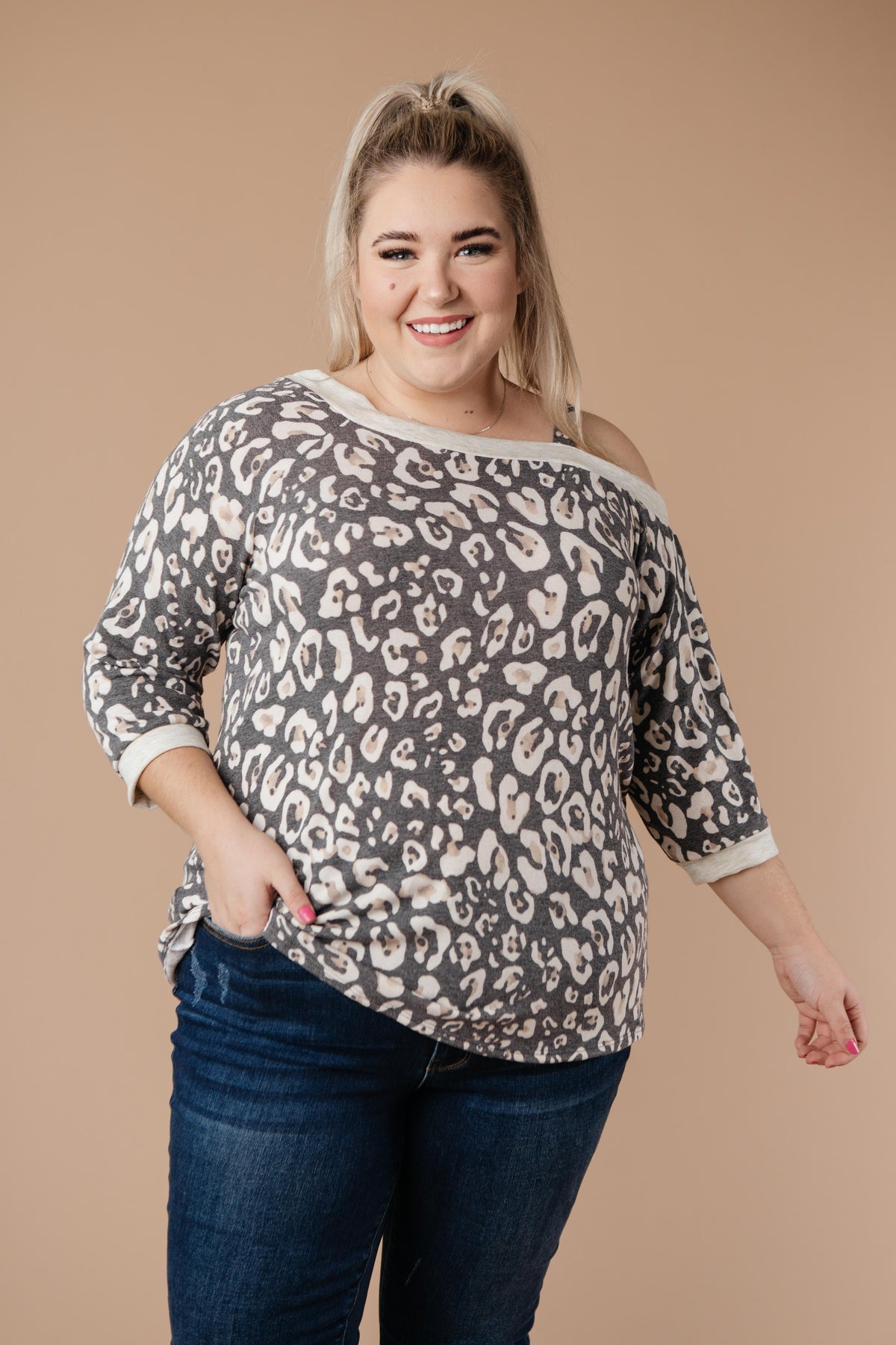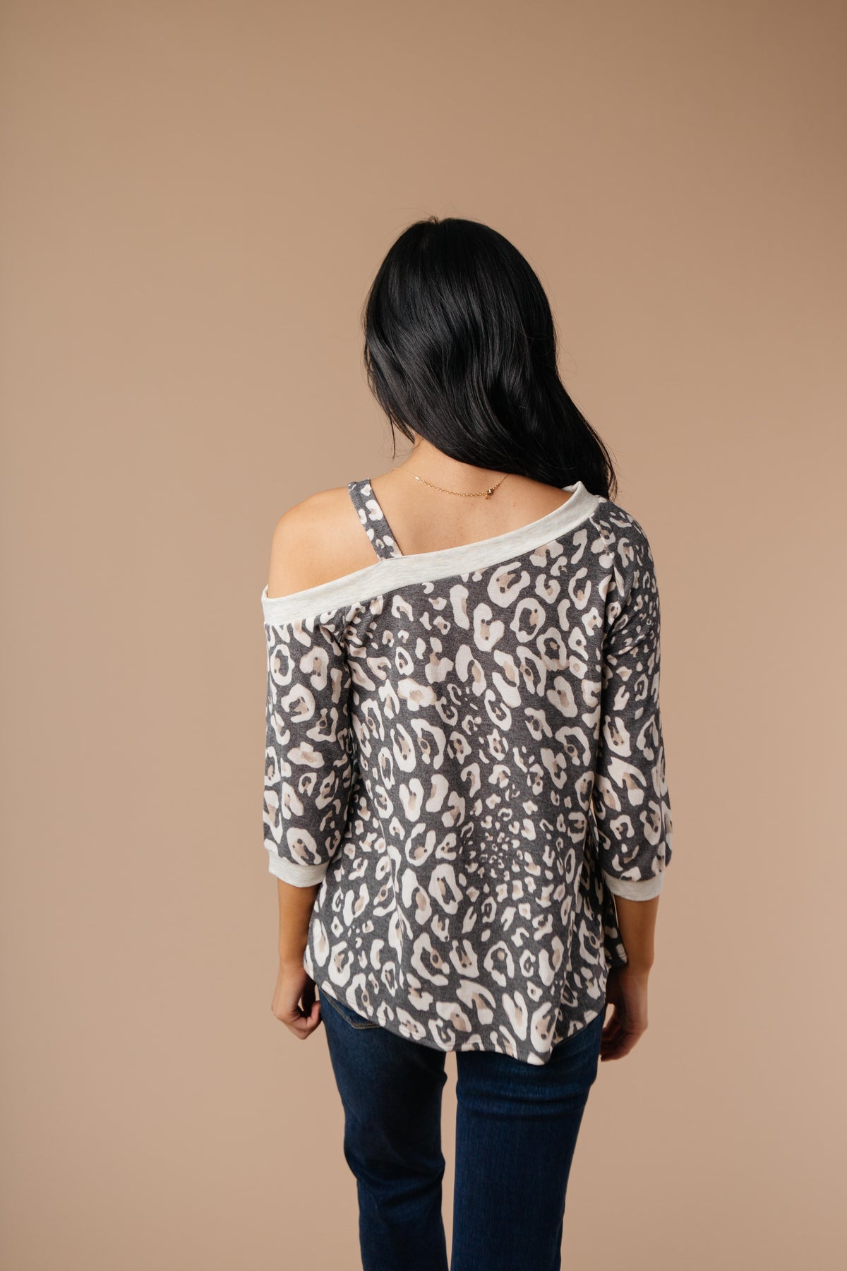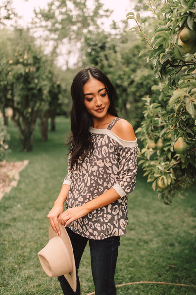 This animal print top will add bold pattern and fierceness to your wardrobe! It features a soft blend of lovely neutrals, an off the shoulder, and a slanted neckline with a strap so it stays in place! You'll adore the material and how lovely you feel while wearing it.