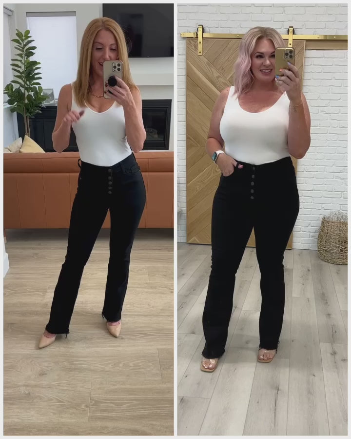 With a comfortable high rise, button fly, bootcut style & raw hem, these timeless jeans add a subtle texture and rich black color to your wardrobe. A must-have for any fashionista!