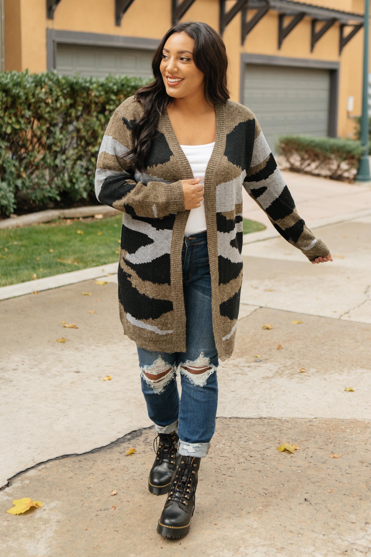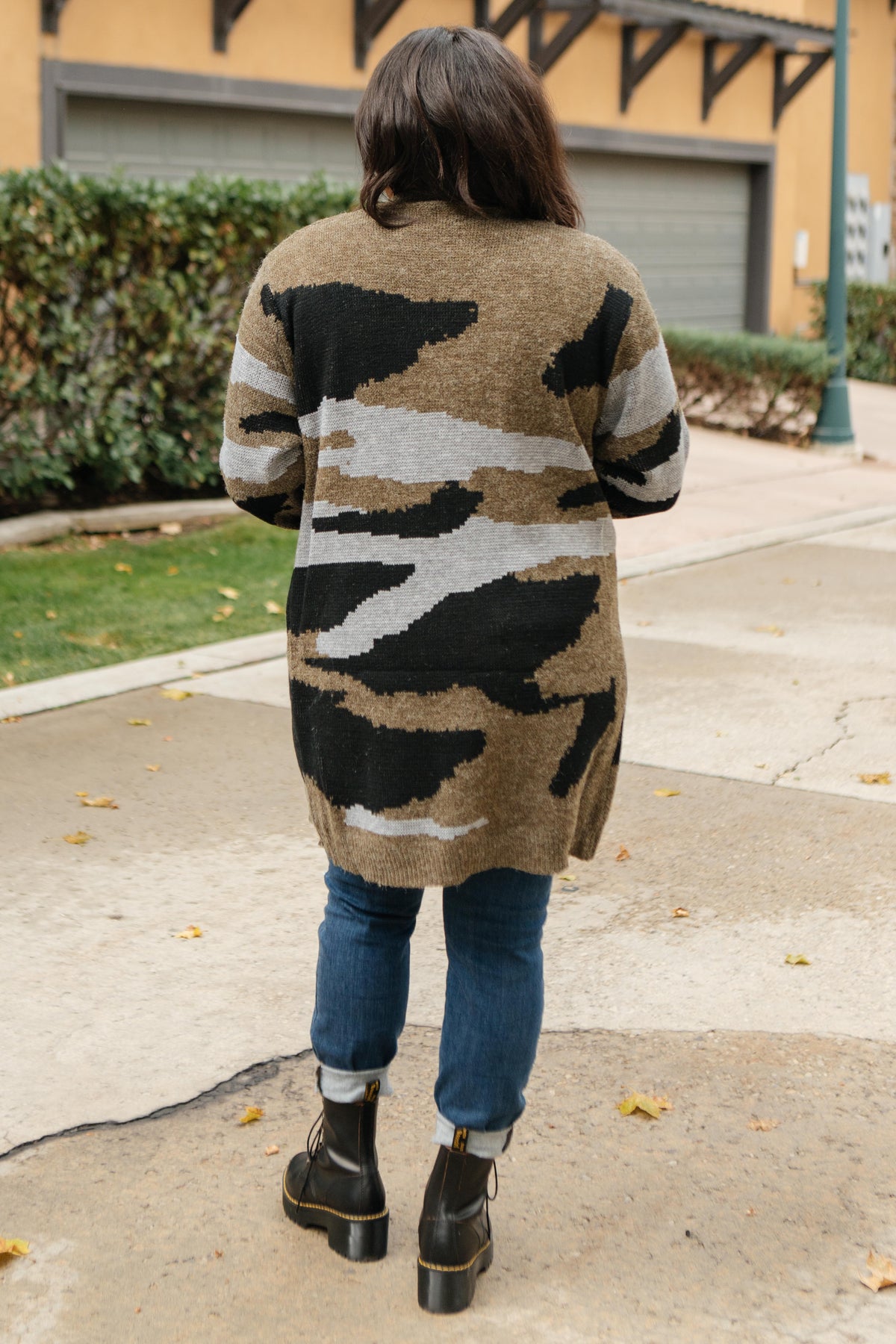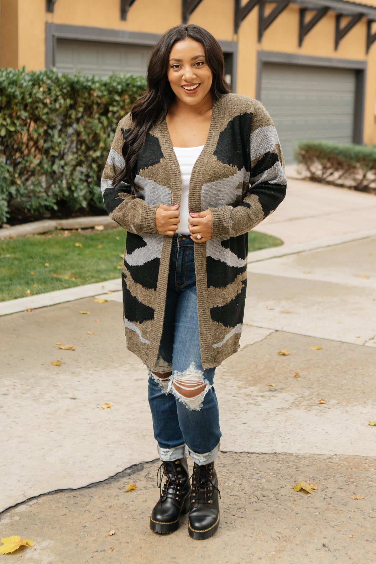 Say hello to my new favorite cardigan! Take your outfit to a whole new level of awesomeness with this oversized camo sweater cardigan. The cut is basic and militarily no-nonsense. The pattern is the antithesis to that....it's simply fabulous! The oversized knit pattern is woven in shades of black, gray, and olive green. It makes a bold statement! Try layering it over a graphic tee or an unexpected brightly colored top.