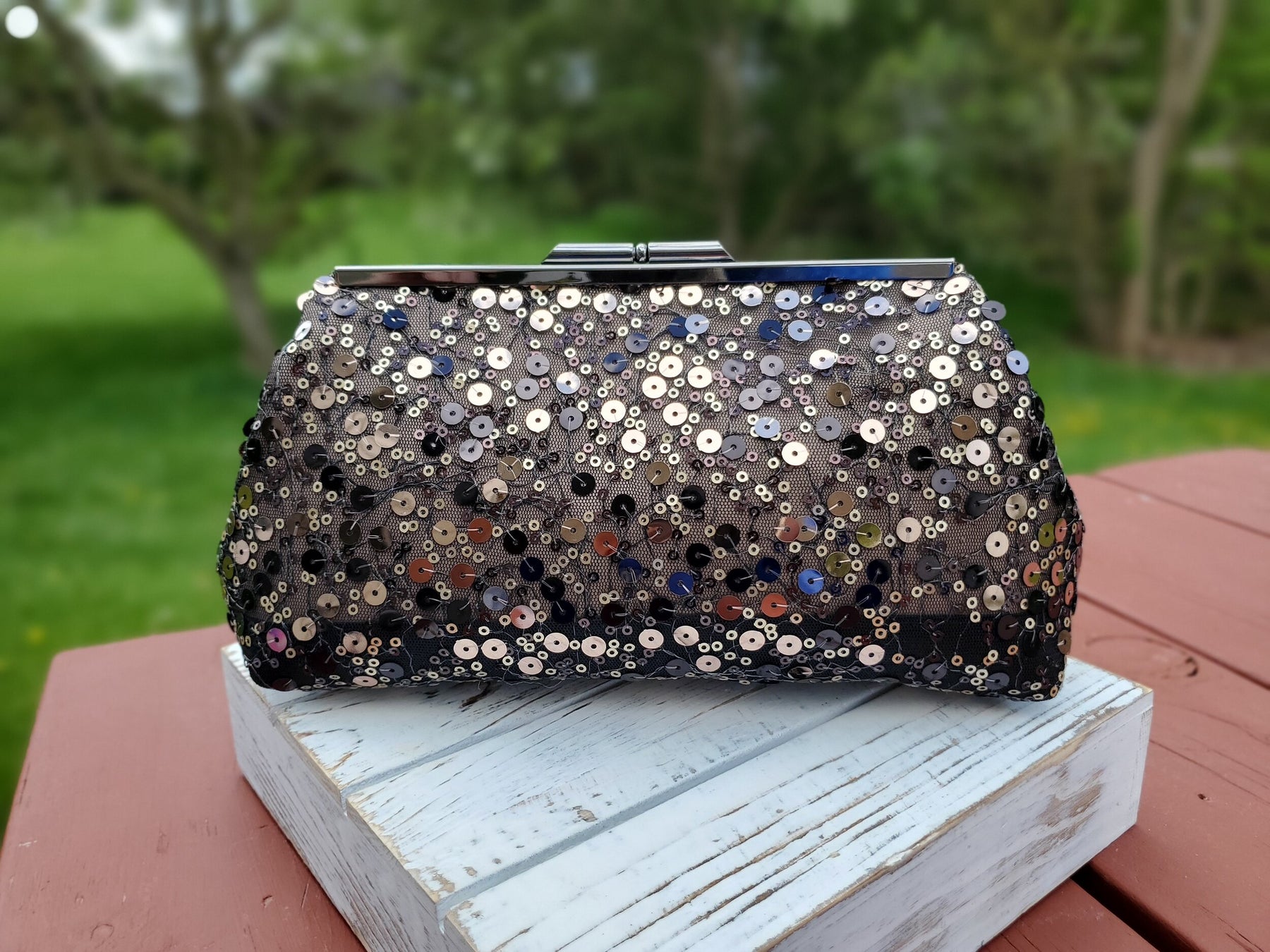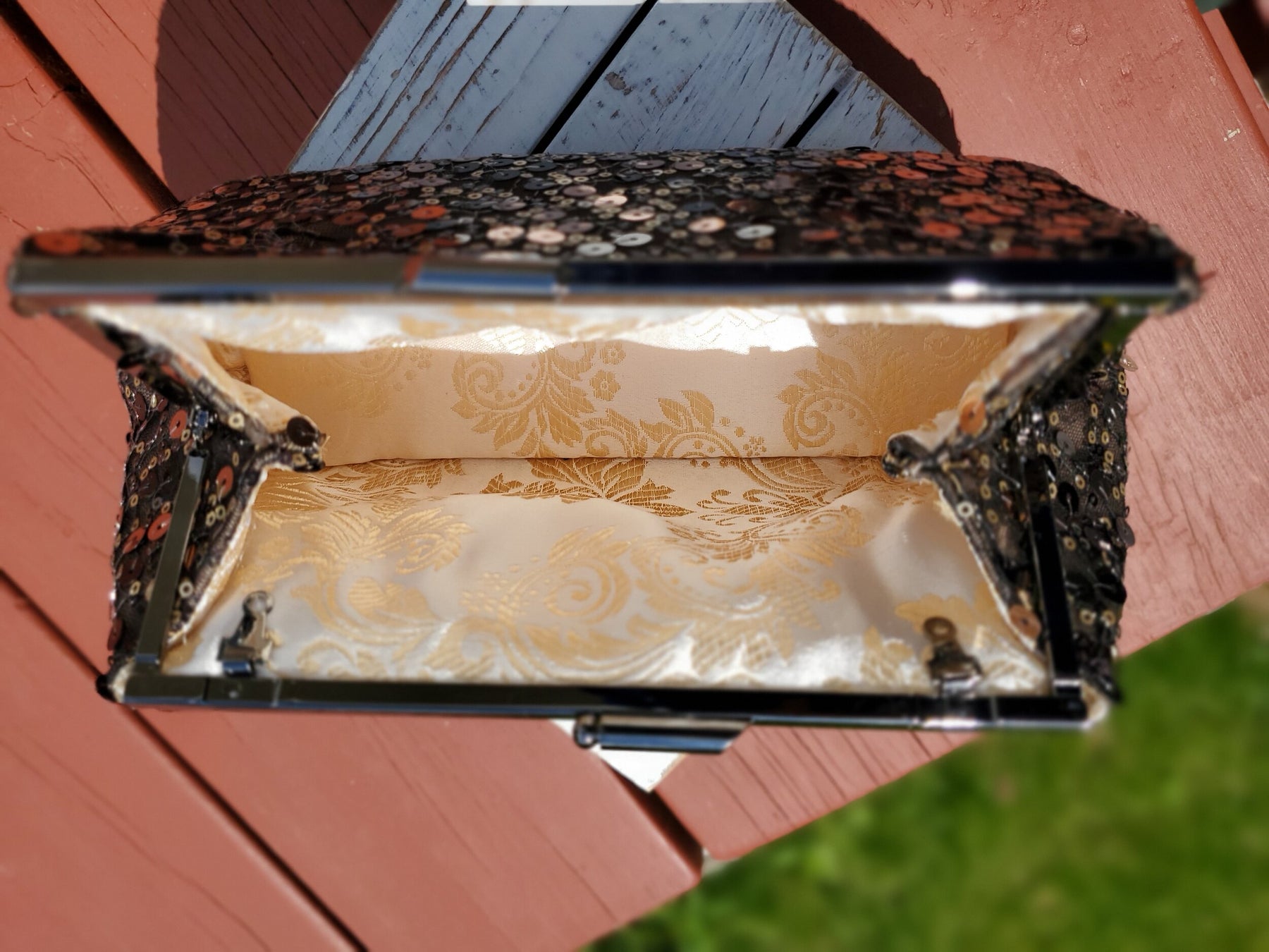 A Black/Gold sequined outer with gold brocade lining, gunmetal frame makes this evening clutch the perfect accessory to carry your essentials in style.