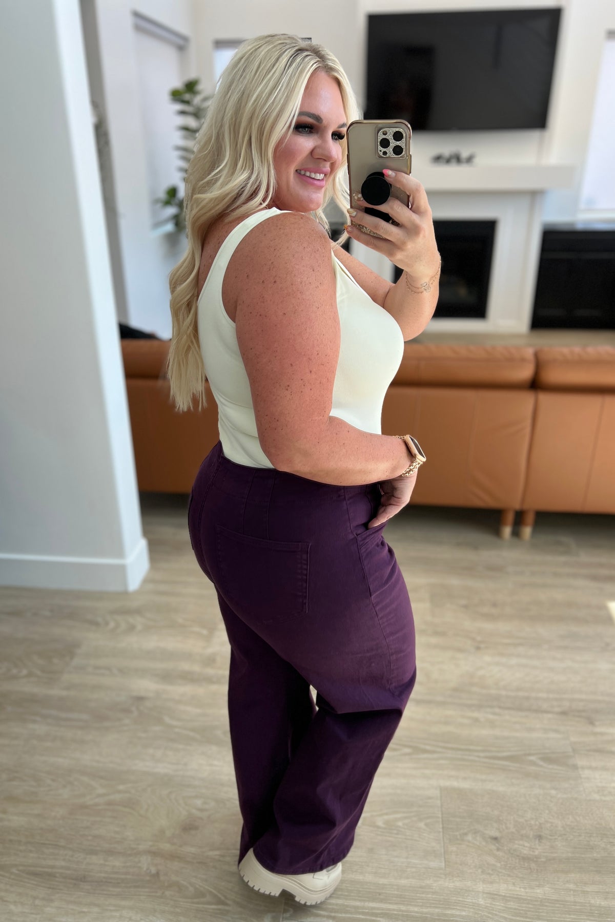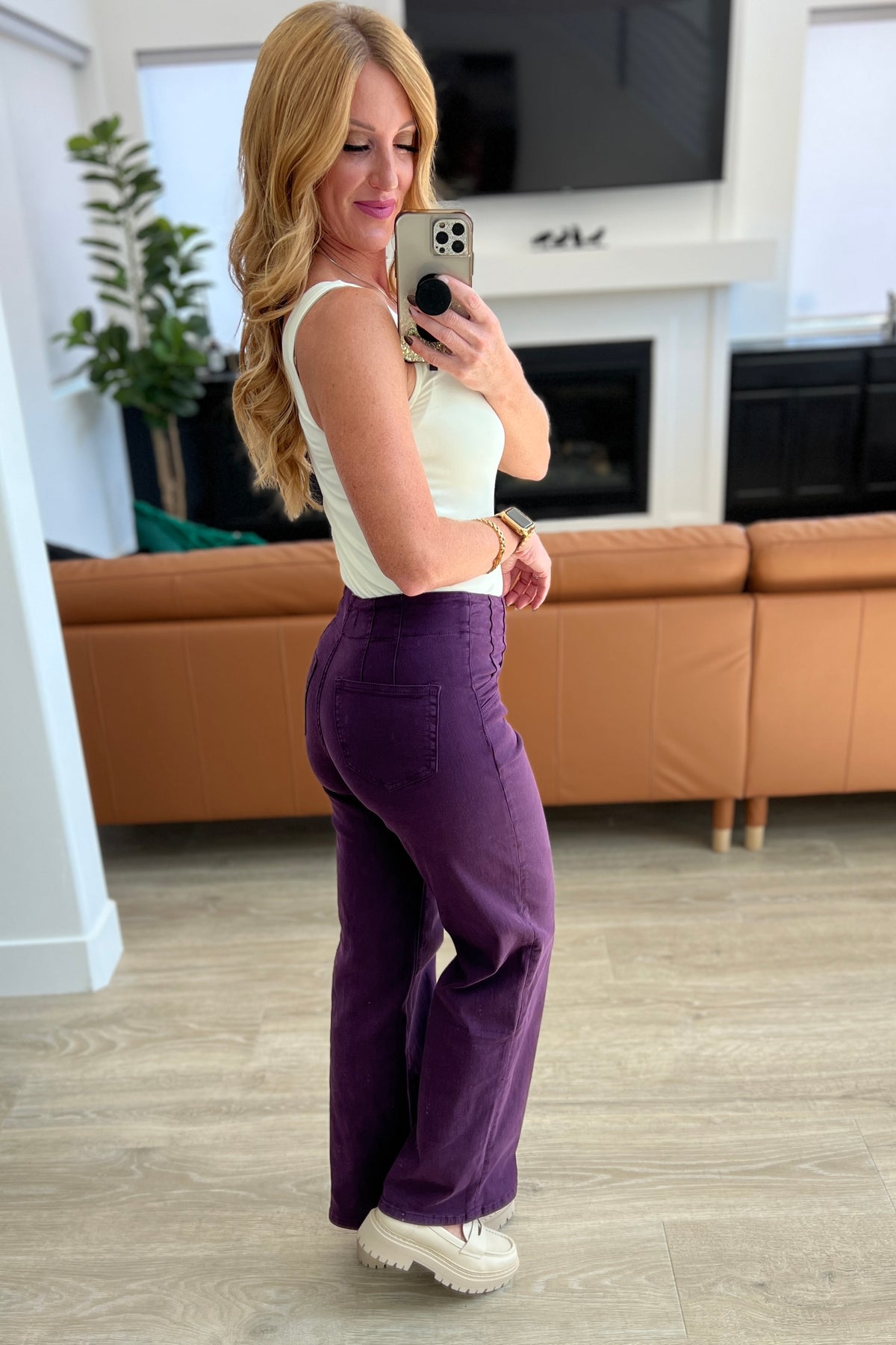 Treat yourself to a timeless style with our PLUM color High Rise Wide Leg Jeans. Comfort meets sophistication in this modern design, featuring a tailored waistband, welted pockets, double button waistband, and contour seaming for an ultra-flattering fit. The deep plum hue offers a refined look that never goes out of style. Ready for a new denim staple? Look no further.