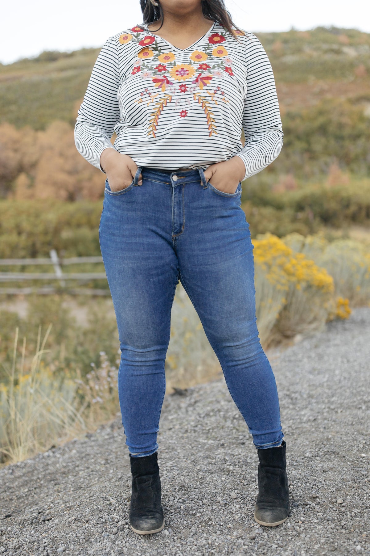 Sometimes a girl just needs a new pair of jeans with nothing destroyed on them! I'm talking about no rips, tears, or distressing insight. These jeans are incredibly business casual and work-appropriate, as well as great for everyday wear. They are a light wash denim and feature a mid-high rise with lots of stretch through the waist and hips.