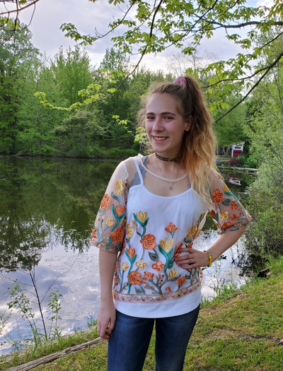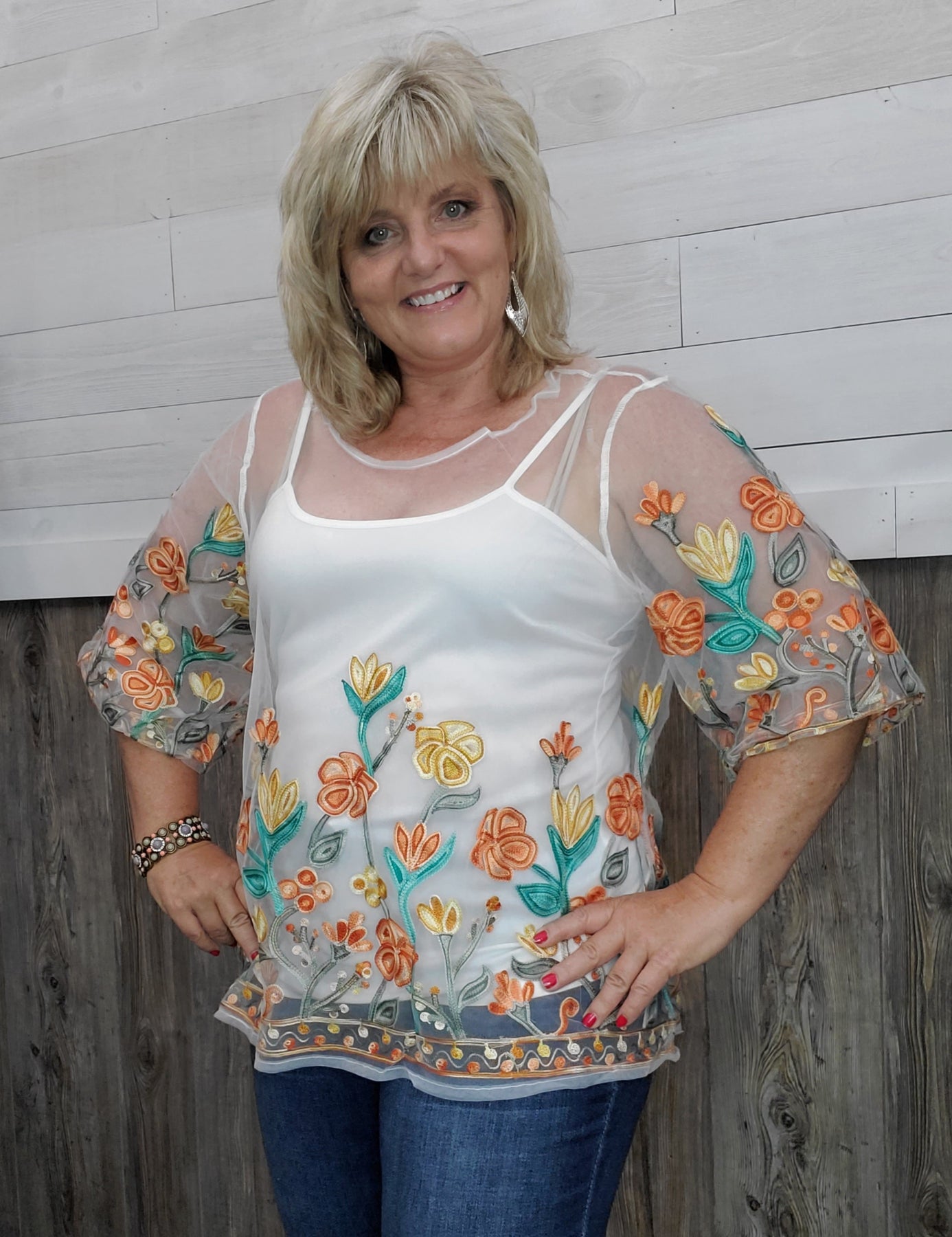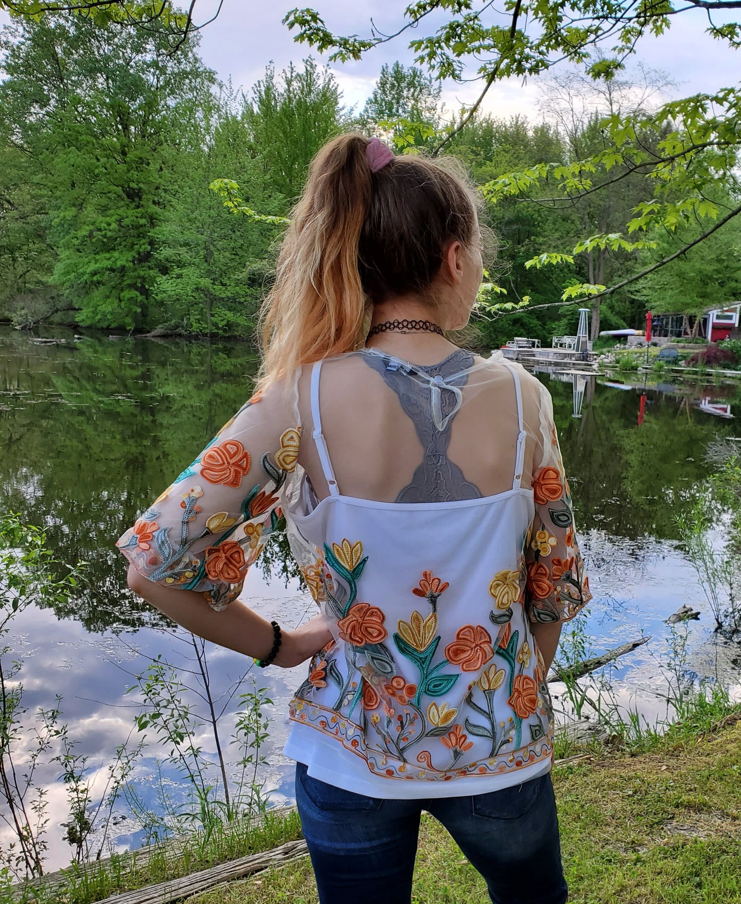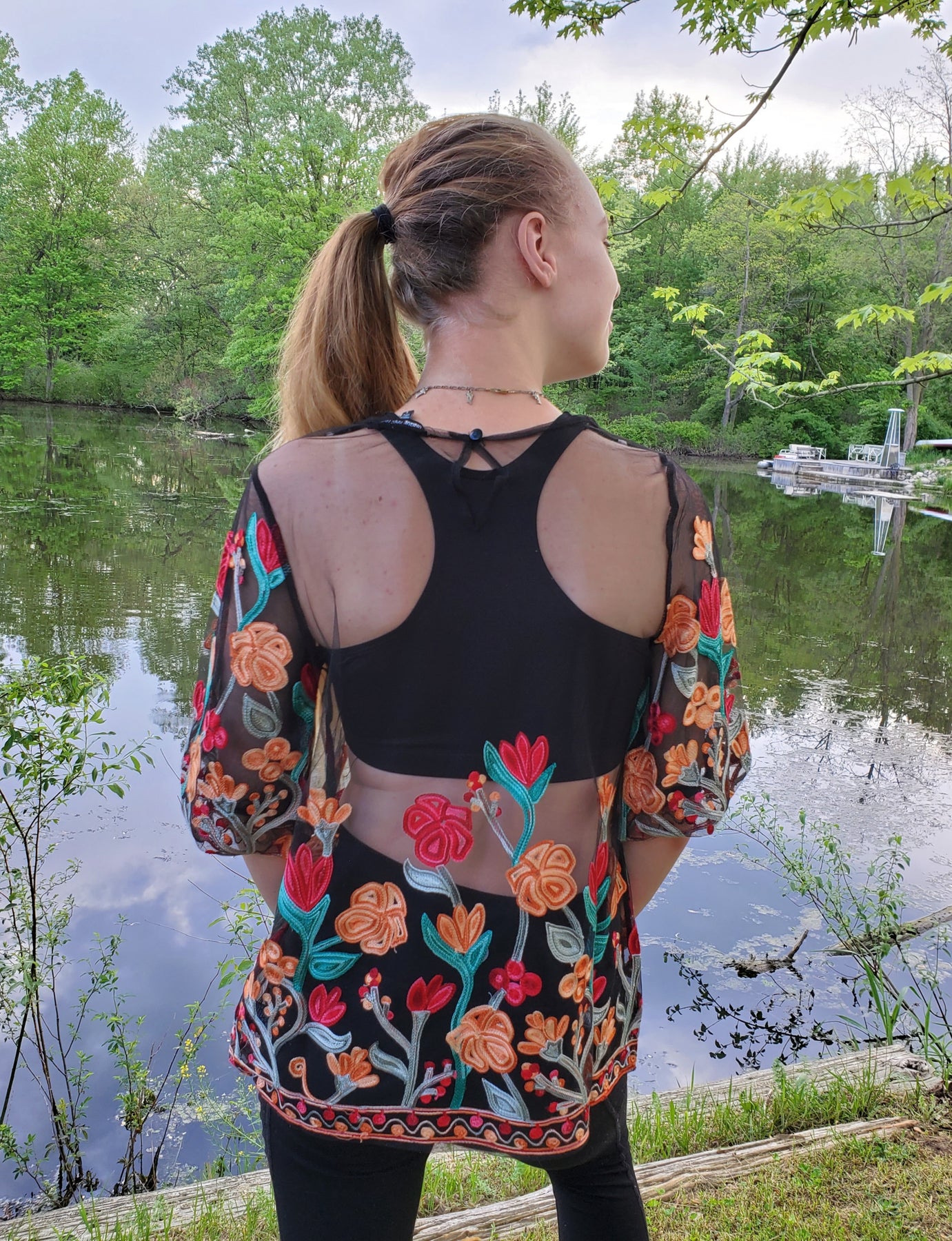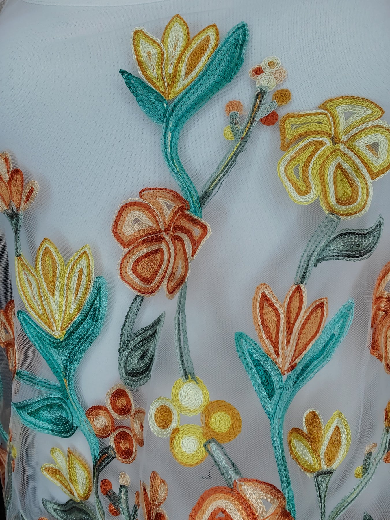 So cute ~ and the feminine.  Warp yourself up with amazing machine embroidered chain stitching in an array of summertime garden flowers.  Bright crisp colors against either a white (nearly clear) or black background.  Sassy, fun and unique!