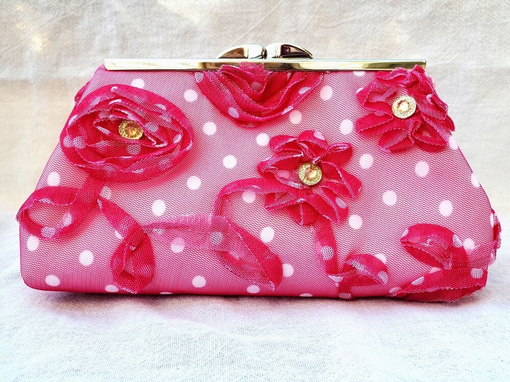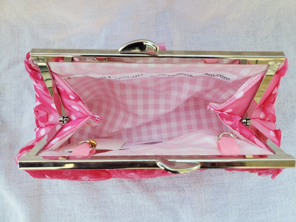 Pink satin overlaid with pink/white dot netting featuring darder pink ribbon flowers and crystals. Pink/White check satin lining. Silver frame.