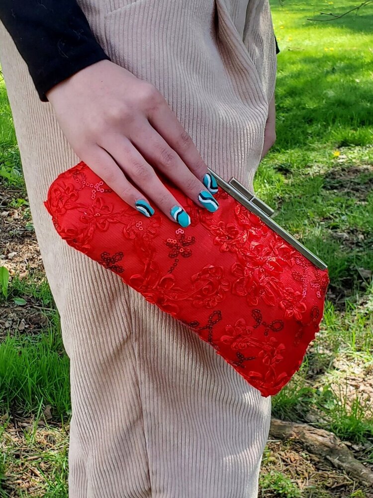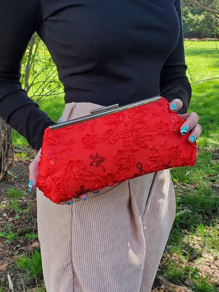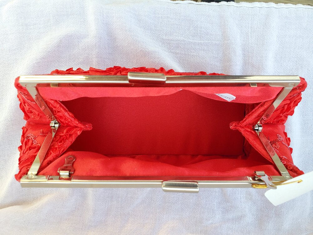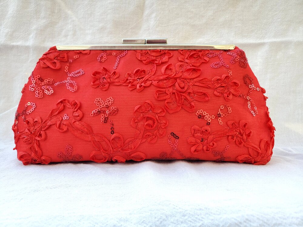 Red satin overlaid with red netting featuring ribbon embroidery and sequins. Red lining. Silver frame.