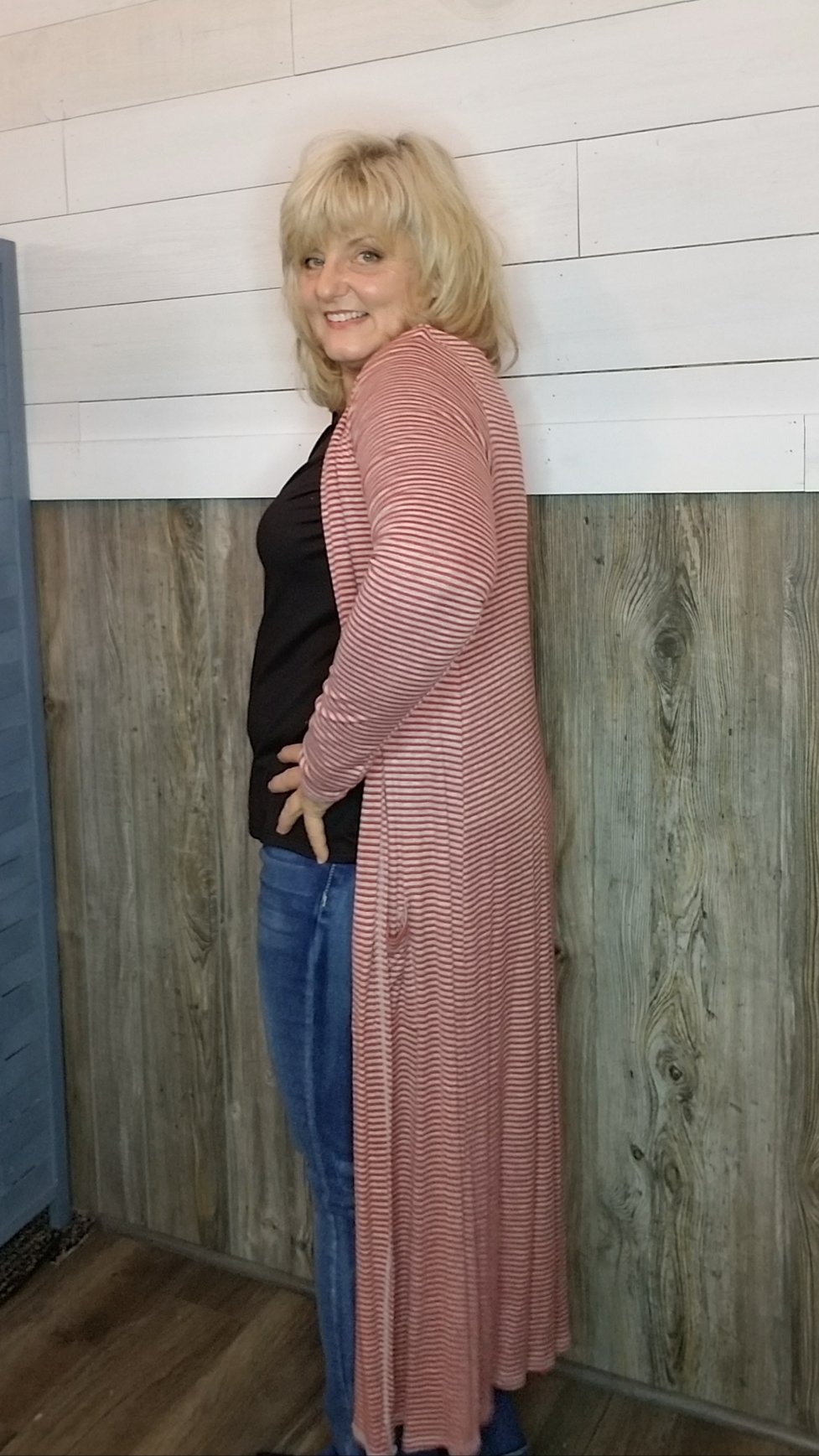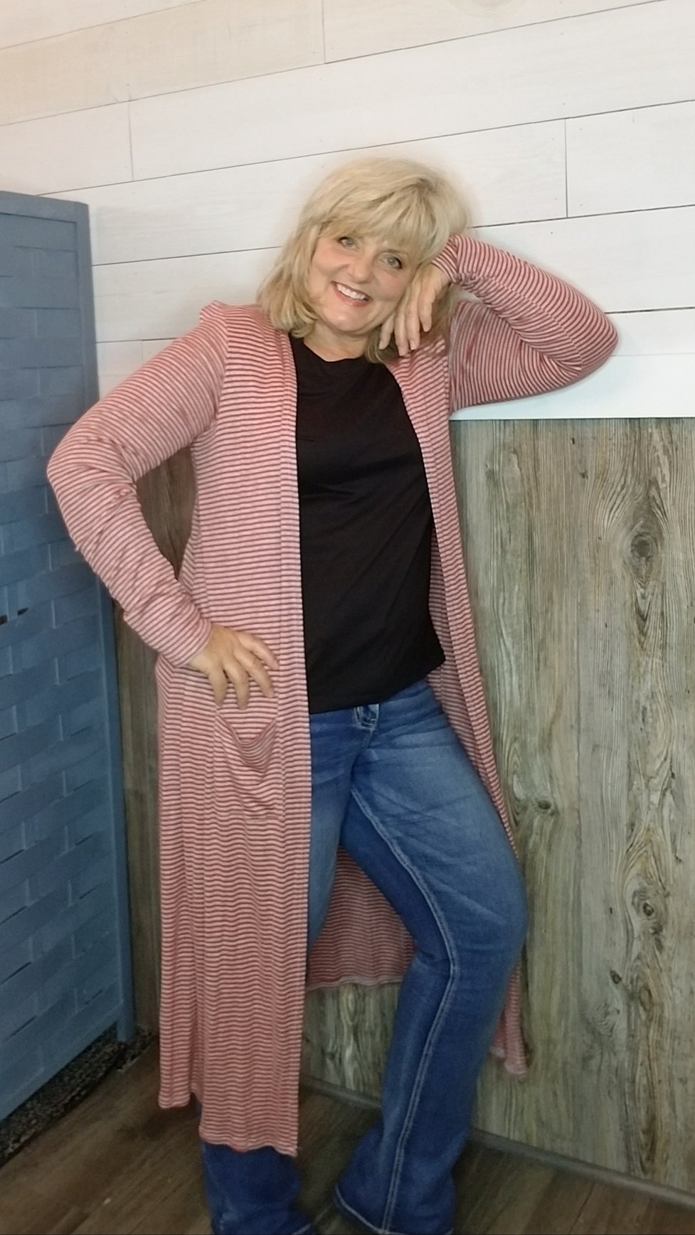 I don't believe I've ever seen a ribbed waffle knit duster ... until now that is! In rust and a heather grey stripe none the less! POCKETS! Rayon and spandex! And a looker! That's a lot of exclamation points! 😉 Fits true to size.