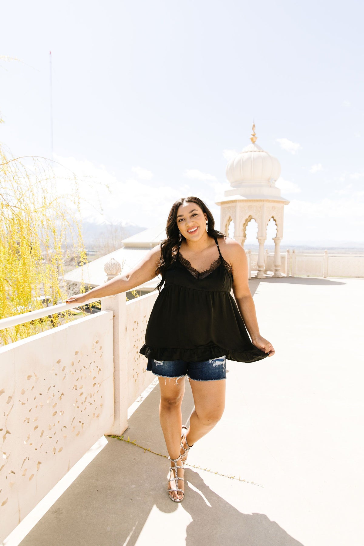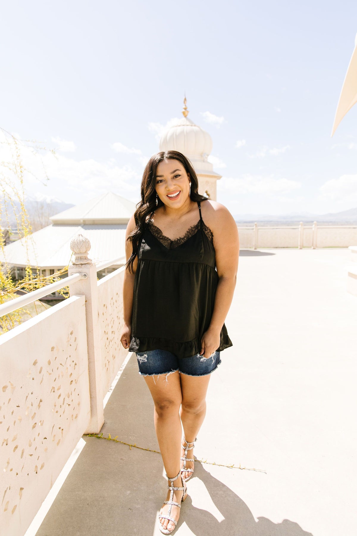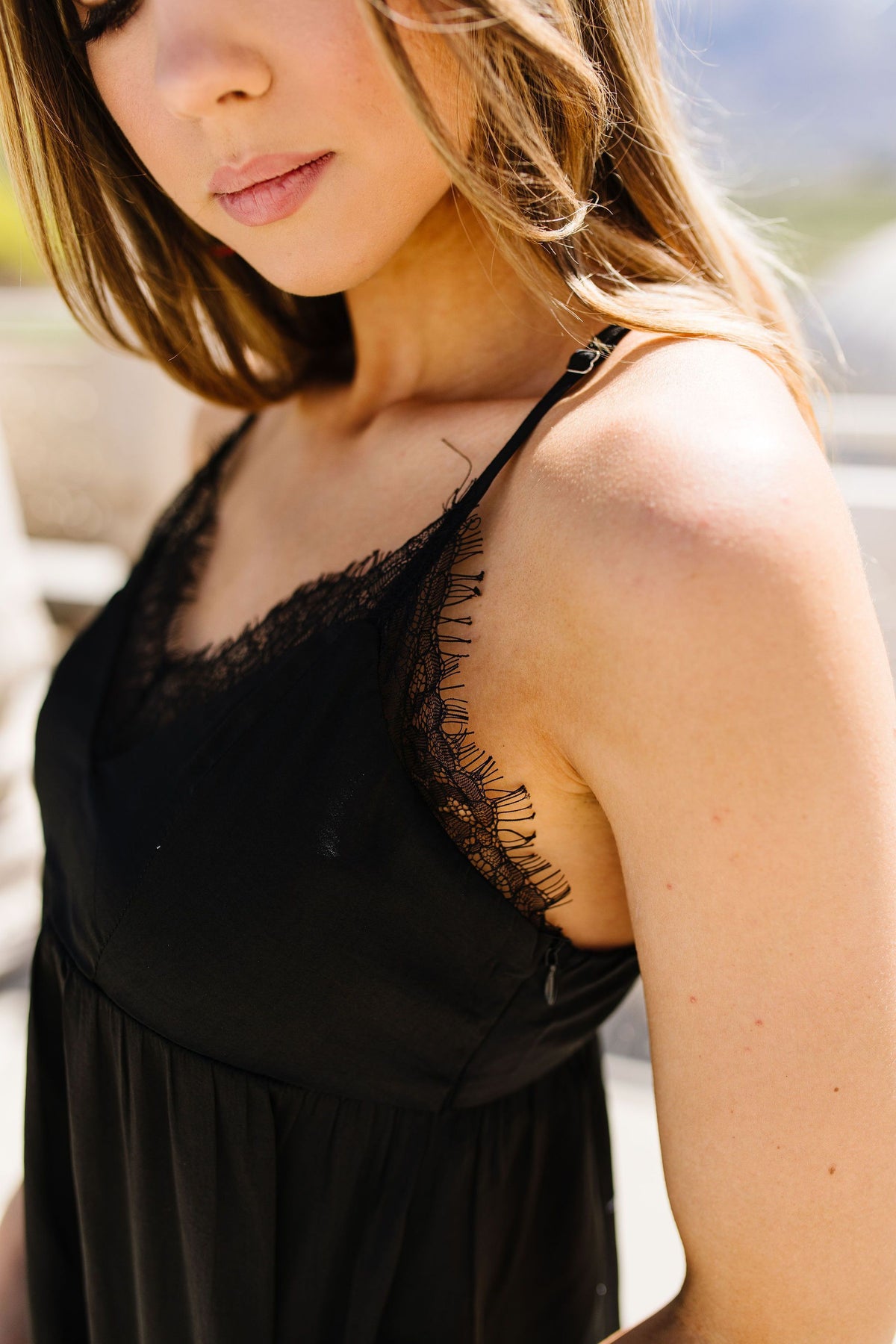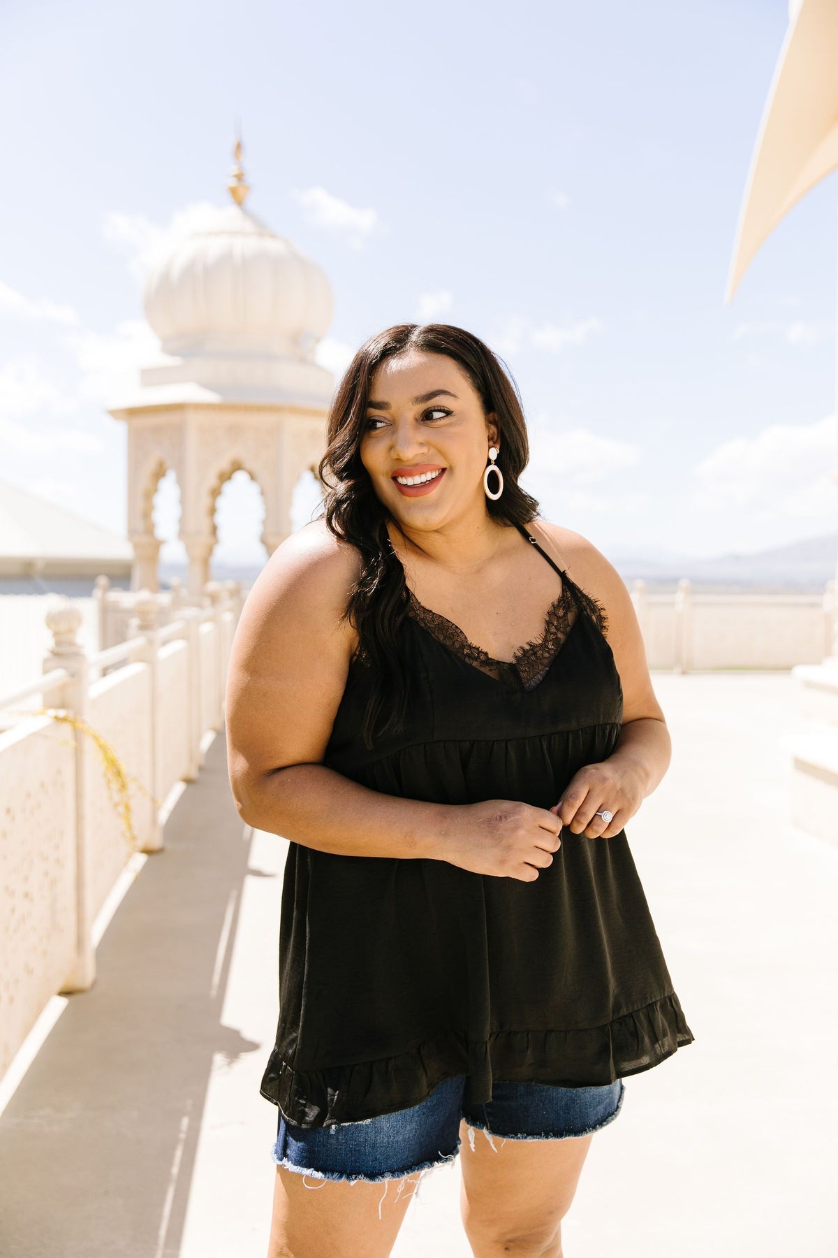 This sexy little camisole should come with a warning for the wearer….be prepared to turn heads! This alluring little number features a babydoll waistline, a ruffled hem, adjustable spaghetti straps and lots of luscious lace, accenting both the v-neckline and the alluring buttoned racerback.
