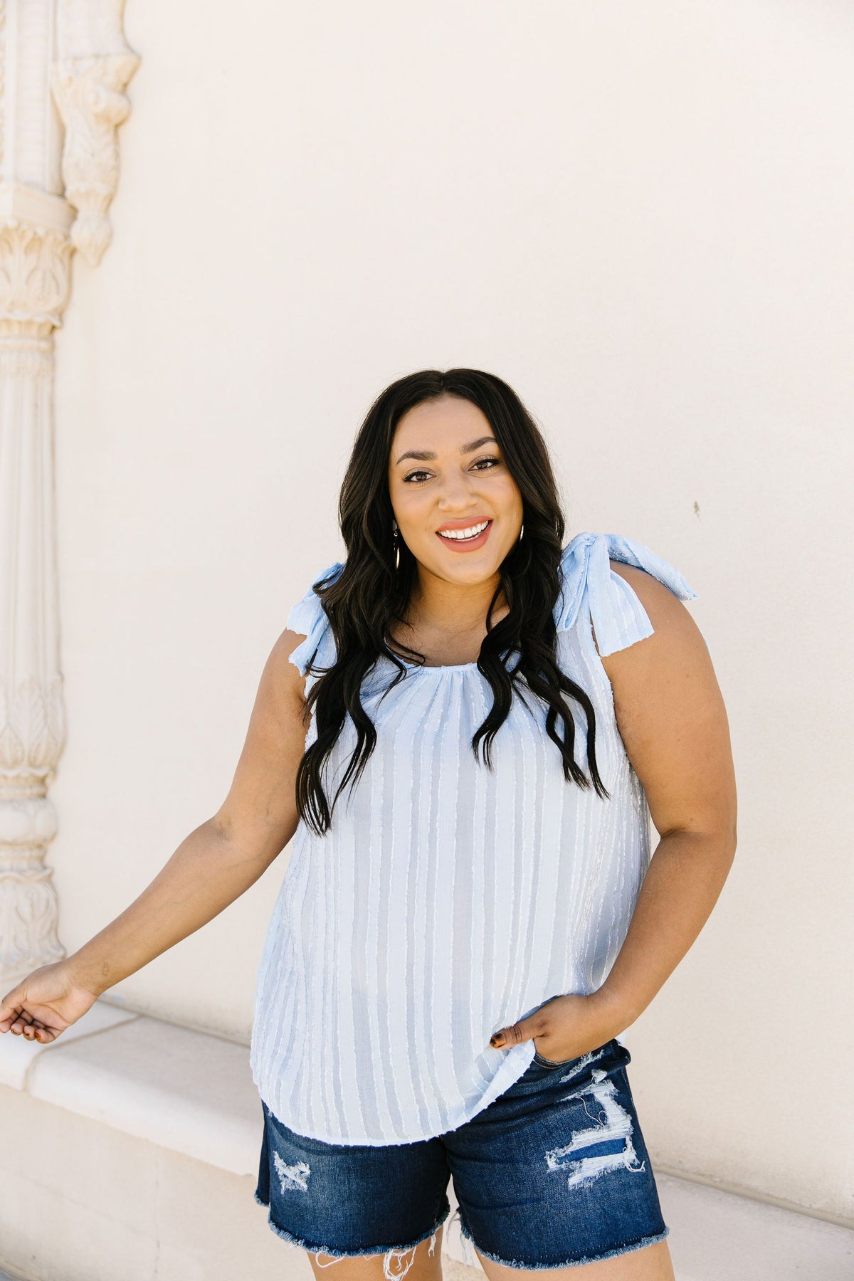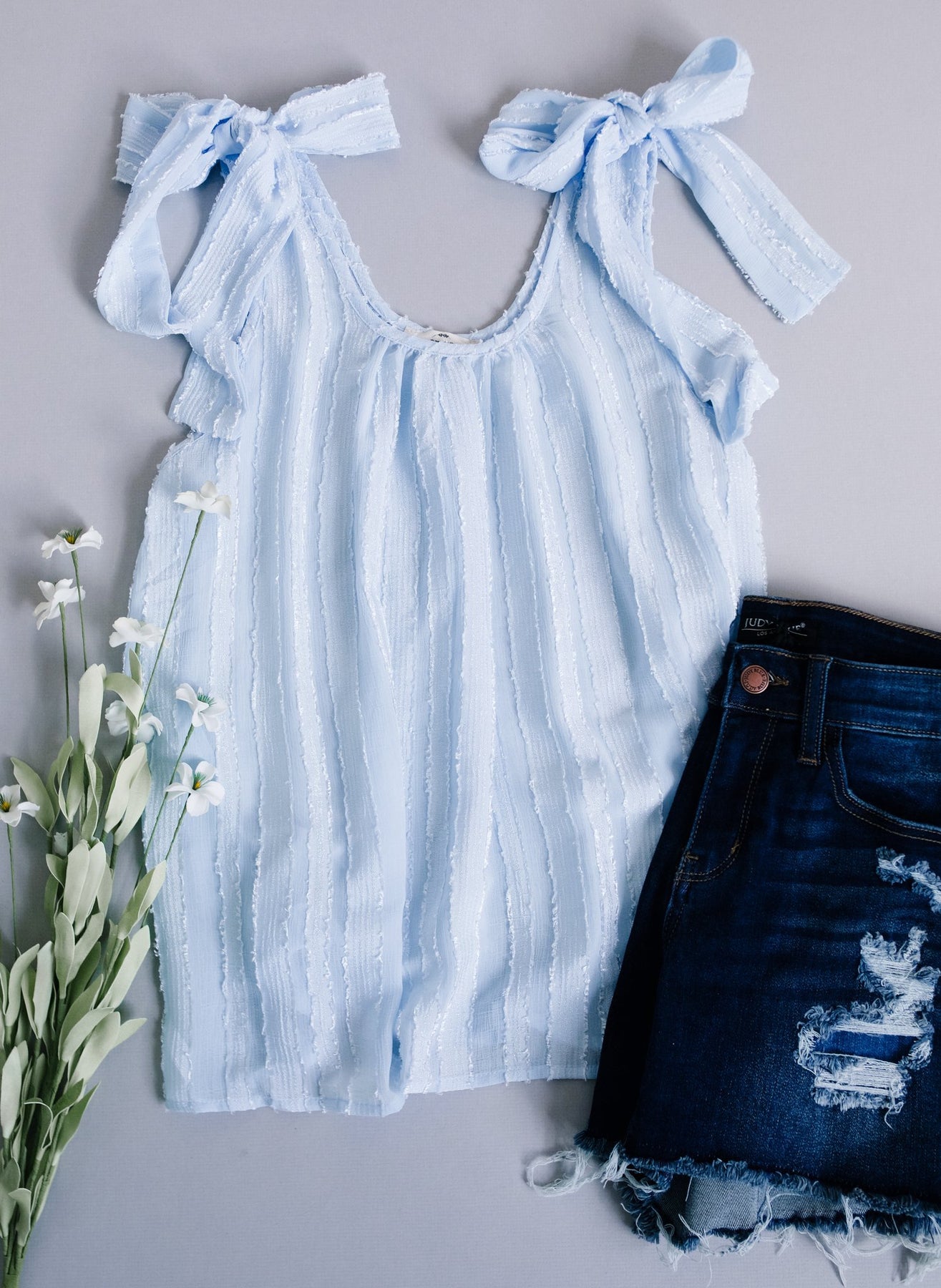 This lightweight semi-sheer chiffon top is adorned by vertical stripes that are frayed, textured, and shiny. There are pleats below the scooped neckline and oversized adjustable ties at the shoulders. It is elegant and whimsical and makes a unique addition to any wardrobe.