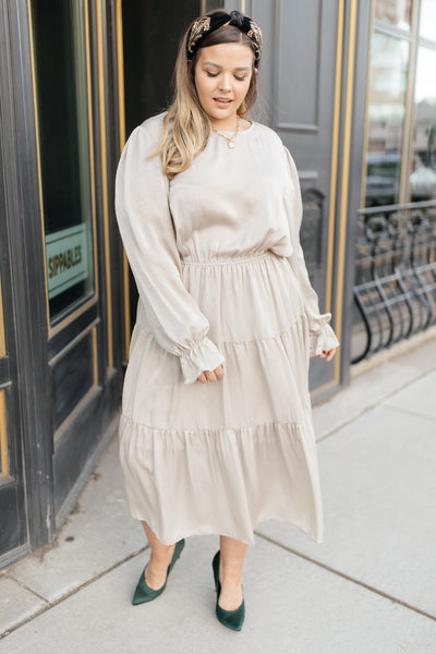 This dove colored dress is timeless. It's a lovely satin feeling material that is smooth and silky against your skin. It features an elastic waist and a twirlable tiered skirt. This dress will be perfect for just about any occasion you think of!