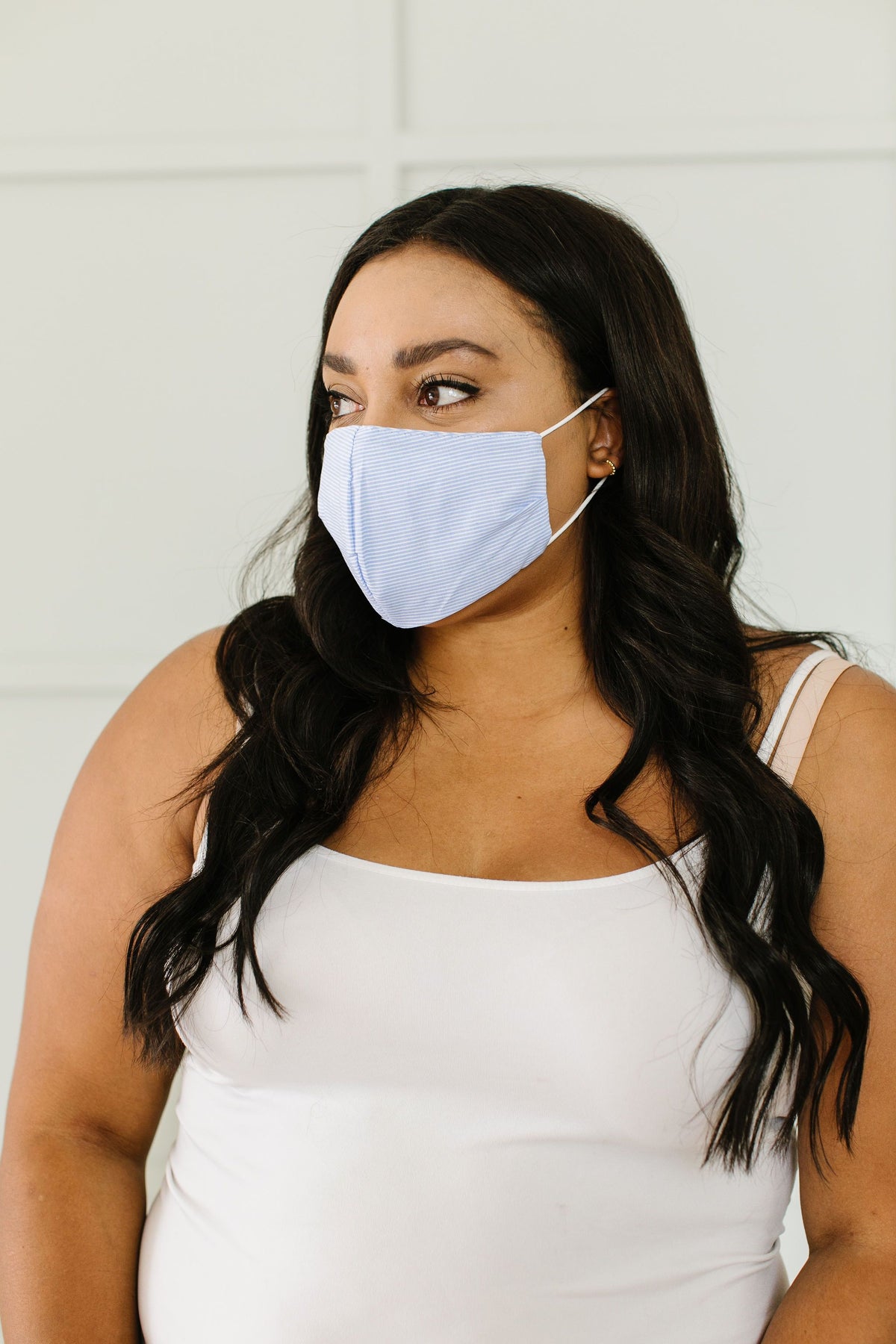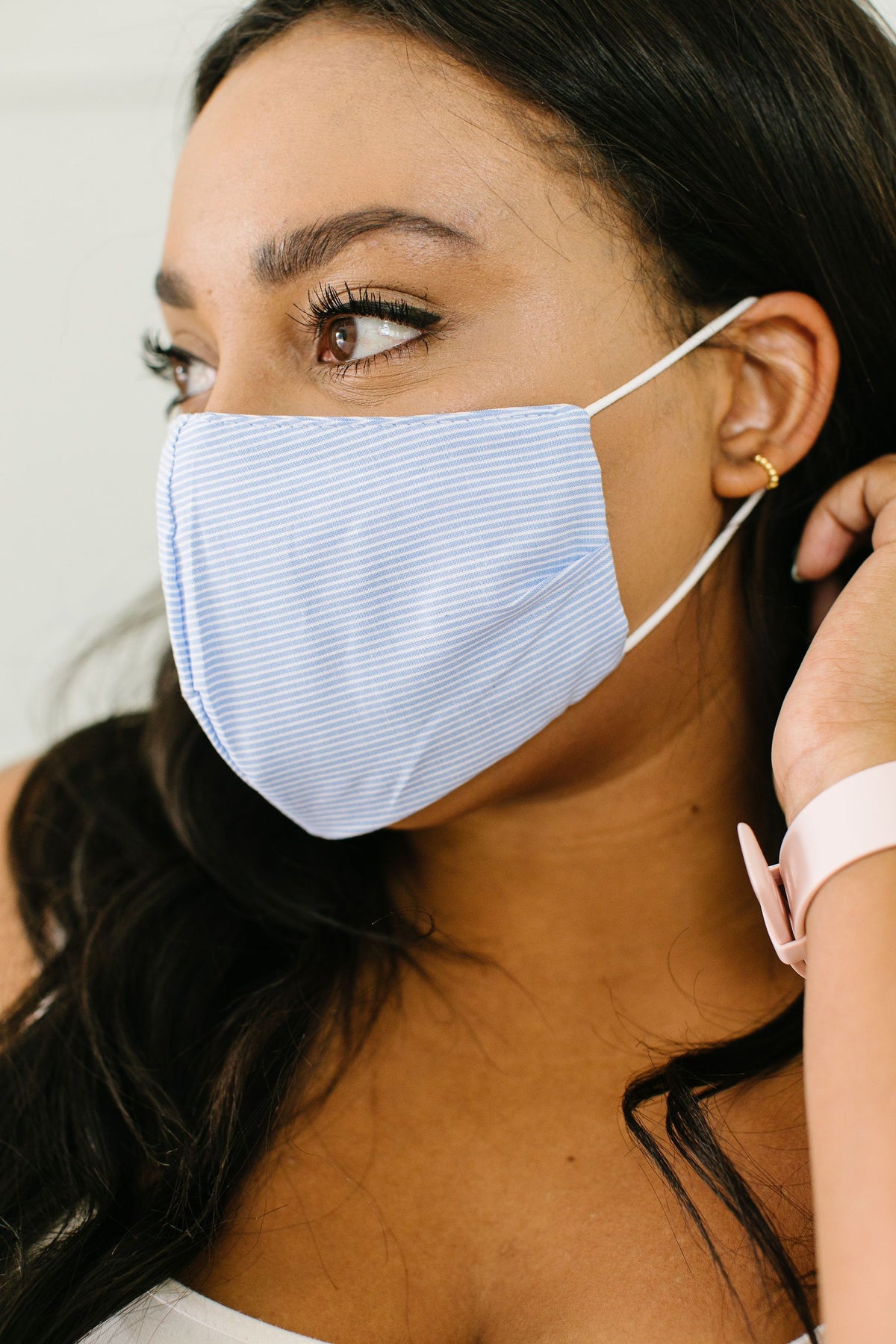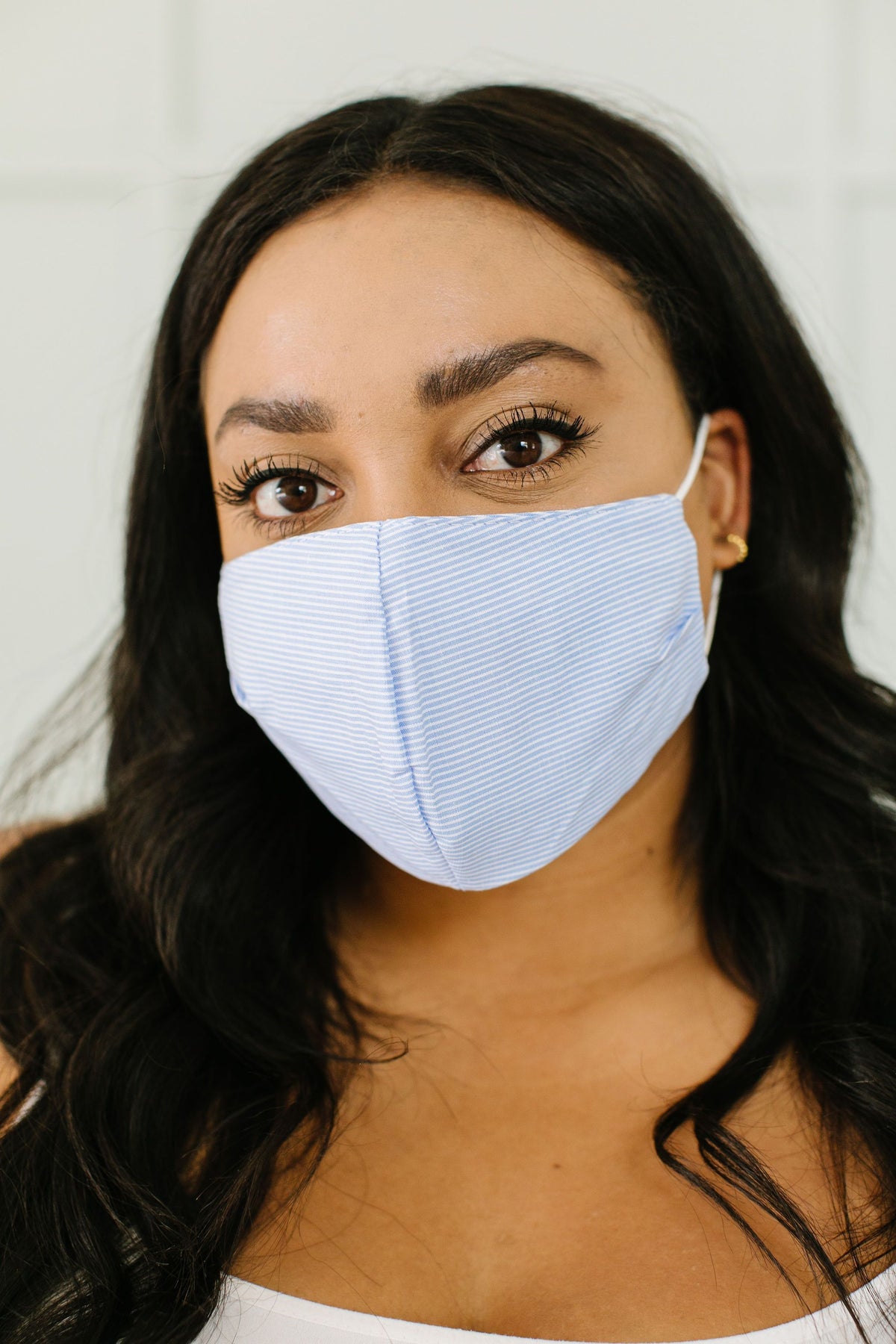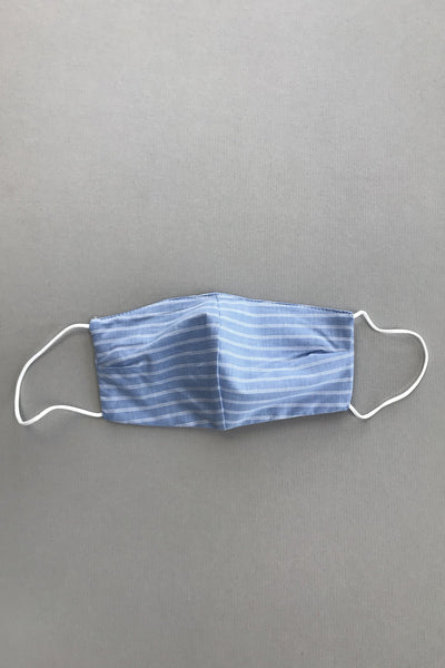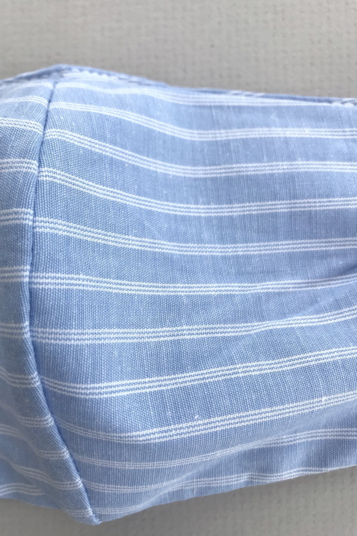 This washable face mask includes a replaceable medical grade mesh polypropylene filter, two layers of cotton fabric in narrow blue & white stripes, and stretchy elastic ear straps.