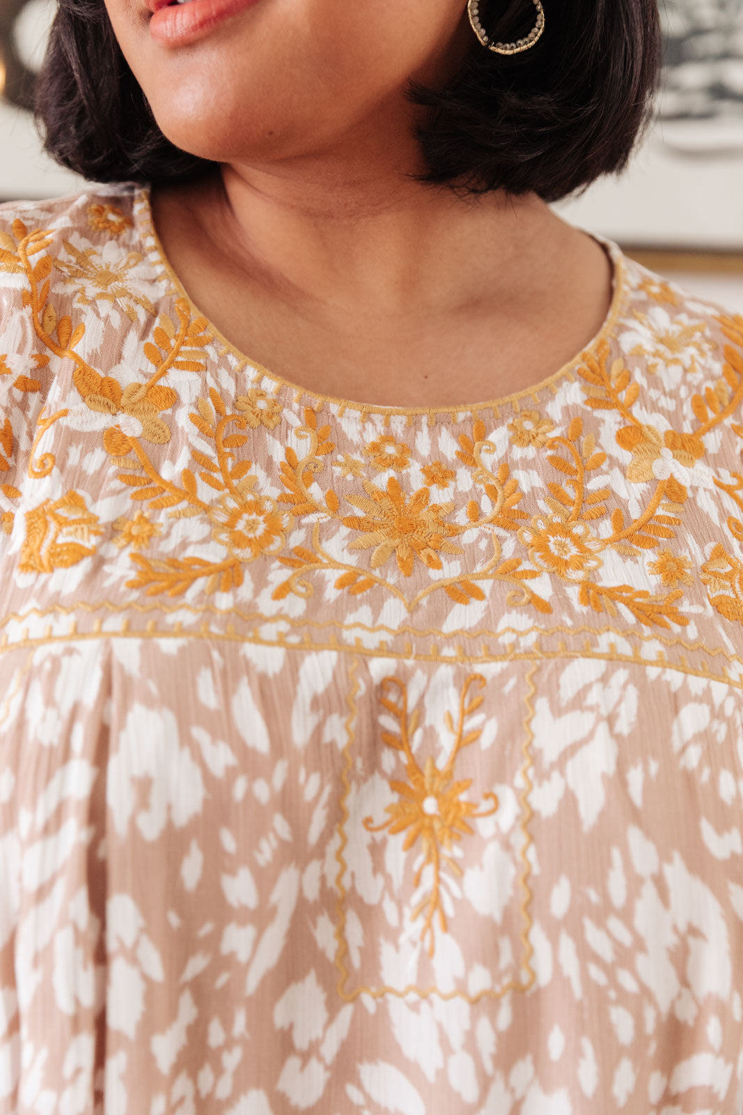 This darling top is giving us all the boho chic vibes and we couldn't be more obsessed! A stunning orange embroidered detail overlays a subtle animal print, in a flowy, long sleeve silhouette. Elastic cuffs, button opening at back, balloon sleeve, lightweight.