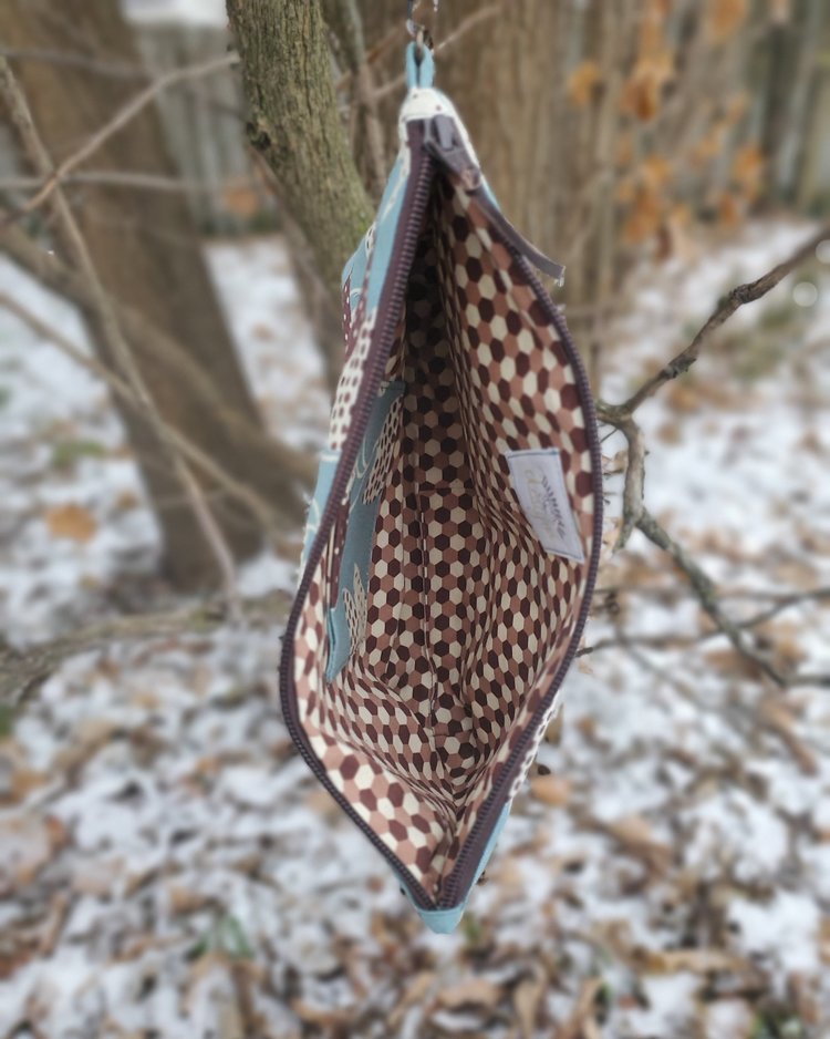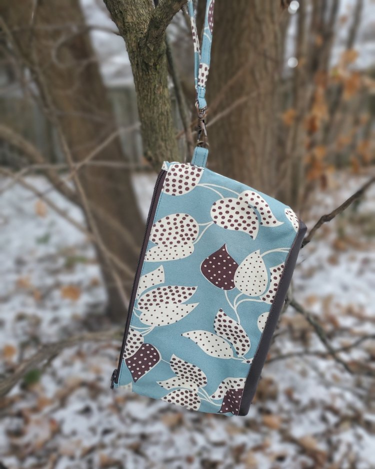 Teal with brown/white leaves upholstery weight cotton, brown leather and brown zipper outer, brown/cream honeycomb upholstery weight cotton and slip pocket lining. Wrist strap matches outer fabric.