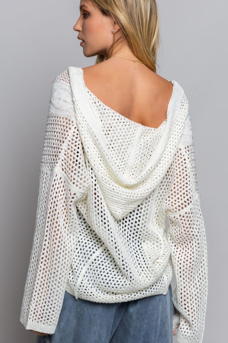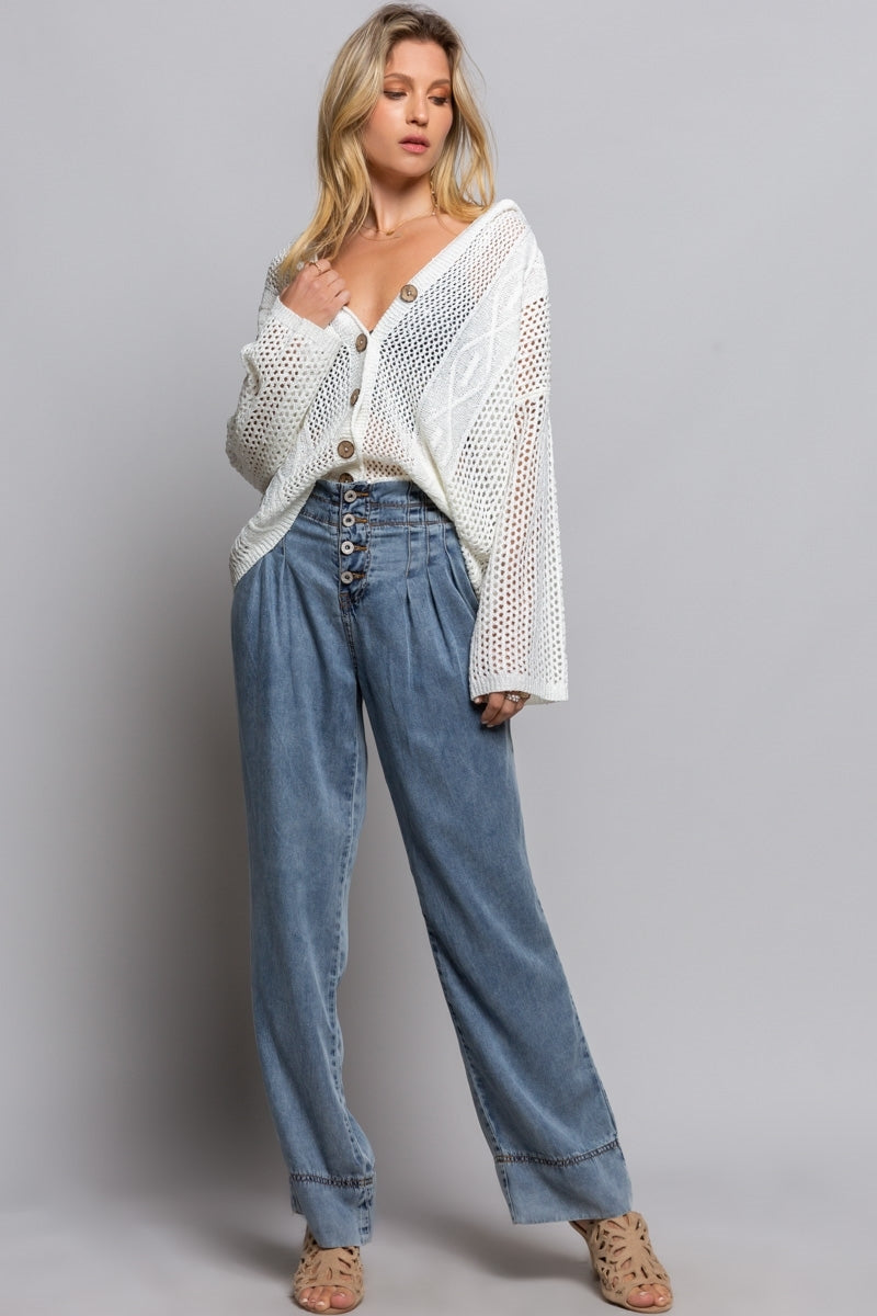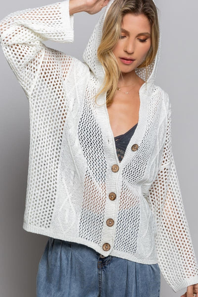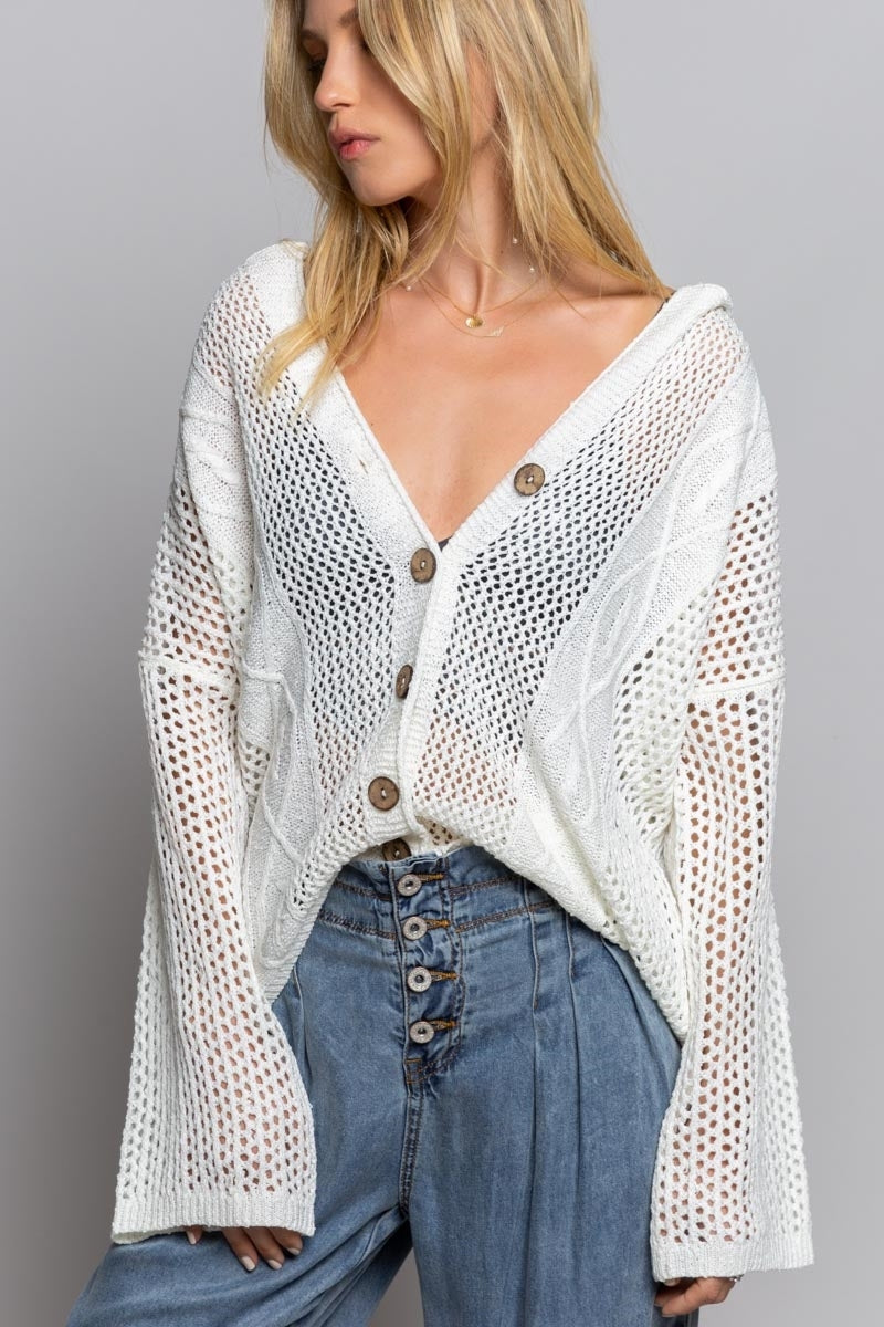 Lightweight open weave knitted sweater cardigan featuring cable knitting detail with open hole weave. Designed in a relaxed fit with wood buttonhole closure on front and finished with slightly wide sleeve