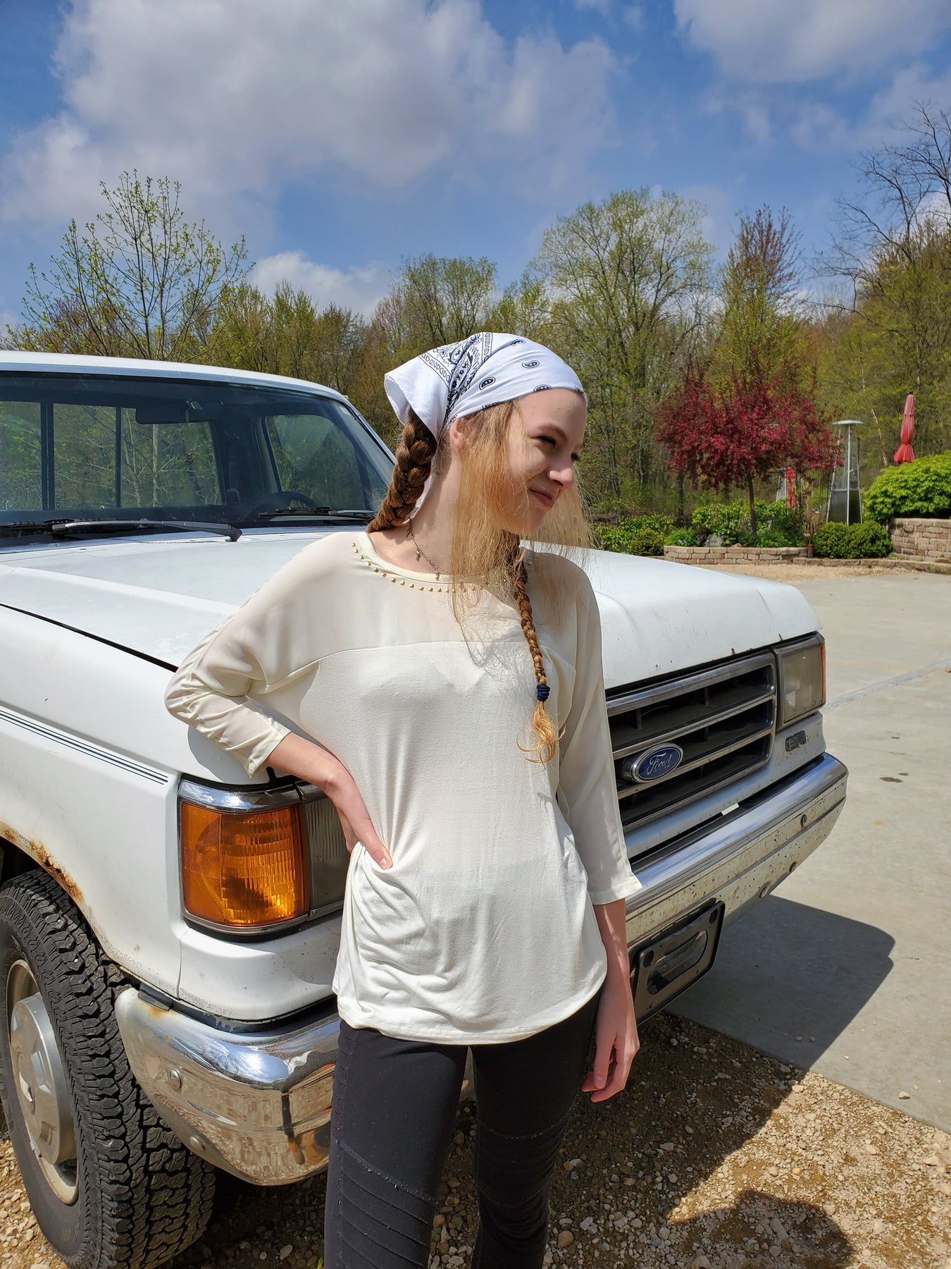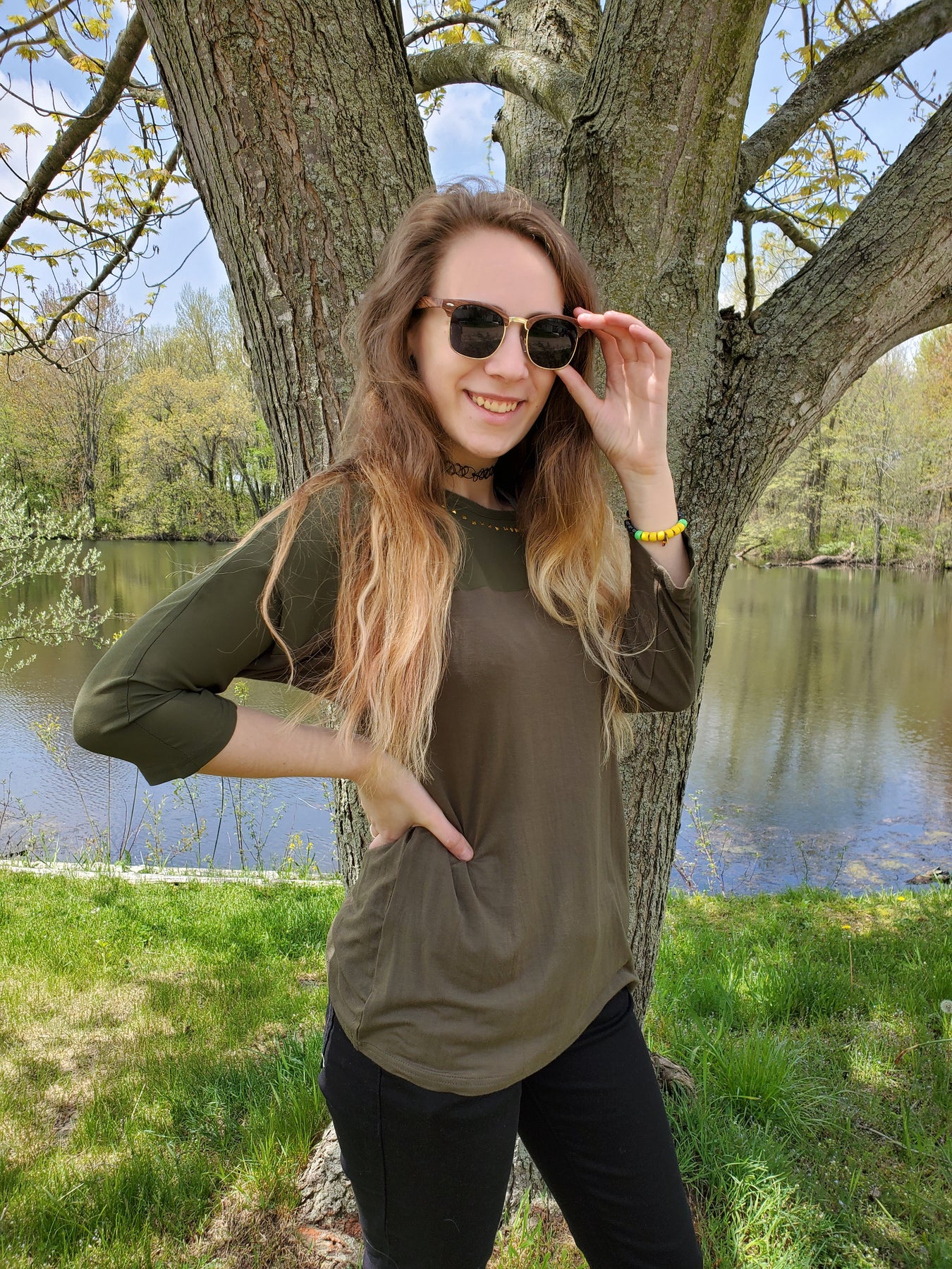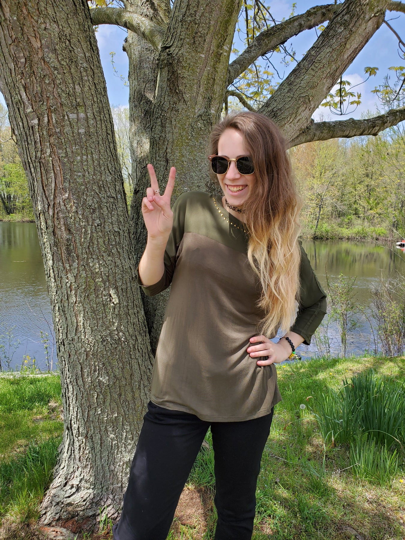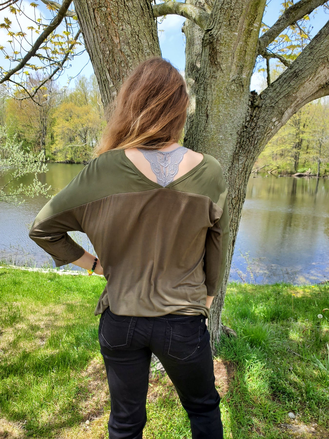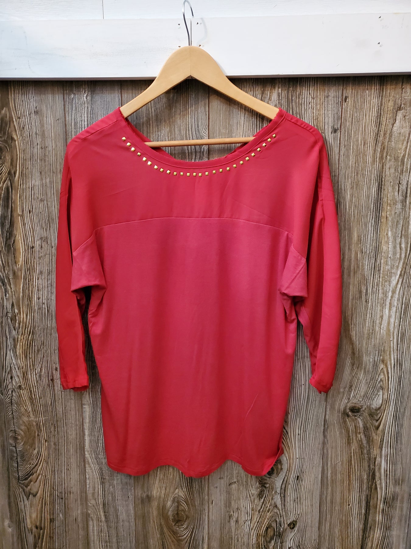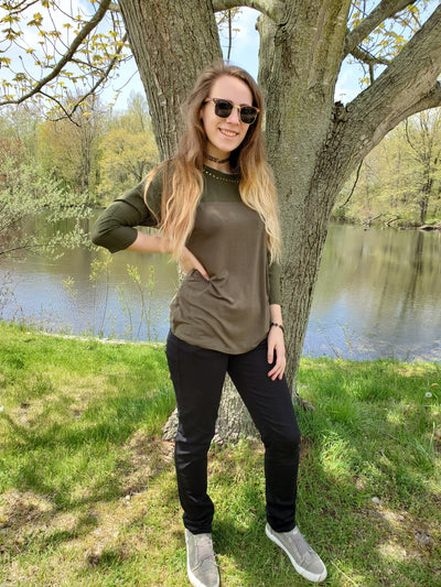 With people’s busy lifestyle nowadays going from one place straight to another is a must do and this top by HARVE' BENARD is perfect for these occasions. Casual to Dressy and back again ... yes, that's the ticket! She's a 3/4 sleeve “knit to woven” top. The top 1/4 of the body and sleeves are woven while the remaining part is knit. Rounded neckline in the front with gold embellishments while the back has a v-neckline. Straight loose fitting hemline adds comfort to this soft top.
