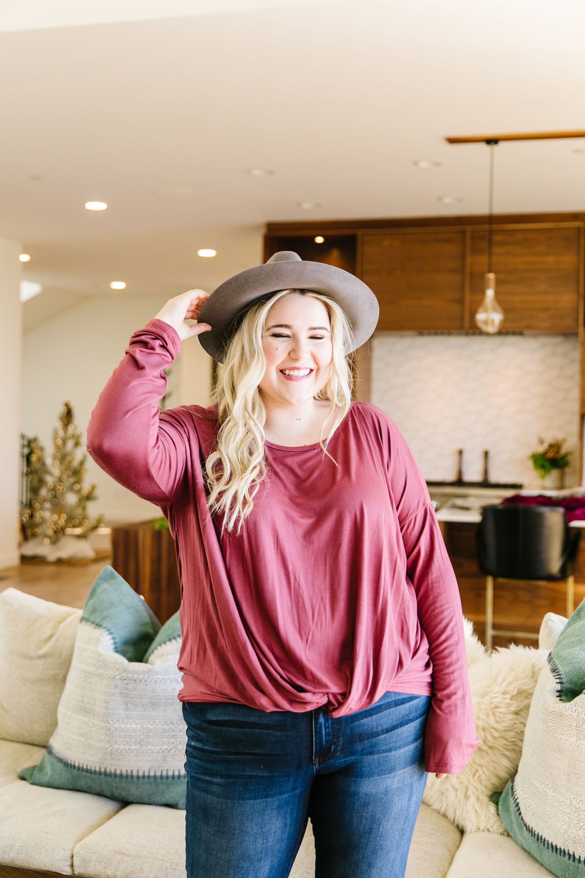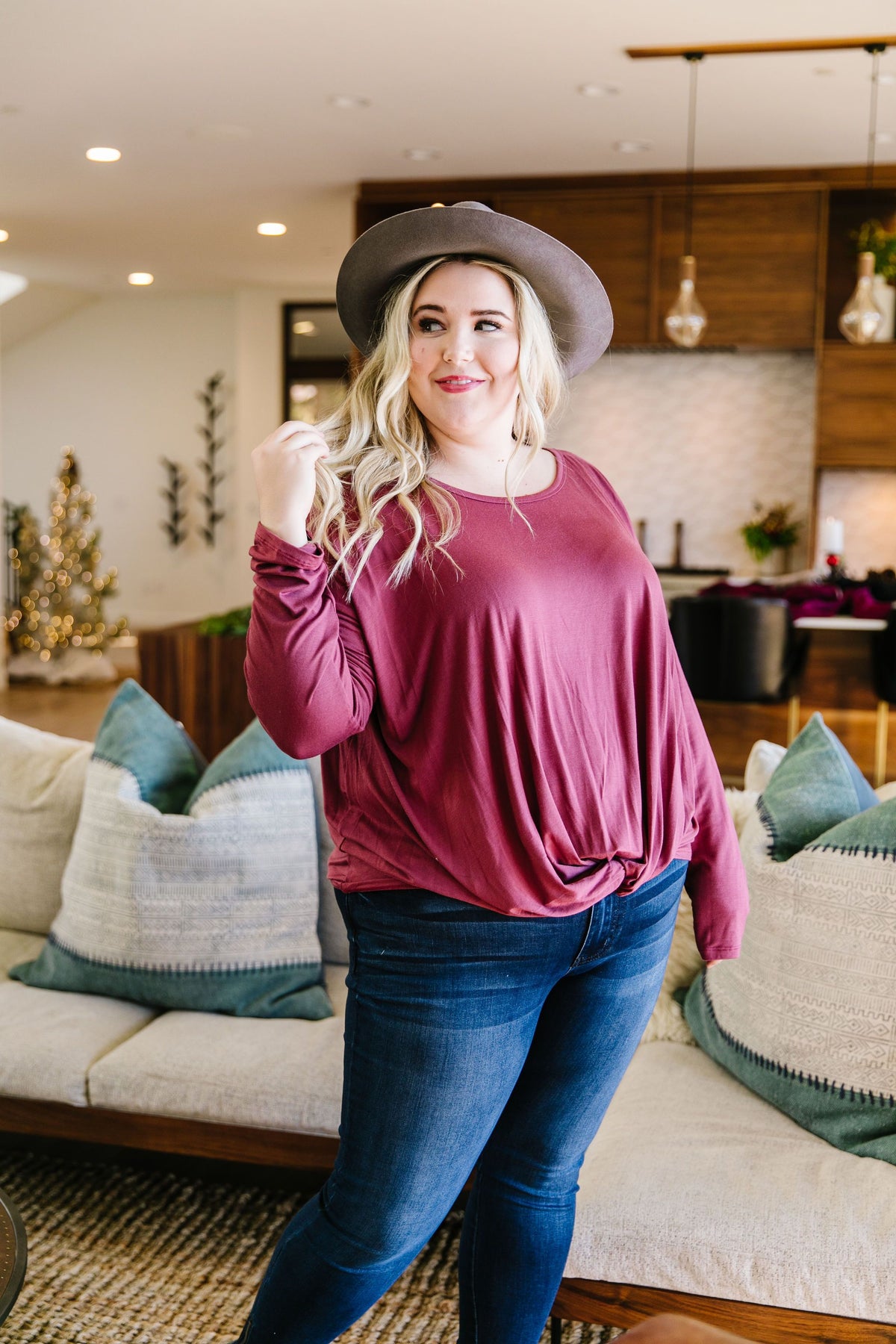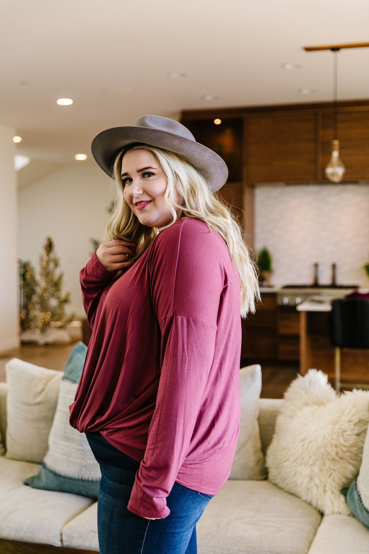 The twisty knot detail at the front hem of this faded red top will make you want to shout and jump for joy. The back, not wanting to be left behind, has a cut little keyhole cutout. The lightweight stretchy fabric is ideal for layering, and I think it looks phenomenal worn under a long open-front cardigan. We've got an abundance of lovely cardis to choose from. Ask me for recommendations!
