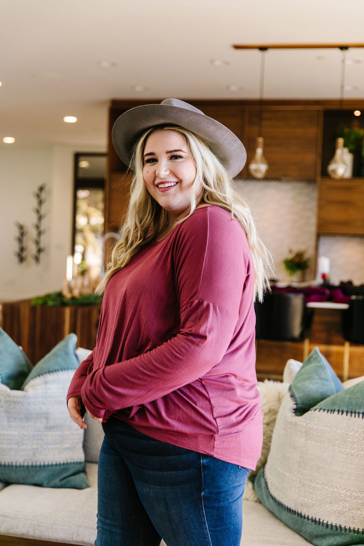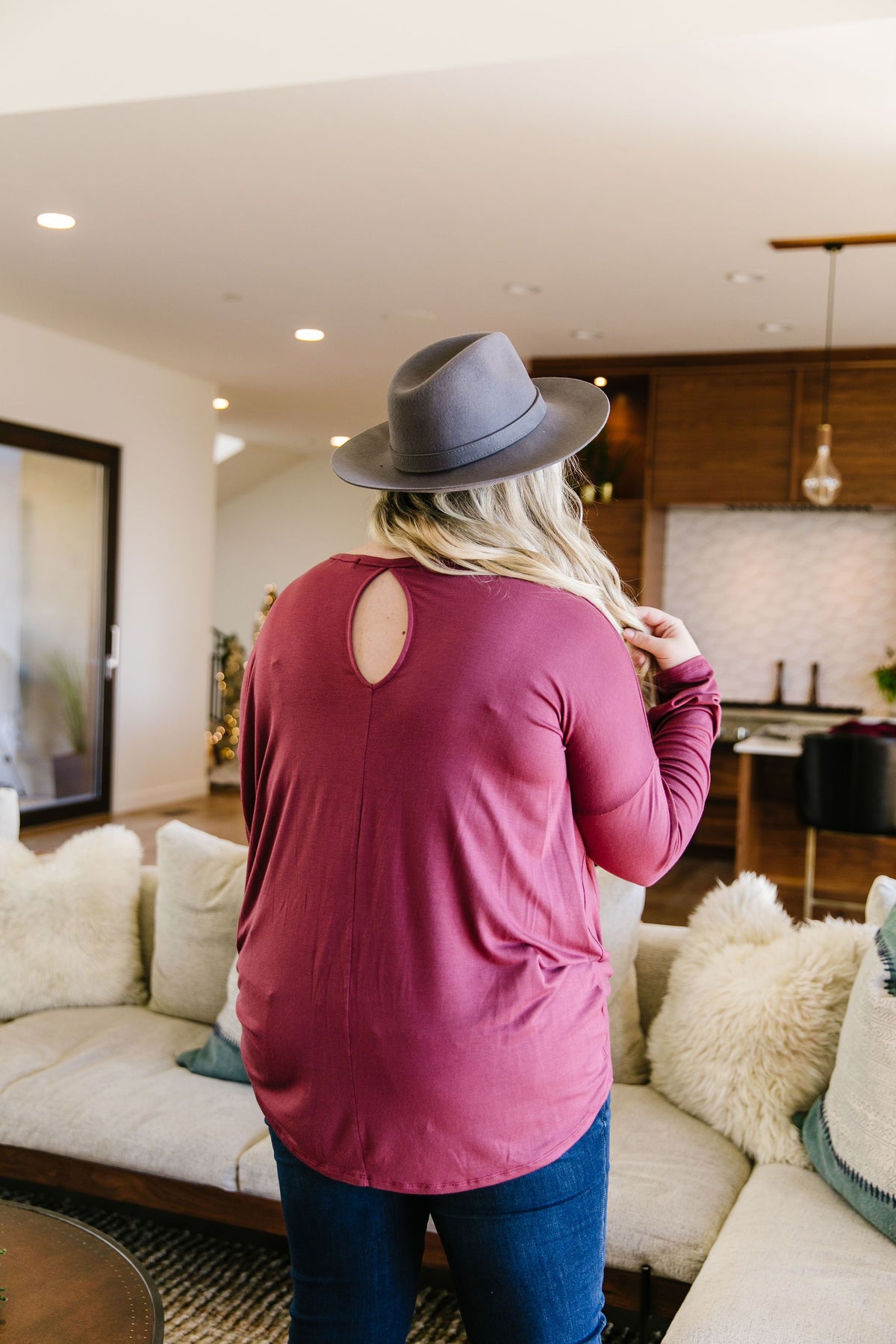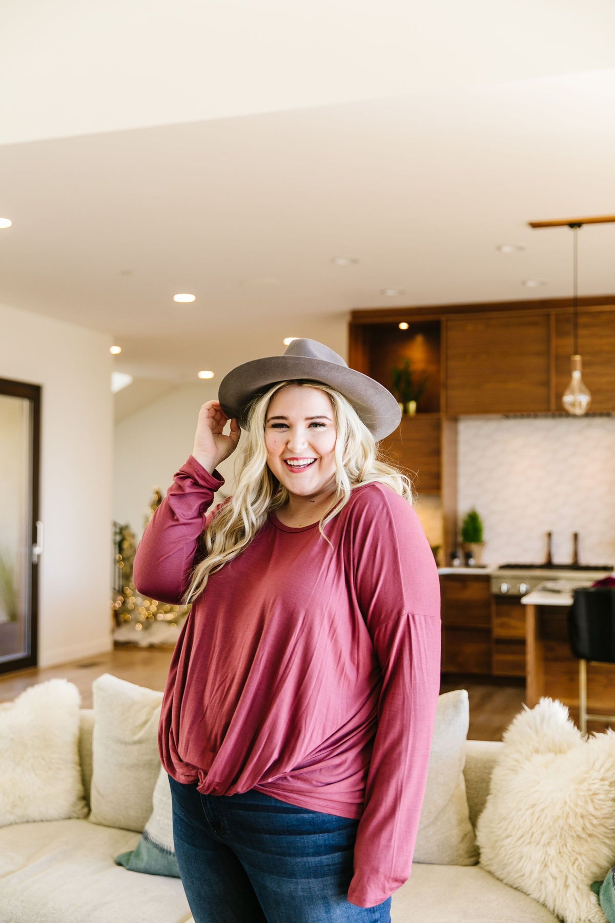 The twisty knot detail at the front hem of this faded red top will make you want to shout and jump for joy. The back, not wanting to be left behind, has a cut little keyhole cutout. The lightweight stretchy fabric is ideal for layering, and I think it looks phenomenal worn under a long open-front cardigan. We've got an abundance of lovely cardis to choose from. Ask me for recommendations!
