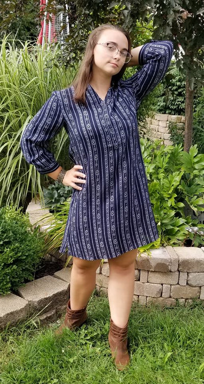 Vanessa by DEAR JOHN in Navy and white Viscose and Nylon ... this placket 3/4 sleeve shirt dress with it's retro tab collar and sassy side seam pockets will take you from late summer through the fall season effortlessly. Don't forget about the little side slits; they add just the right amount of pizzazz. AND, as if there needs to be something more, there's a tab in each sleeve to roll and button them up to elbow length.