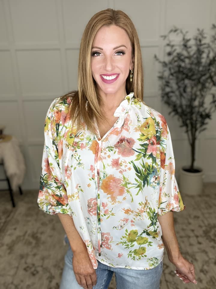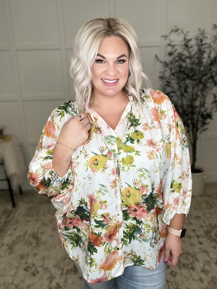 This charming top features a captivating watercolor floral print, v-neck, long sleeves, and a self-tie detail at the front. With a gathered yoke and comfortable fit, the flowy fit adds a touch of feminine appeal.